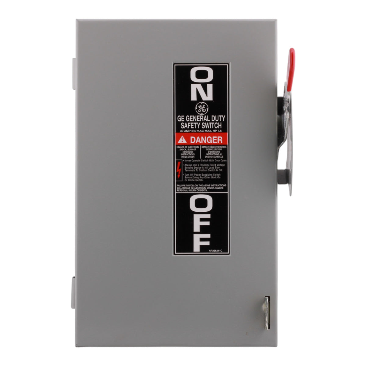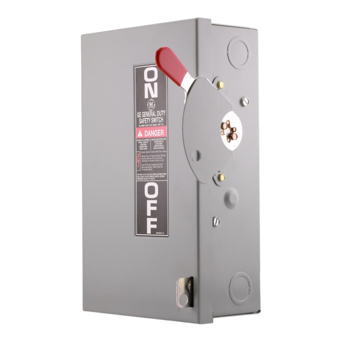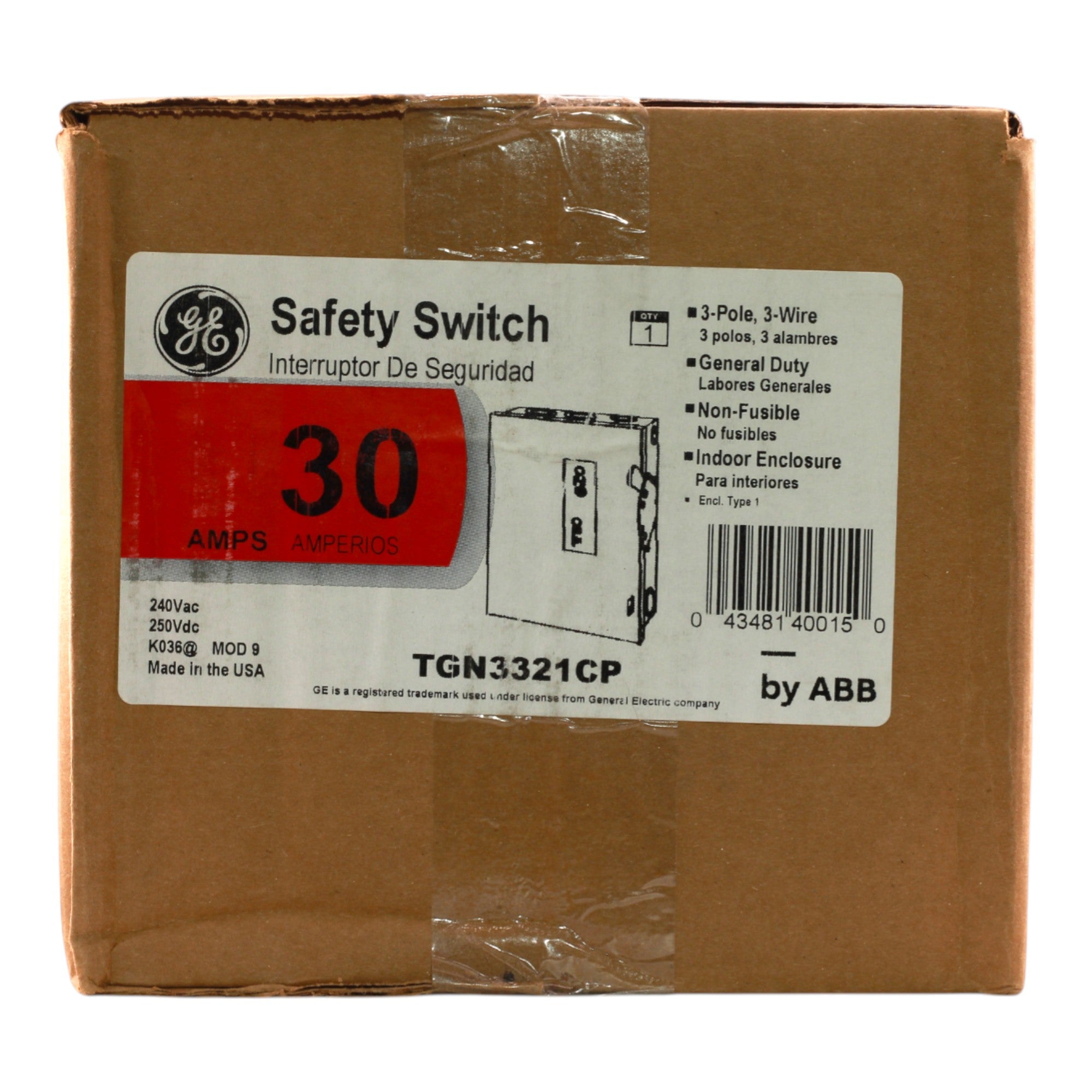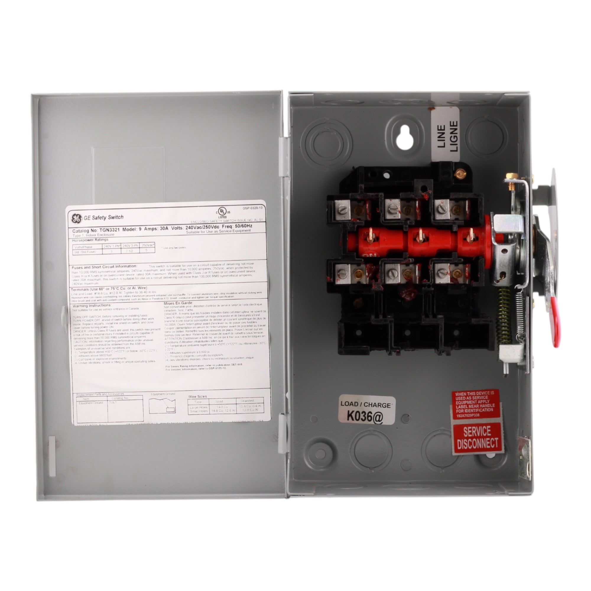 - Horsepower Rating: 3 HP (240 VAC 1-Phase), 7.5 HP (240 VAC 3-Phase), 5 HP (250 VDC) This ABB TGN3321 non-fusible general duty safety switch provides reliable 30A, 3-pole disconnection for 240V circuits in residential and light commercial applications. With NEMA 1 indoor enclosure and UL/cUL listing, it ensures safe isolation of electrical loads with horsepower ratings up to 7.5 HP for 3-phase operations.