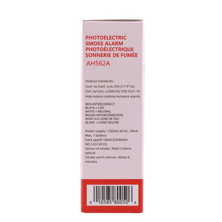 AH562-A: Hardwire Photoelectric Smoke Alarm, 120V AC, 9V battery backup, interconnectable up to 12 units, UL217 listed, ceiling or wall mount.