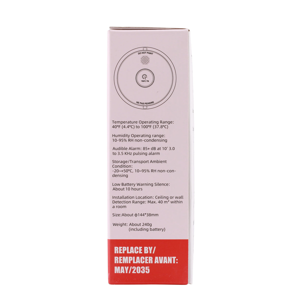 - Audible Alarm: > 85dB at 10 ft, 3.0–3.5 kHz pulsing alarm