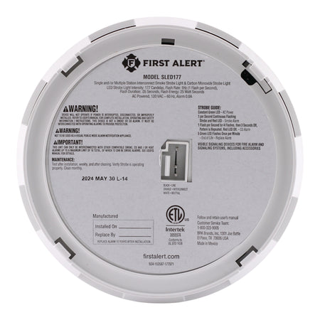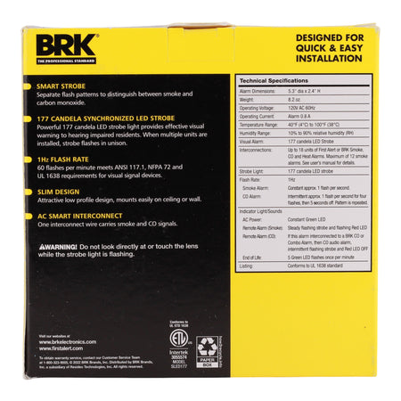 This BRK SLED177 hardwired LED strobe light provides 177 candela visual warning for hearing impaired residents in residential and institutional applications. With smart dual flash patterns for smoke and carbon monoxide detection, strobe synchronization capability, and compliance with ADA, UL 1638, and NFPA 72 standards, it ensures enhanced safety when interconnected with compatible smoke and CO alarms in loadcenters and living spaces.