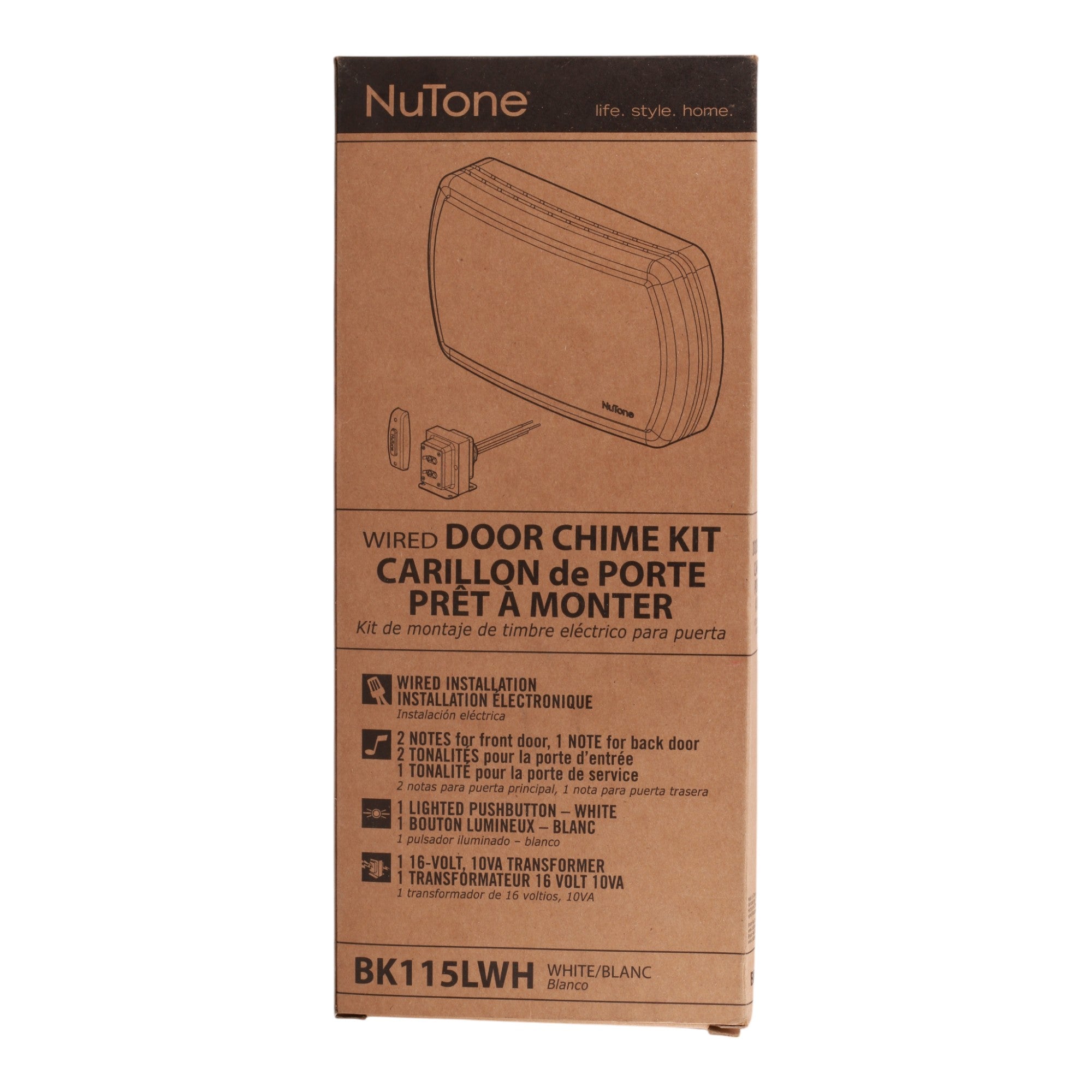 Broan-Nutone BK115LWH: White builder-grade wired doorbell kit with illuminated pushbutton, 16V transformer, two-note chime system.