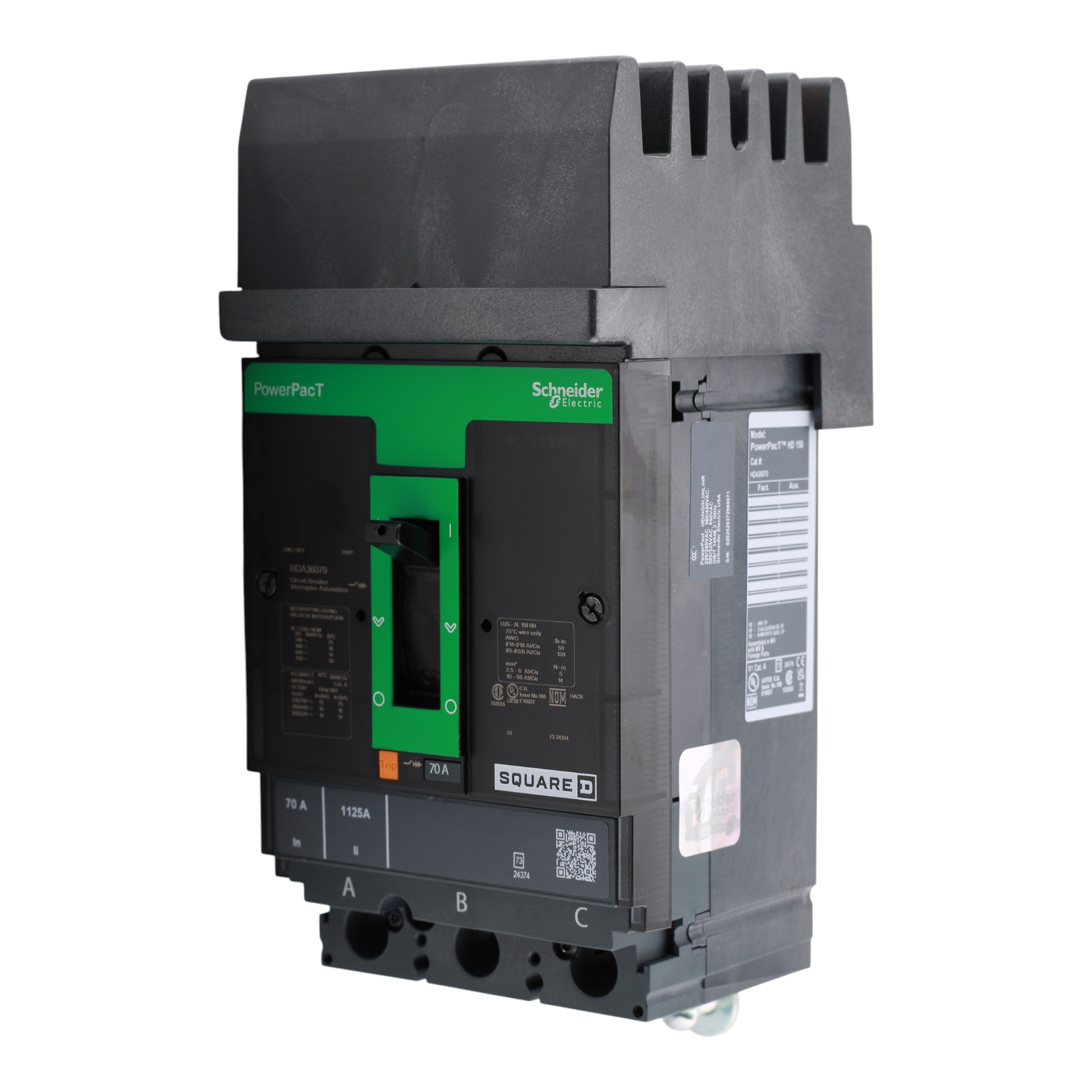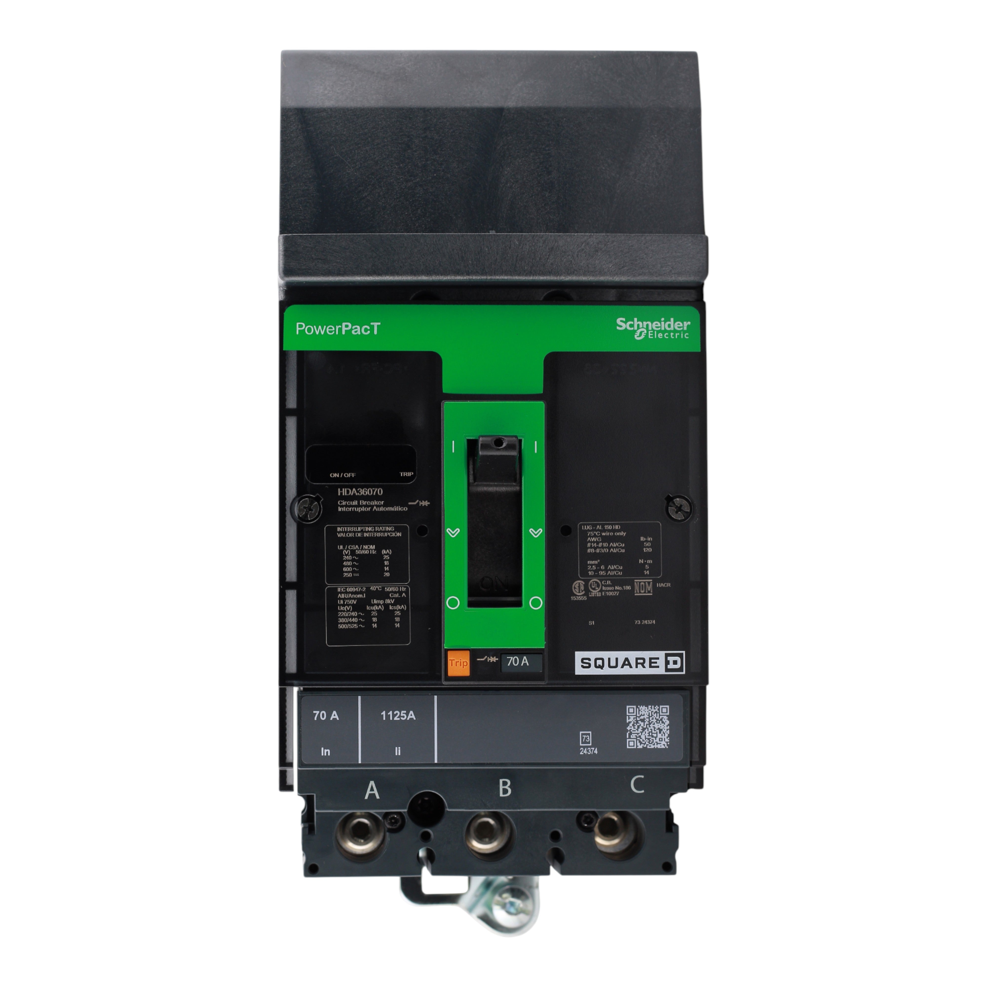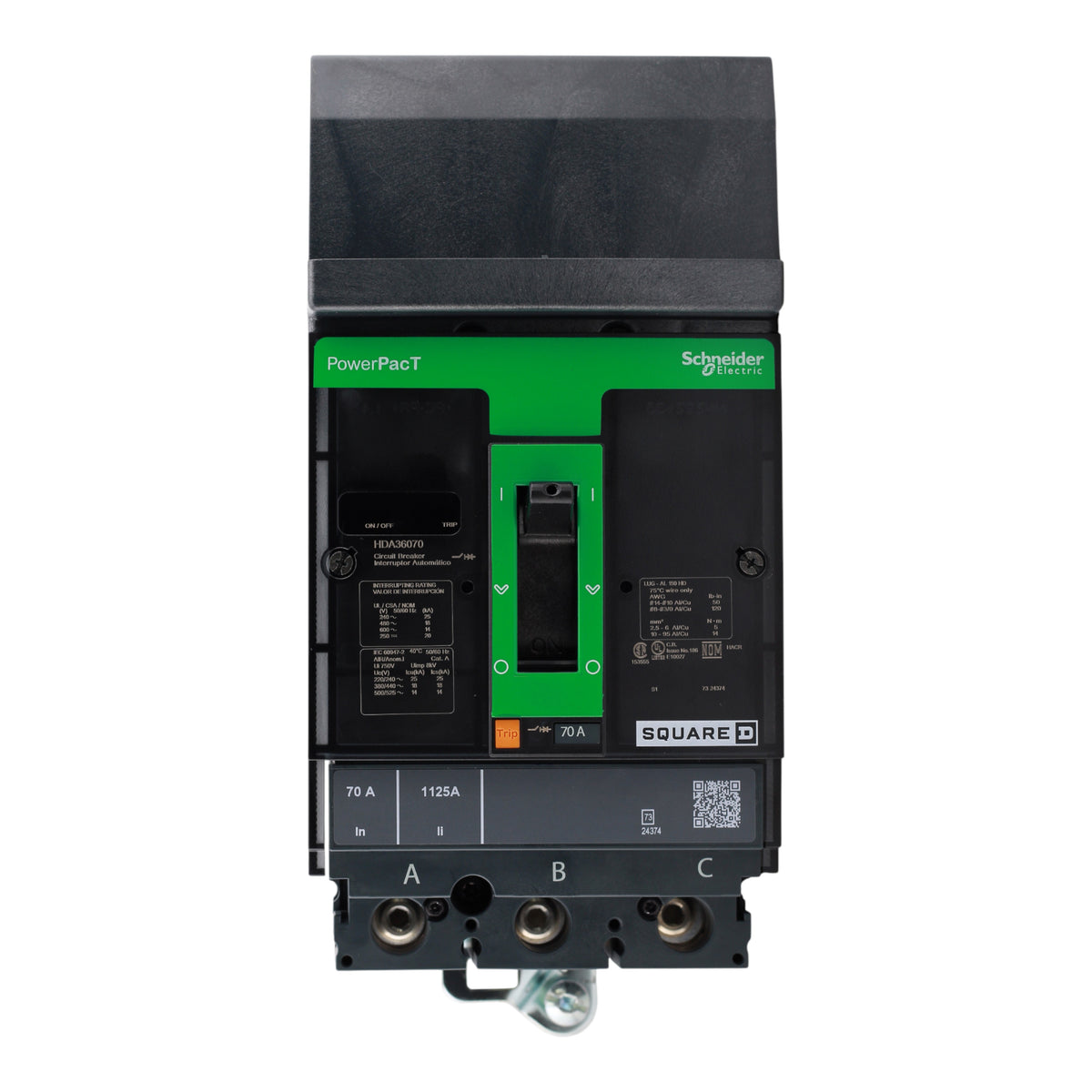 Square D HDA36070 Circuit breaker, PowerPacT H, 70A, 3 pole, 600VAC, 14kA, I-Line, thermal magnetic, 80%, ABC