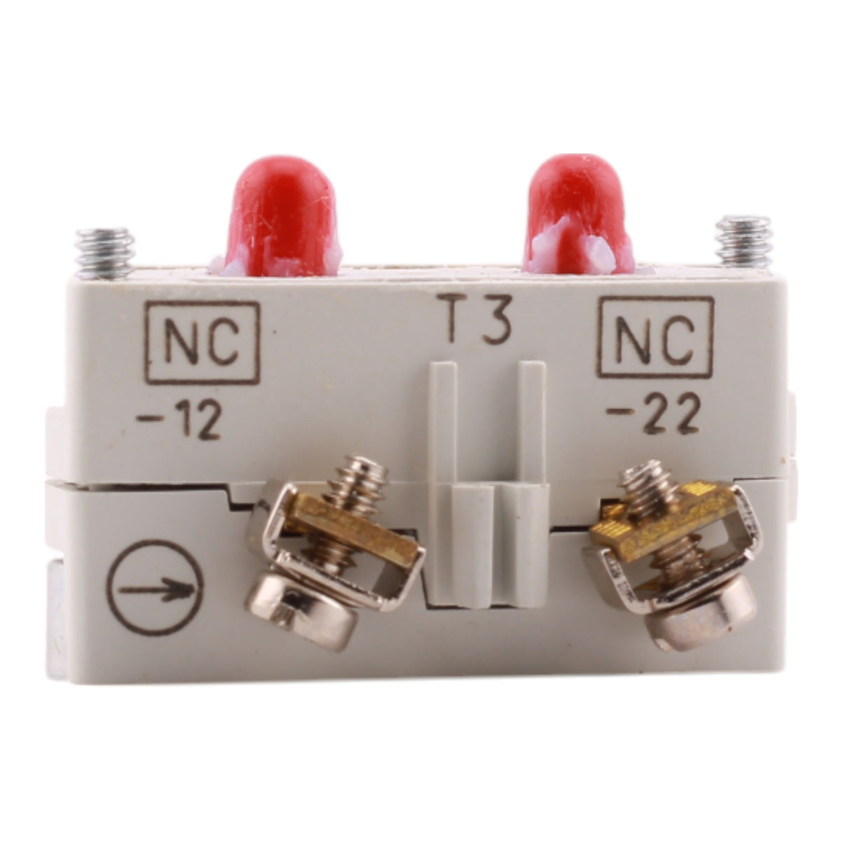 This Eaton 10250T3 heavy-duty pushbutton contact block provides reliable 2NC contact configuration for 30.5 mm 10250T series pushbutton assemblies. Designed for industrial applications, it features durable pressure terminals and stackable mounting for enhanced control system flexibility.