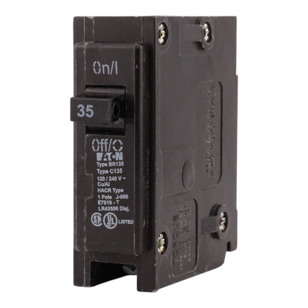 Eaton BR135: 35 Amp 1-Pole Thermal Magnetic Circuit Breaker, 120/240V, 10kA interrupt rating, plug-on mounting, Type BR loadcenters, UL 489 listed.