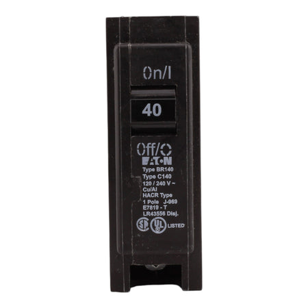Eaton BR140: 40 Amp 1-Pole Thermal Magnetic Circuit Breaker, 120/240V, 10kA interrupt rating, plug-on mounting, Type BR loadcenters, UL 489 listed.