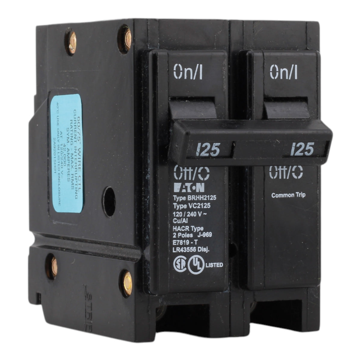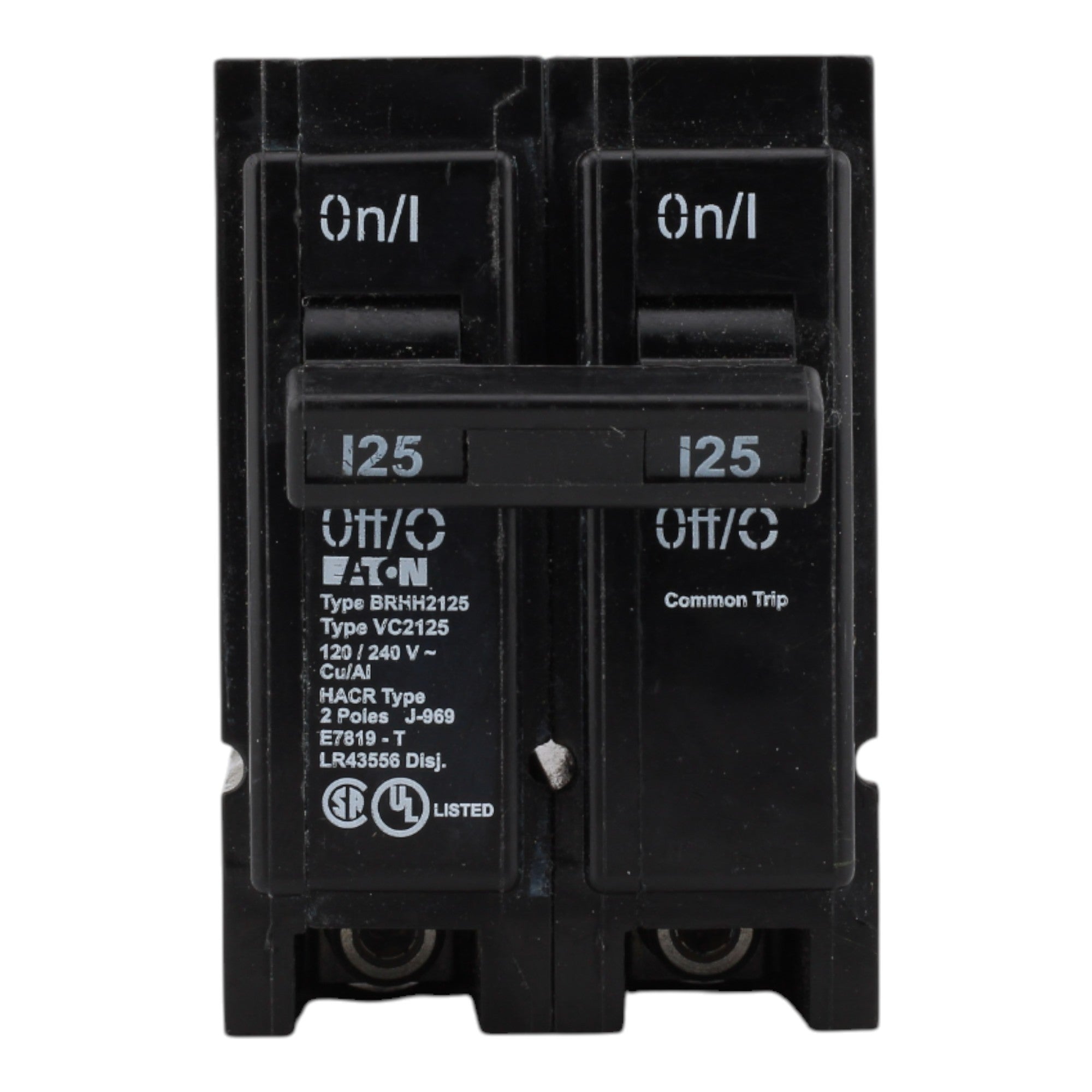 Eaton BRHH2125: 125A 2P circuit breaker, 120/240V, 42kA SCCR, plug-on mount for BR loadcenters, thermal-magnetic trip, BRH type, UL 490 listed, common trip, #4-2/0 wire compatible.