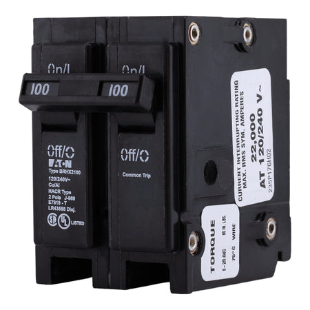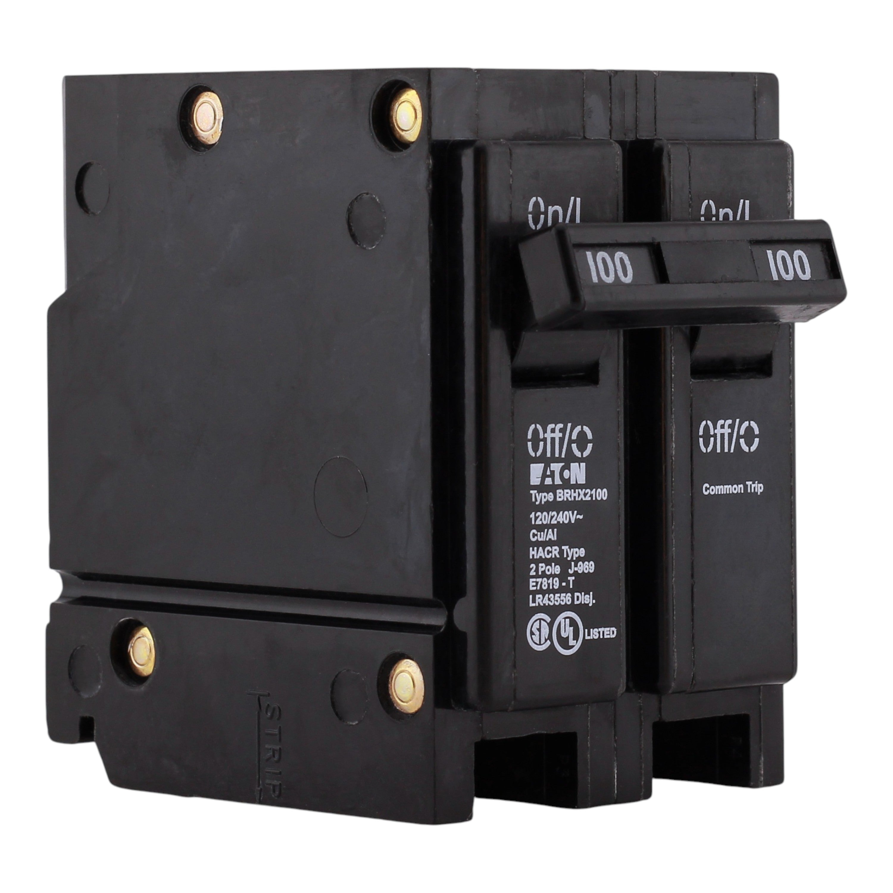 Eaton BRHX2100: 100 Amp 2-Pole Thermal Magnetic Circuit Breaker, 120/240V, 22kA Interrupt Rating, Type BRHX Quicklag, Plug-on Mounting, Non-Interchangeable Trip, UL Listed