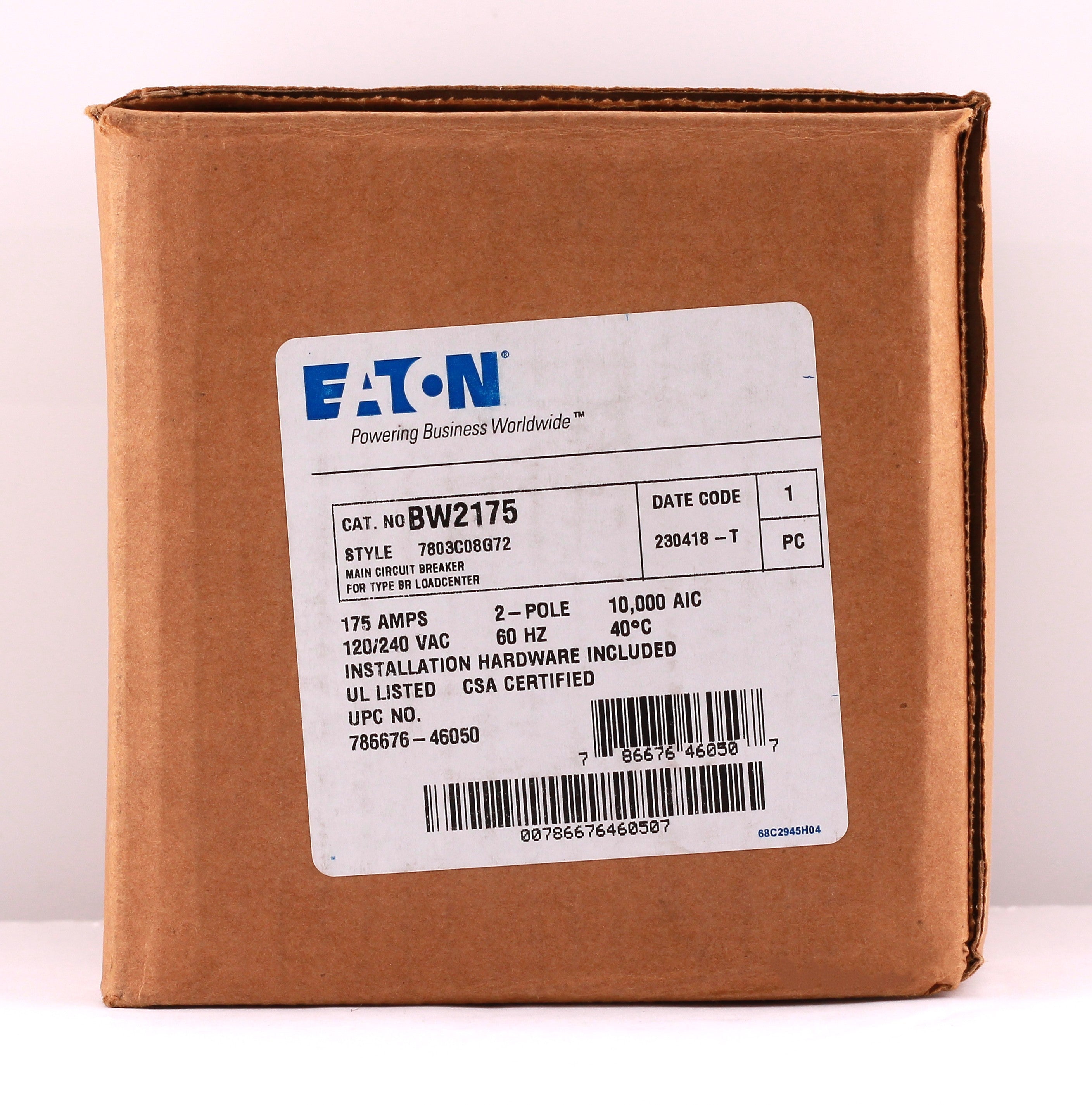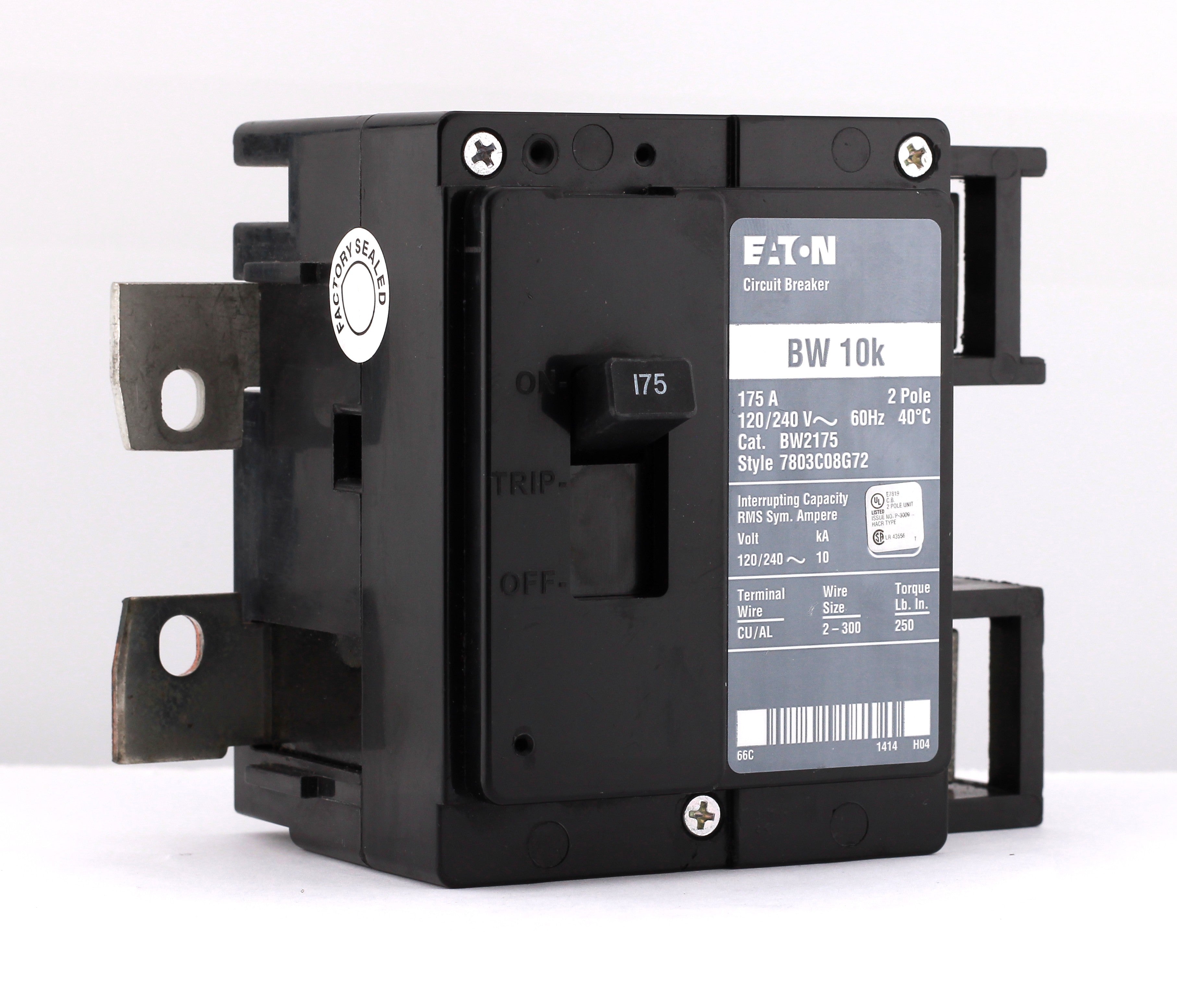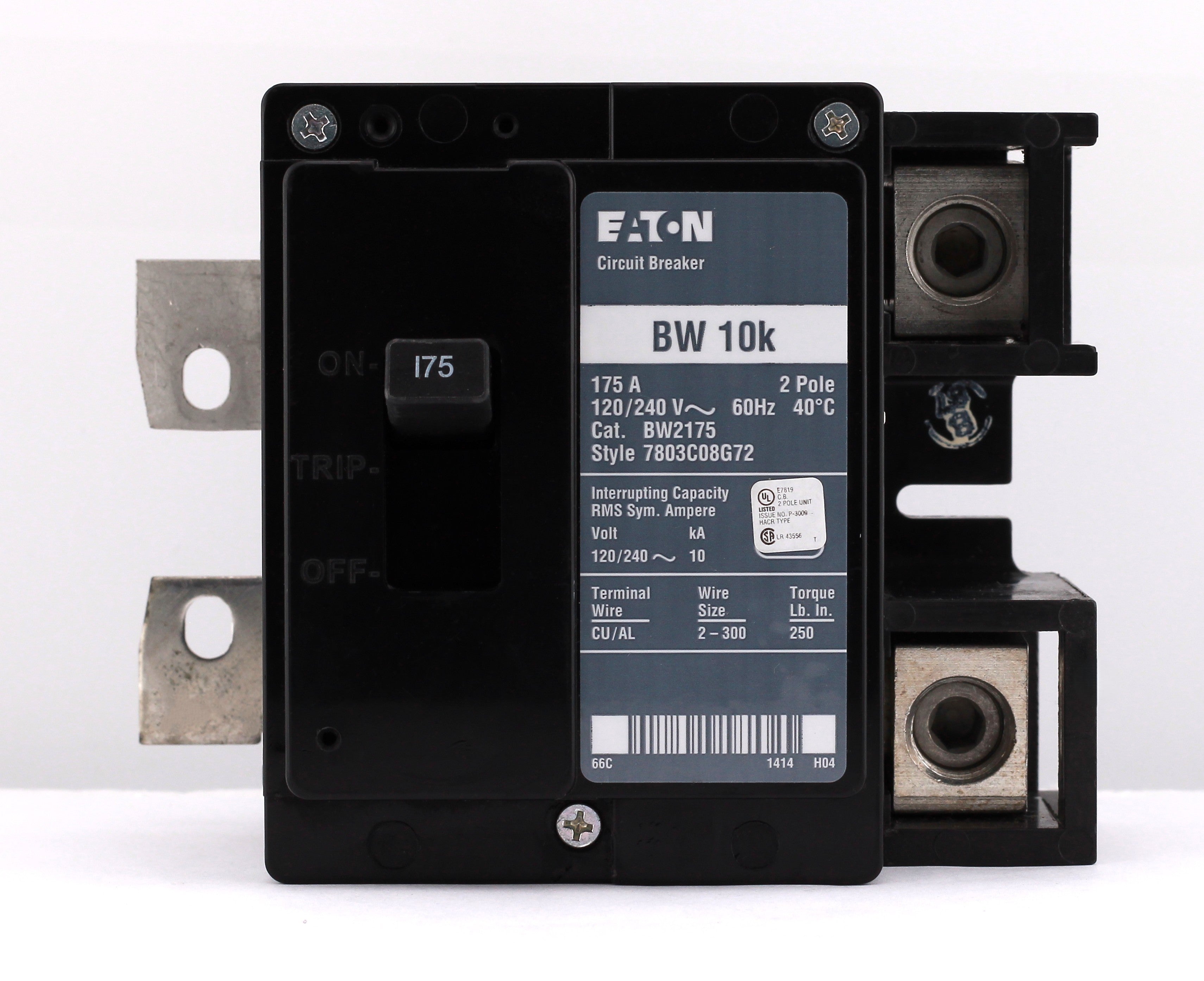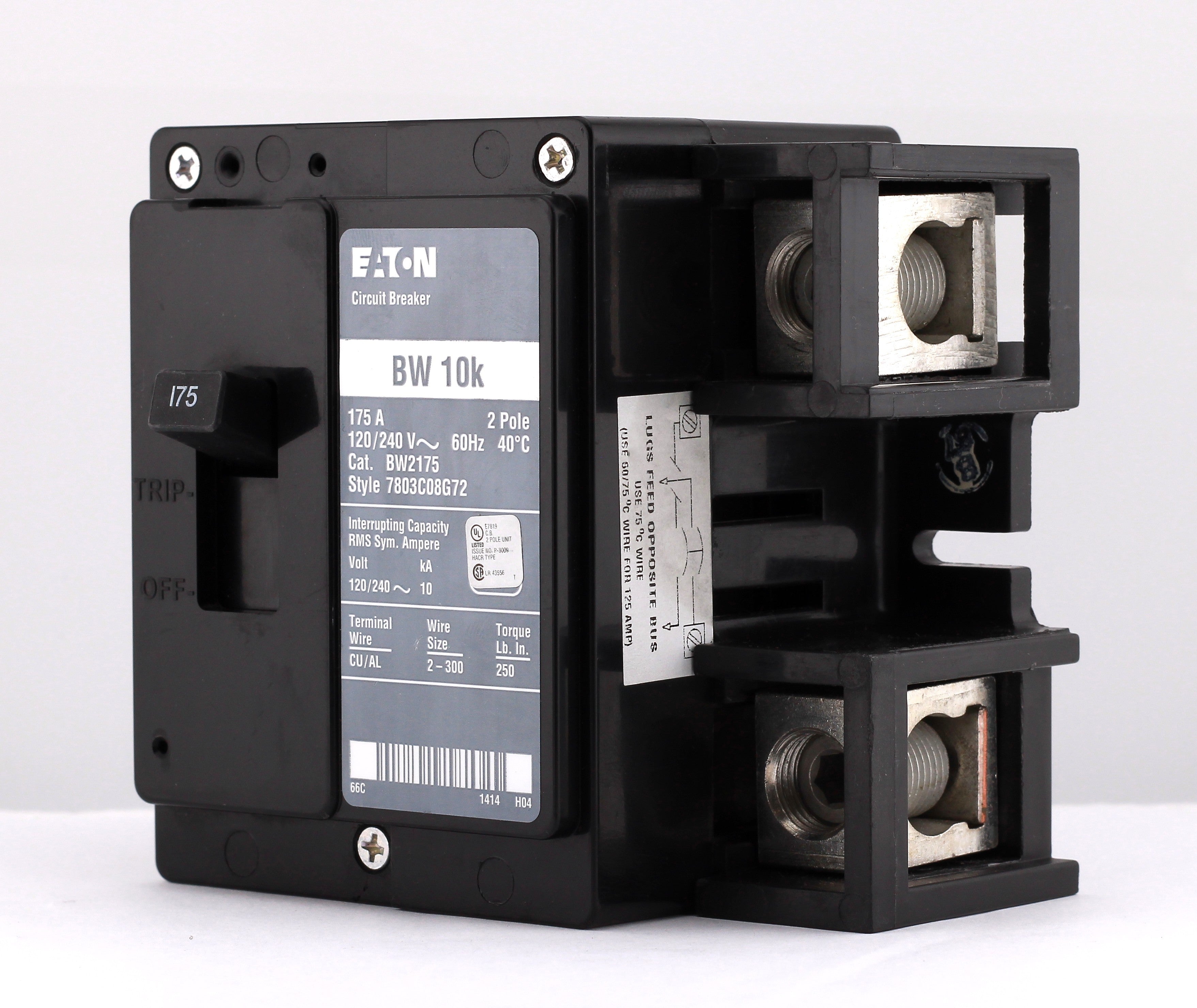 Eaton BW2175: 175 Amp 2-Pole main circuit breaker, 120/240V, 10kA, plug-on mounting, UL listed.