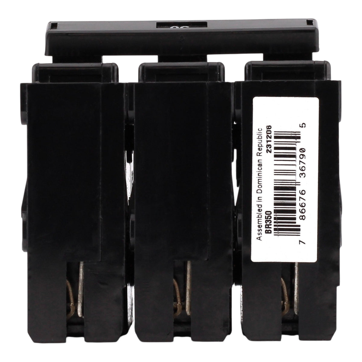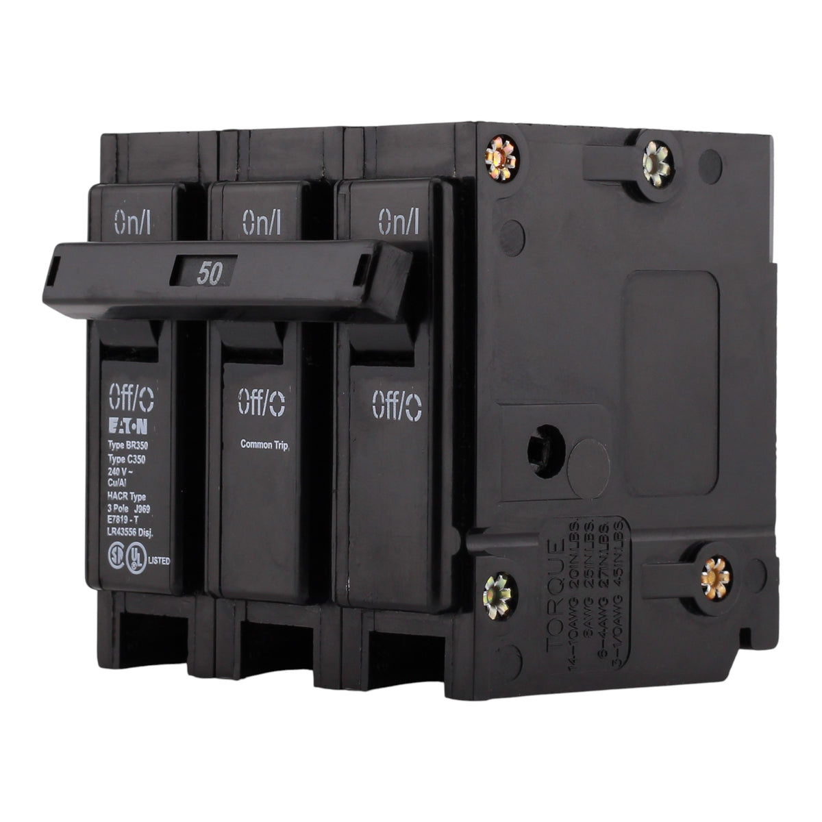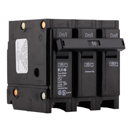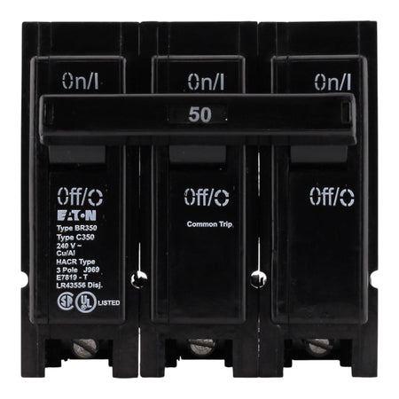 Eaton BR350: 50 Amp 3-Pole Thermal Magnetic Circuit Breaker, 240V, 10kA Interrupt Rating, Common Trip, Plug-On Mounting, Suitable for BR Loadcenters, UL Listed