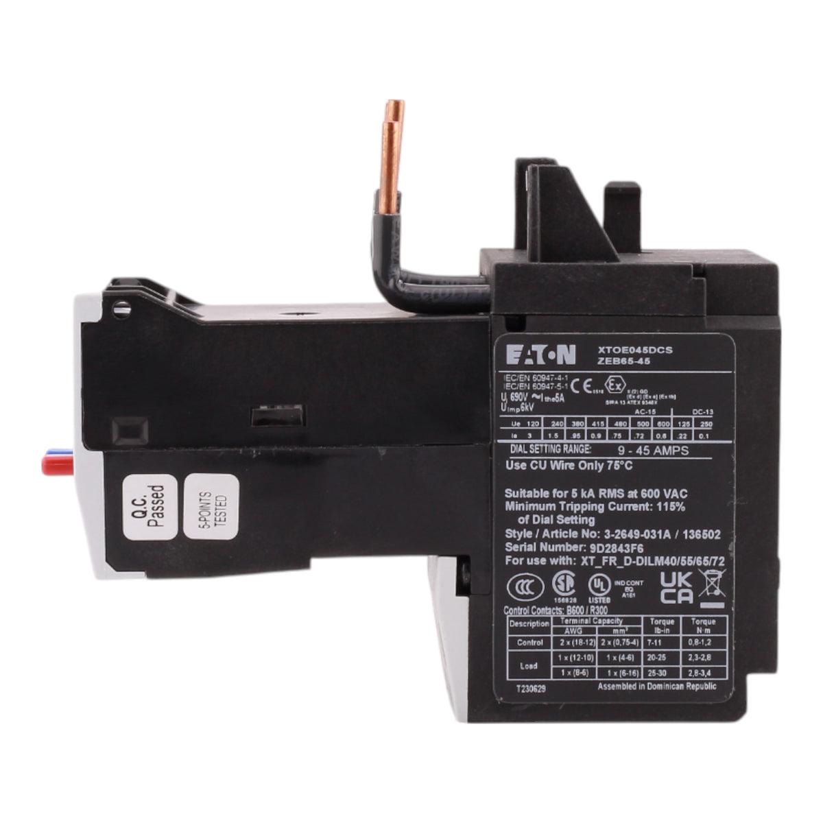 Eaton C440 XTOE045DCS: 9-45 Amp Electronic Overload Relay, 55 mm Frame, NO-NC Contacts, Direct Mount, Selectable 10A, Class 10, 20, 30 Trip