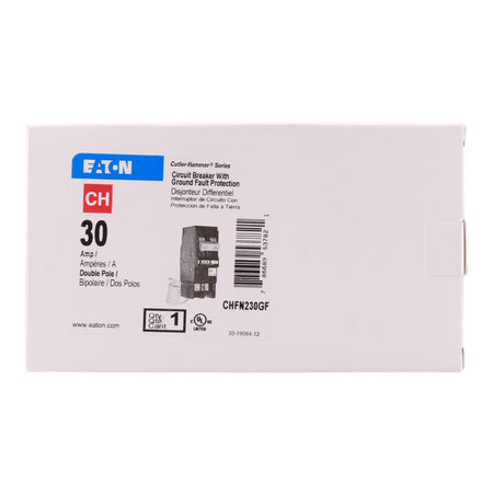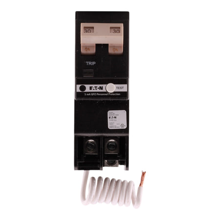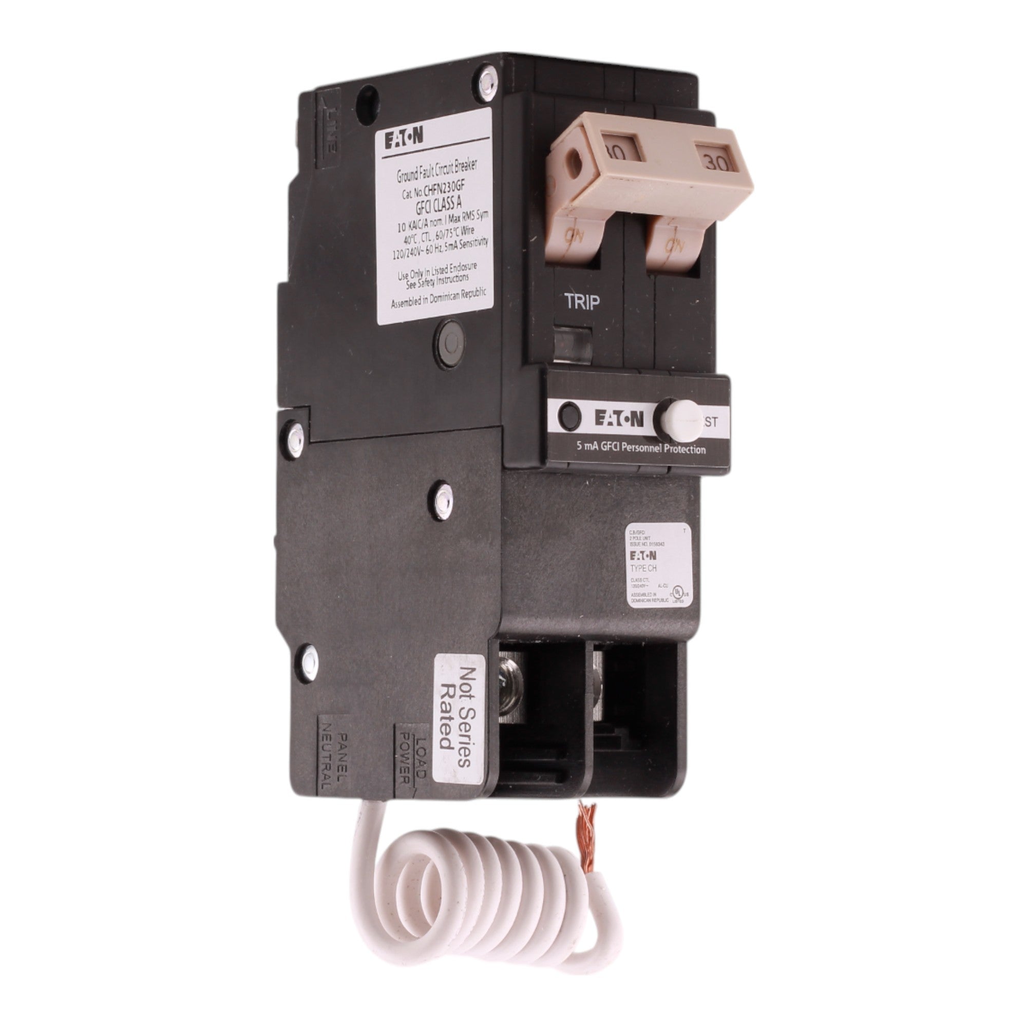 Eaton CHFN230GF: 30 Amp 2-Pole Ground-Fault Circuit Interrupter breaker, 120/240V, 10kA, pigtail neutral, 5mA trip sensitivity, UL listed.