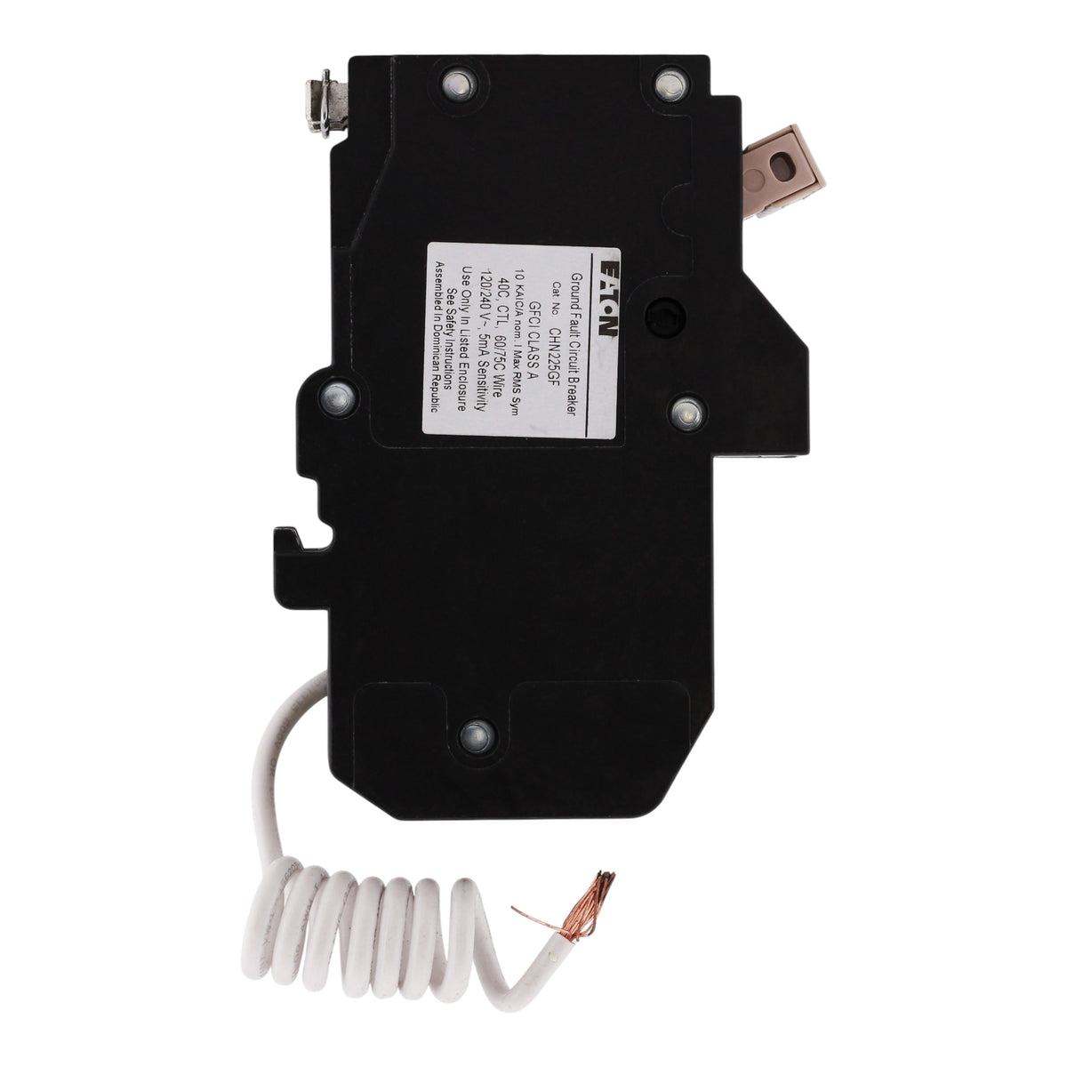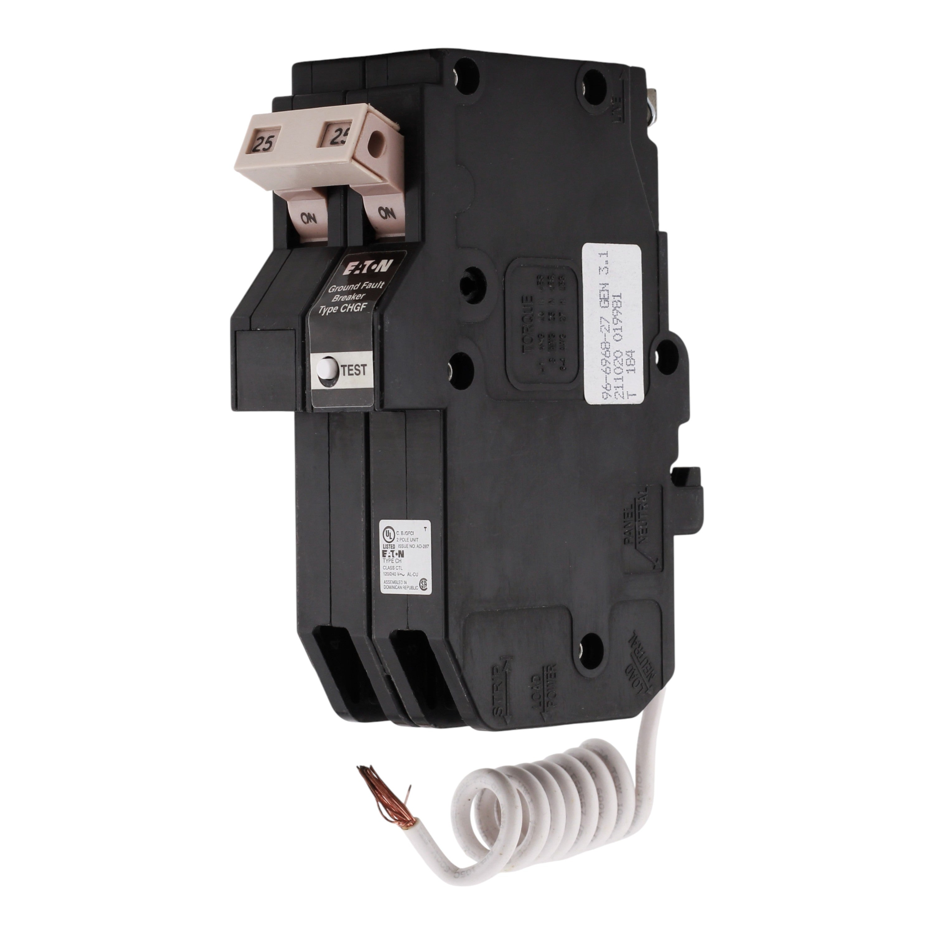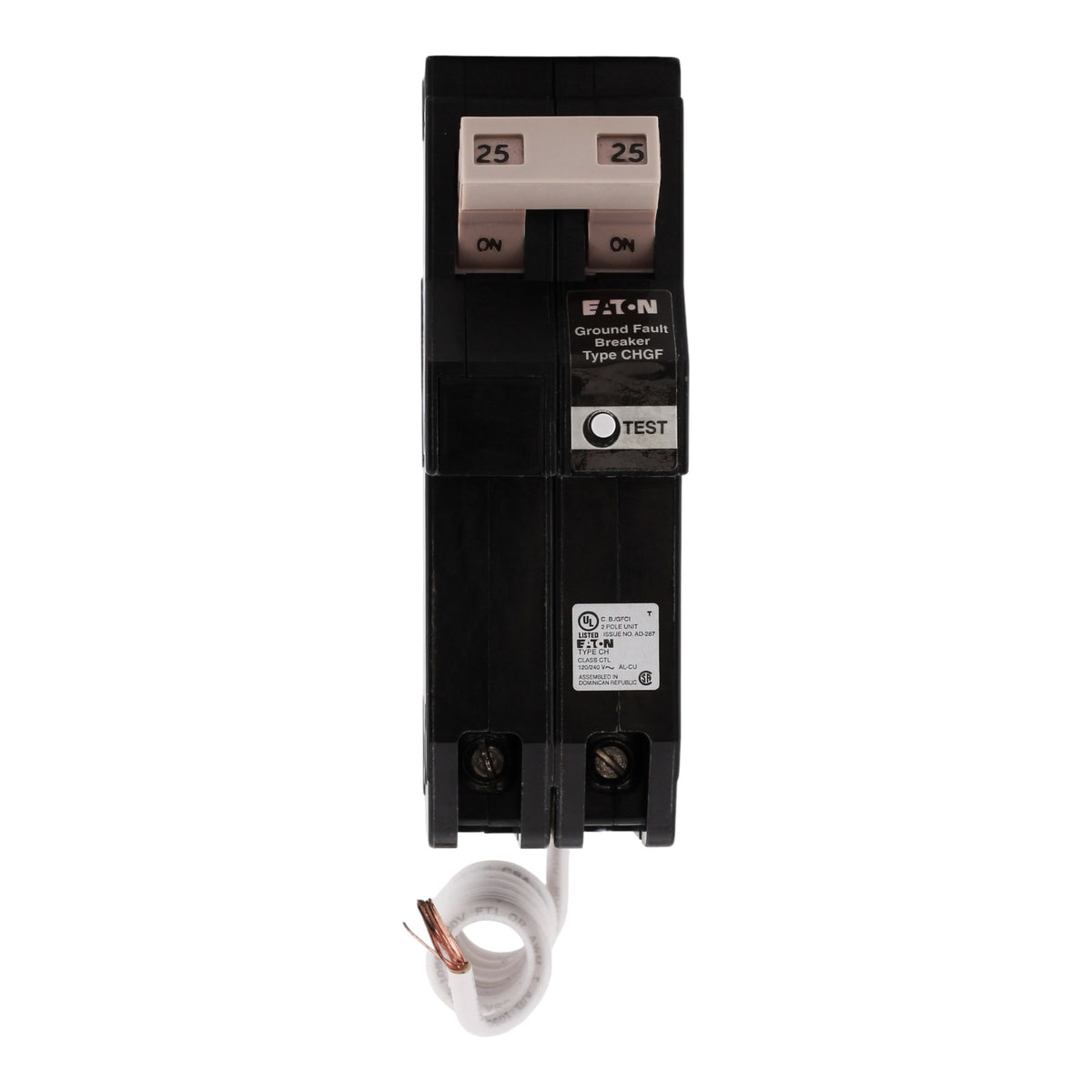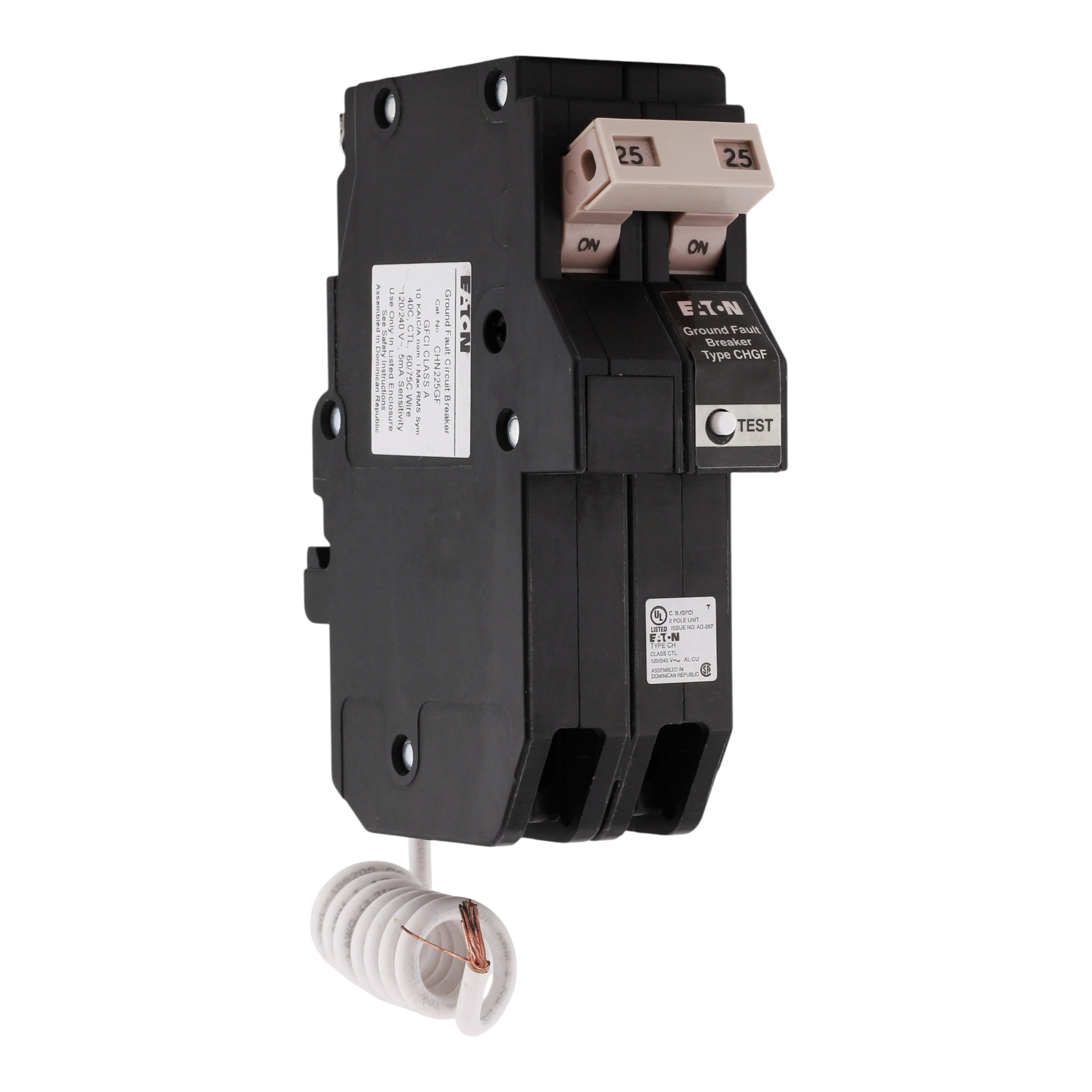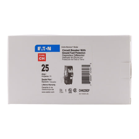 Eaton CHN225GF: 25 Amp 2-Pole GFCI Ground Fault Circuit Interrupter breaker, 120/240V, 10kA, common trip, 5mA trip sensitivity, UL 489 listed.