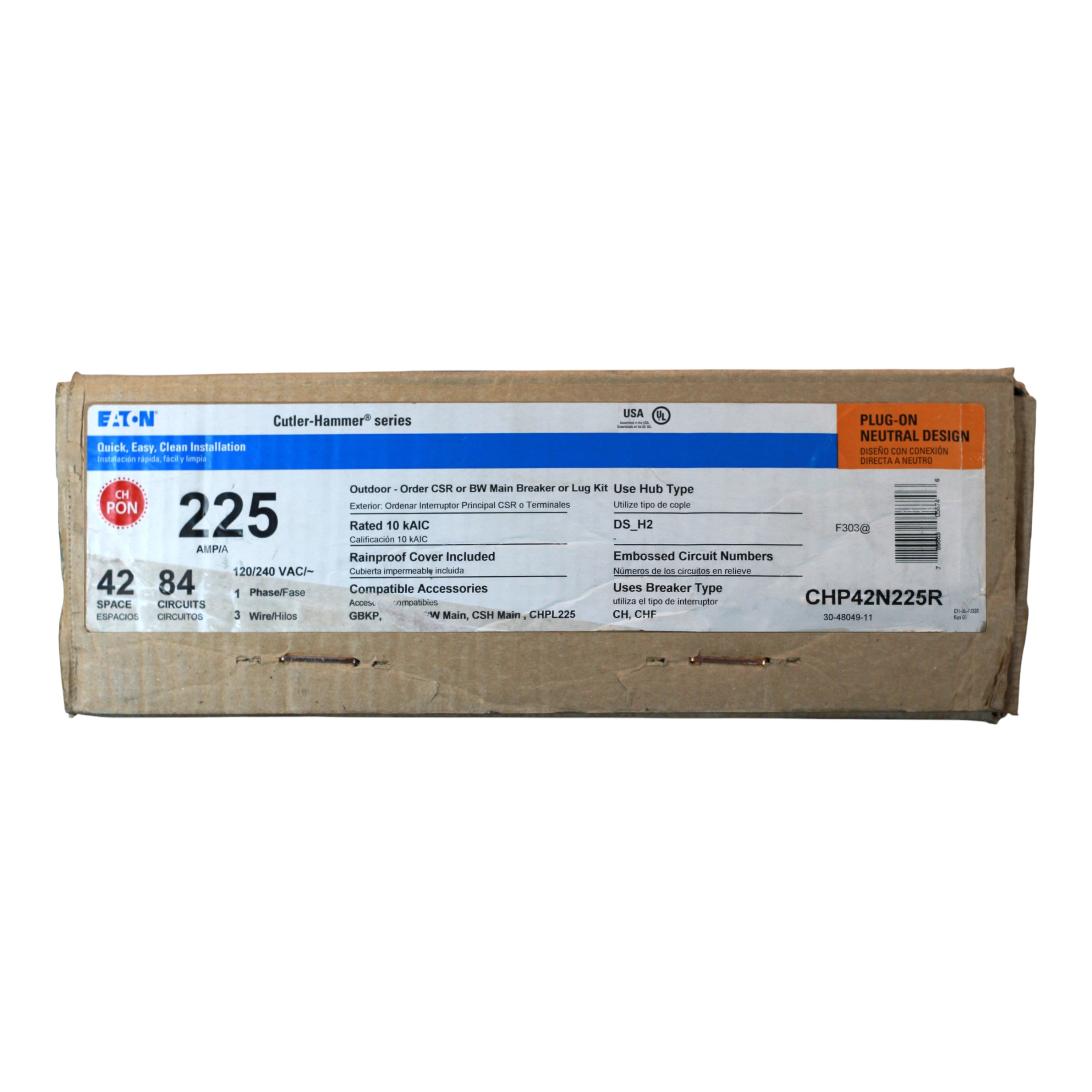 Eaton CHP42N225R: 225 Amp, 42-space, convertible plug-on neutral loadcenter, 120/240V, single-phase, NEMA 3R rainproof enclosure, 10kA, UL listed.