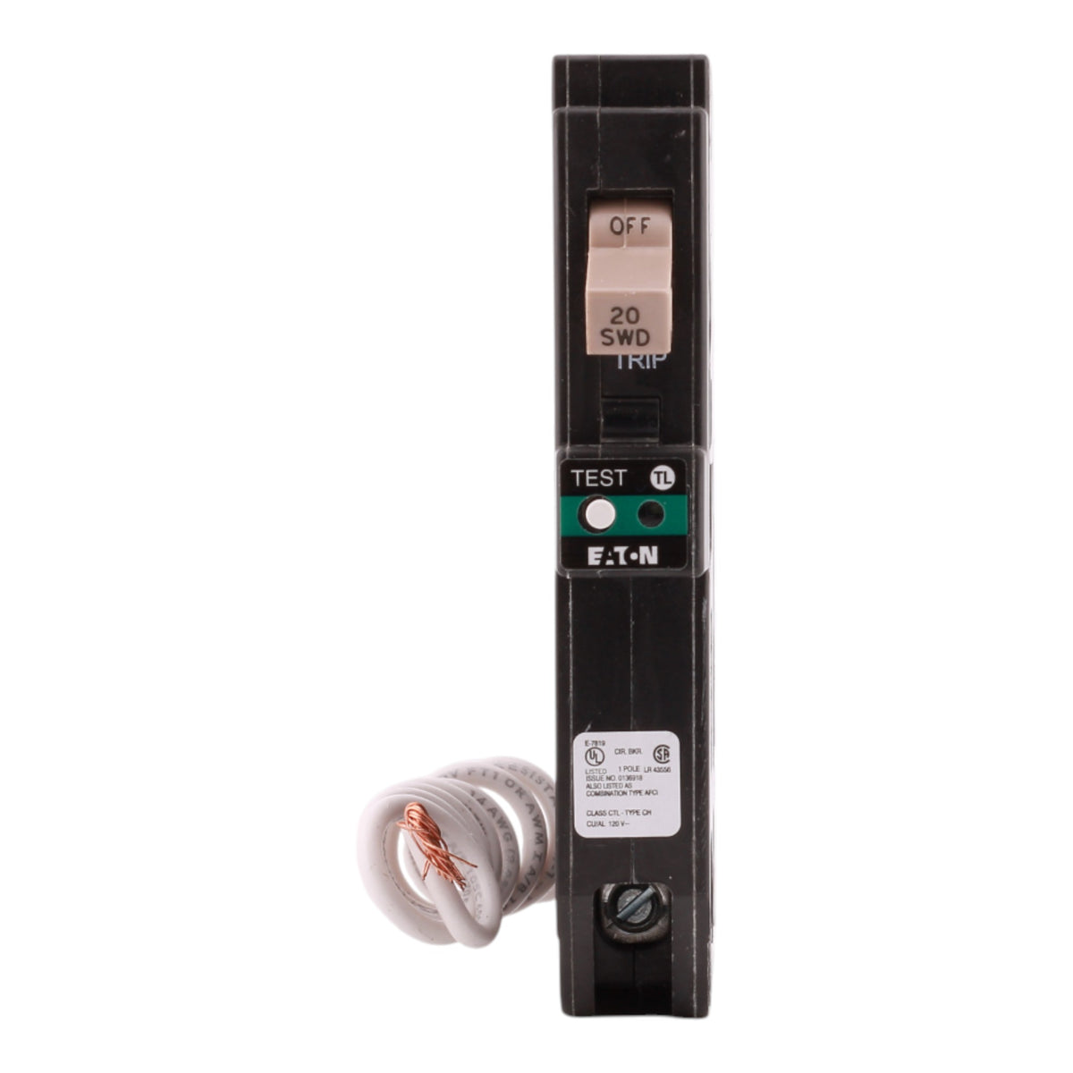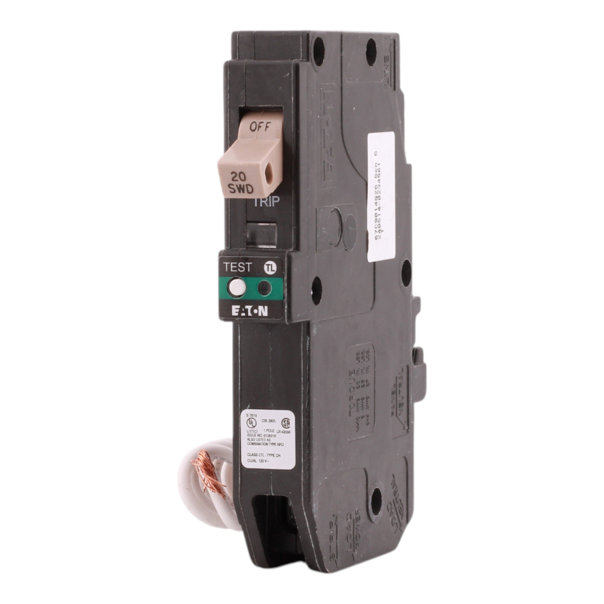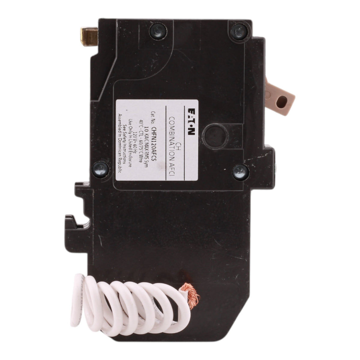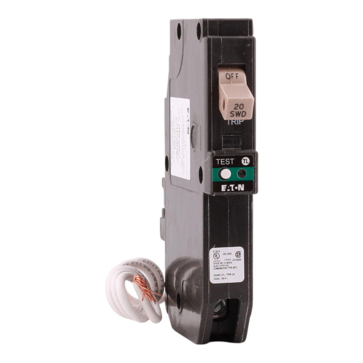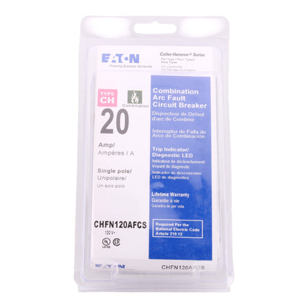 Eaton CHFN120AFCS: 20A 1P combination AFCI breaker, 120/240V, 10kAIC rating, 3/4" width with trip flag and trip-to-OFF handle, pigtail neutral connection, for CH loadcenters, clamshell pack.