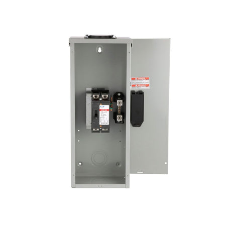 Eaton ECCVH150R: 150 Amp 2-Pole enclosed molded case circuit breaker, 240V, 25kA interrupt rating, NEMA 3R rainproof enclosure, includes CCVH2150 breaker, UL 489 listed.