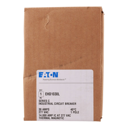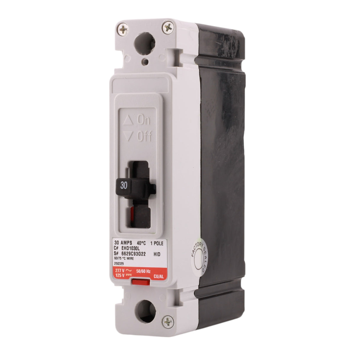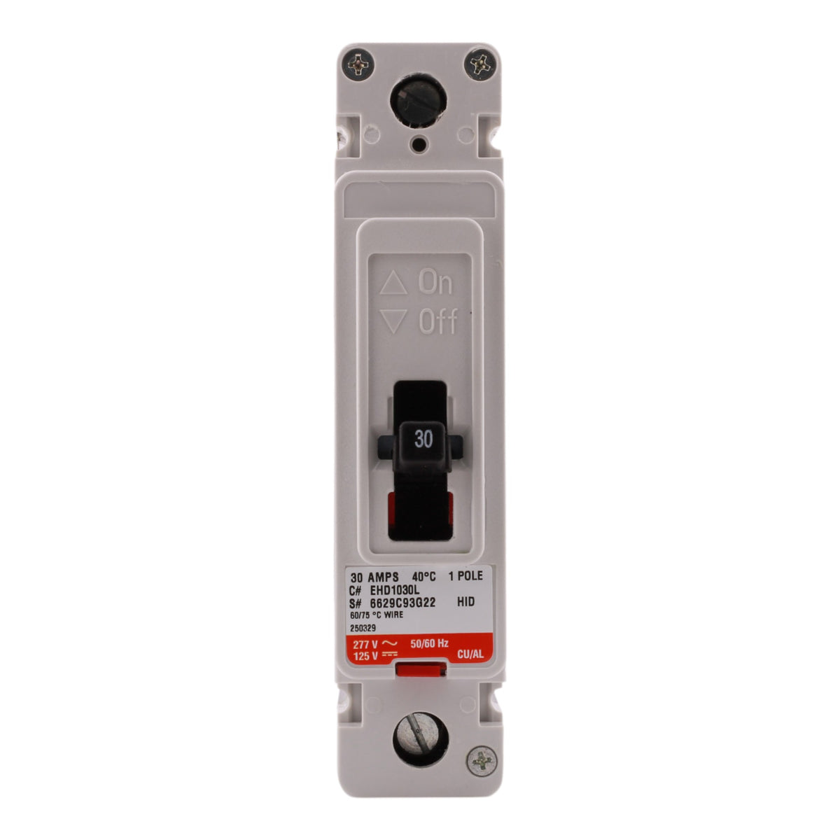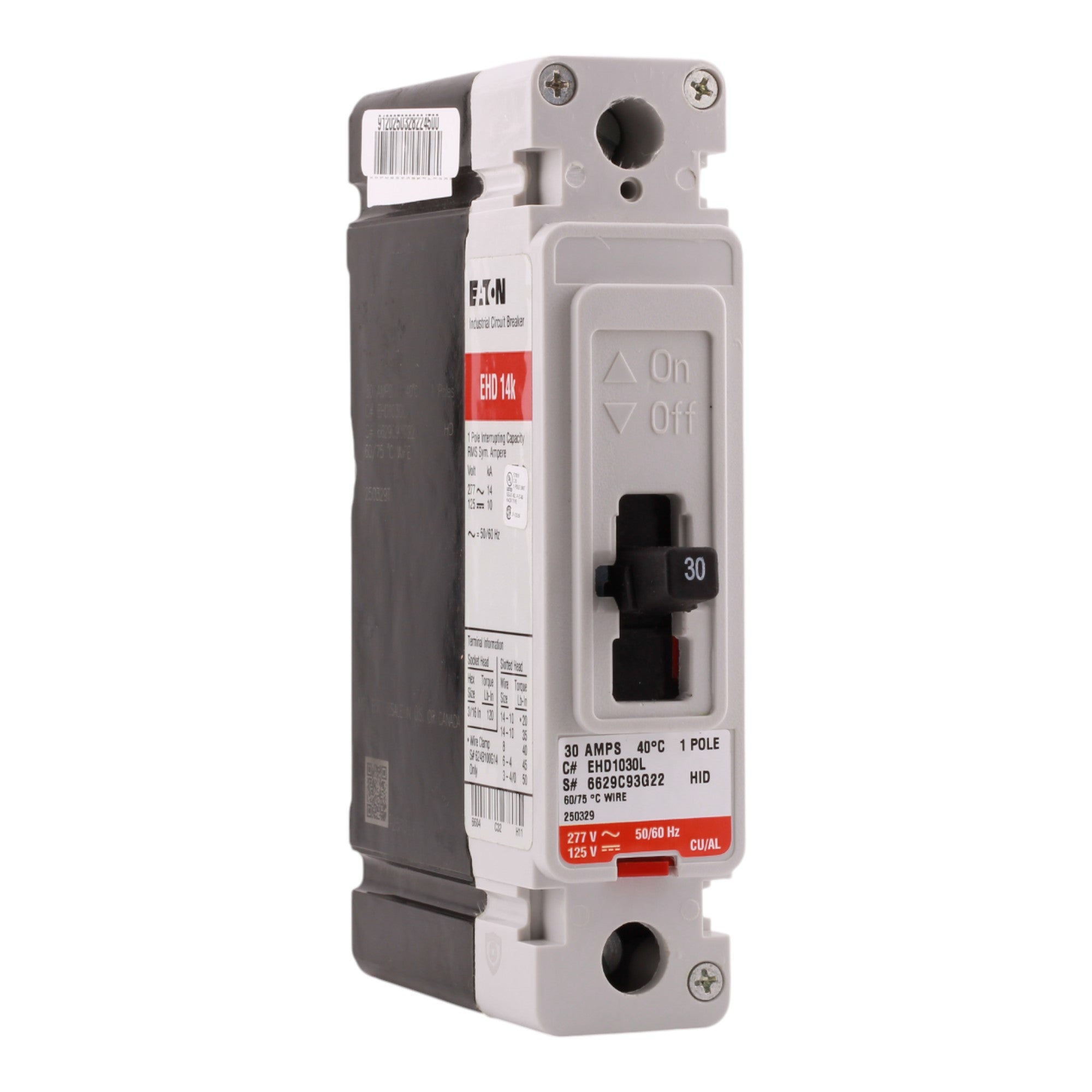 Eaton EHD1030L: 30 Amp 1-Pole Molded Case Circuit Breaker, Series C F-frame, 18kA at 240V/14kA at 480V interrupt rating, fixed thermal/magnetic trip, UL listed.