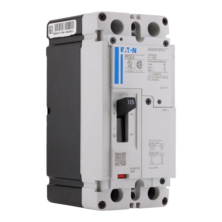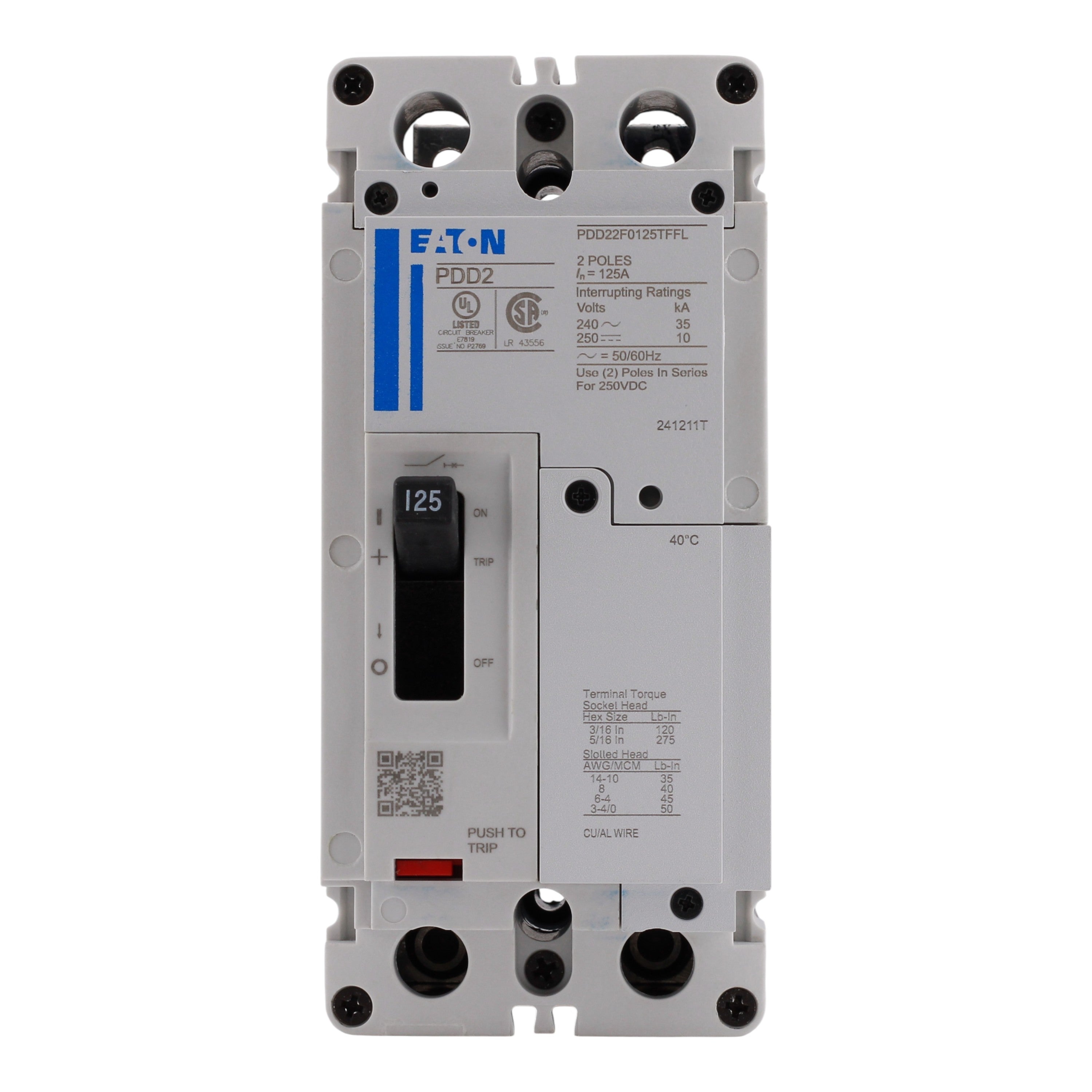 Eaton Power Defense PDD22F0125TFFL: 125 Amp 2-Pole Molded Case Circuit Breaker, 240V AC, 35kA Interrupt Rating at 240V, Frame 2, Fixed Thermal-Magnetic Trip, Standard Terminals Load Only, UL 489 Listed, CSA Certified.