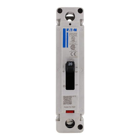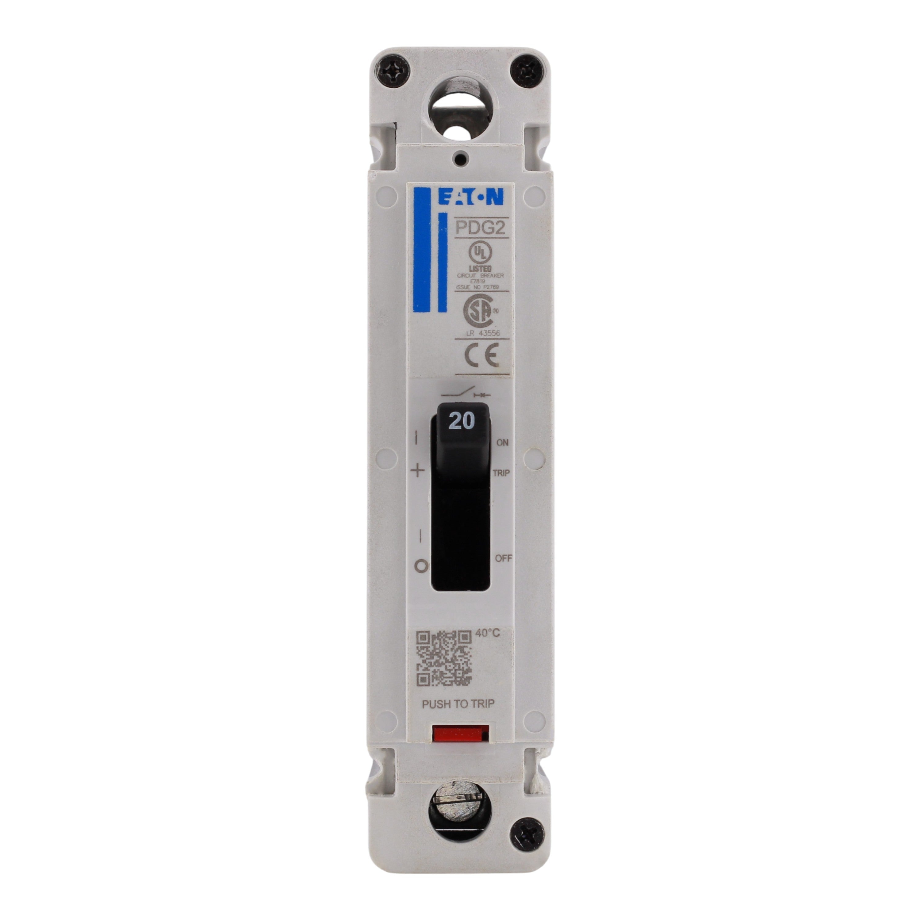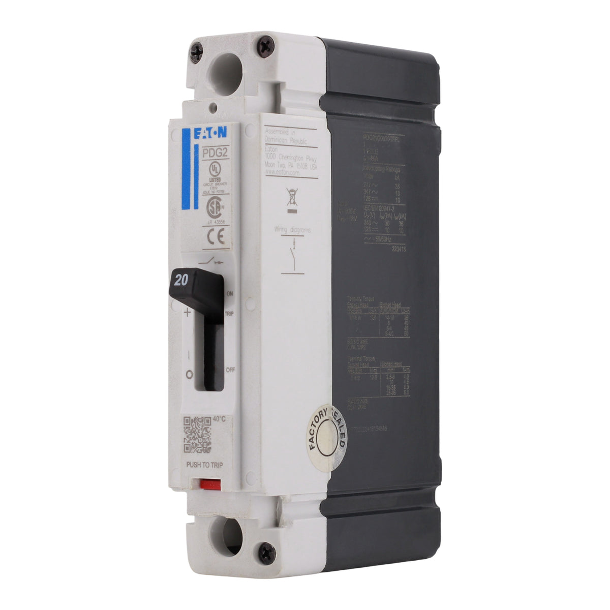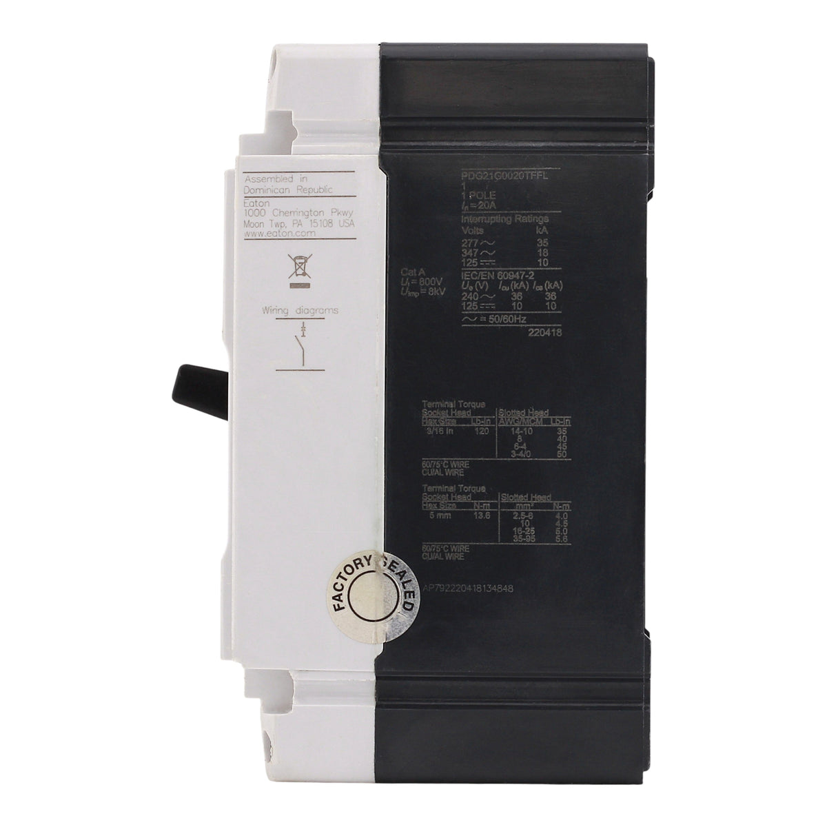 Eaton Power Defense PDG21G0020TFFL: 20 Amp 1-Pole Molded Case Circuit Breaker, Globally Rated Frame 2, 600 Vac, 35 kAIC at 480V, Fixed Thermal-Fixed Magnetic Trip, Standard Terminals Load Only, UL 489 Listed, IEC 60947-2, CSA Certified.