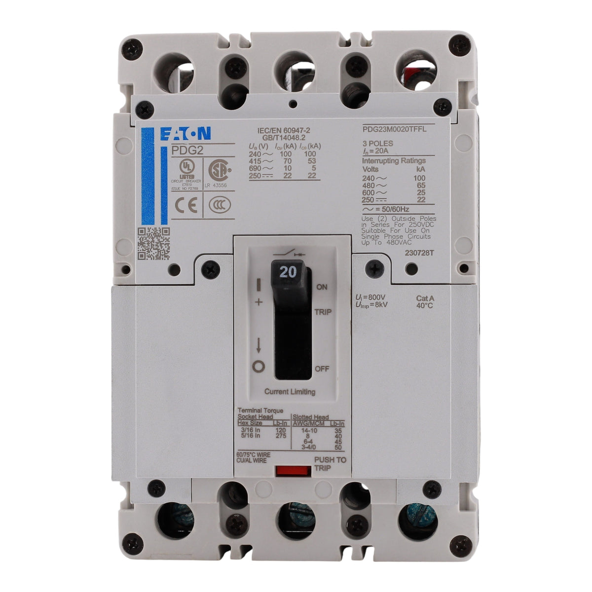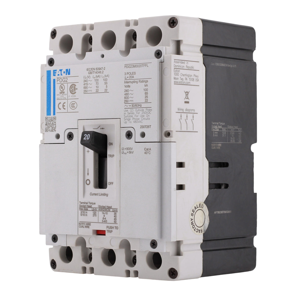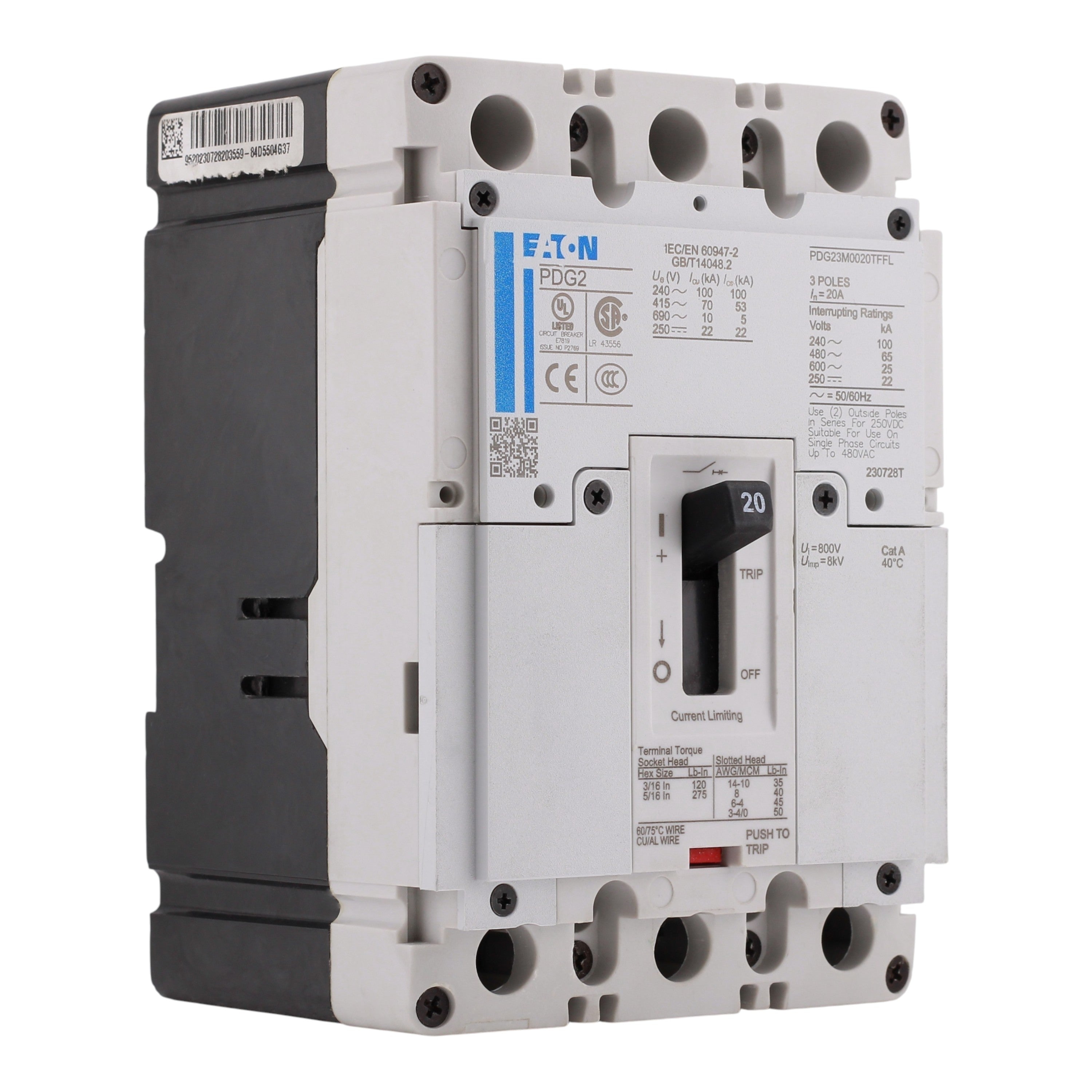 Eaton Power Defense PDG23M0020TFFL: 20 Amp 3-Pole Thermal-Magnetic Trip Molded Case Circuit Breaker, 600 Vac, 65 kAIC at 480V, Frame 2, Fixed Thermal-Fixed Magnetic (T-M), Standard Terminals Load Only, UL 489 Listed, IEC 60947-2, RoHS Compliant.