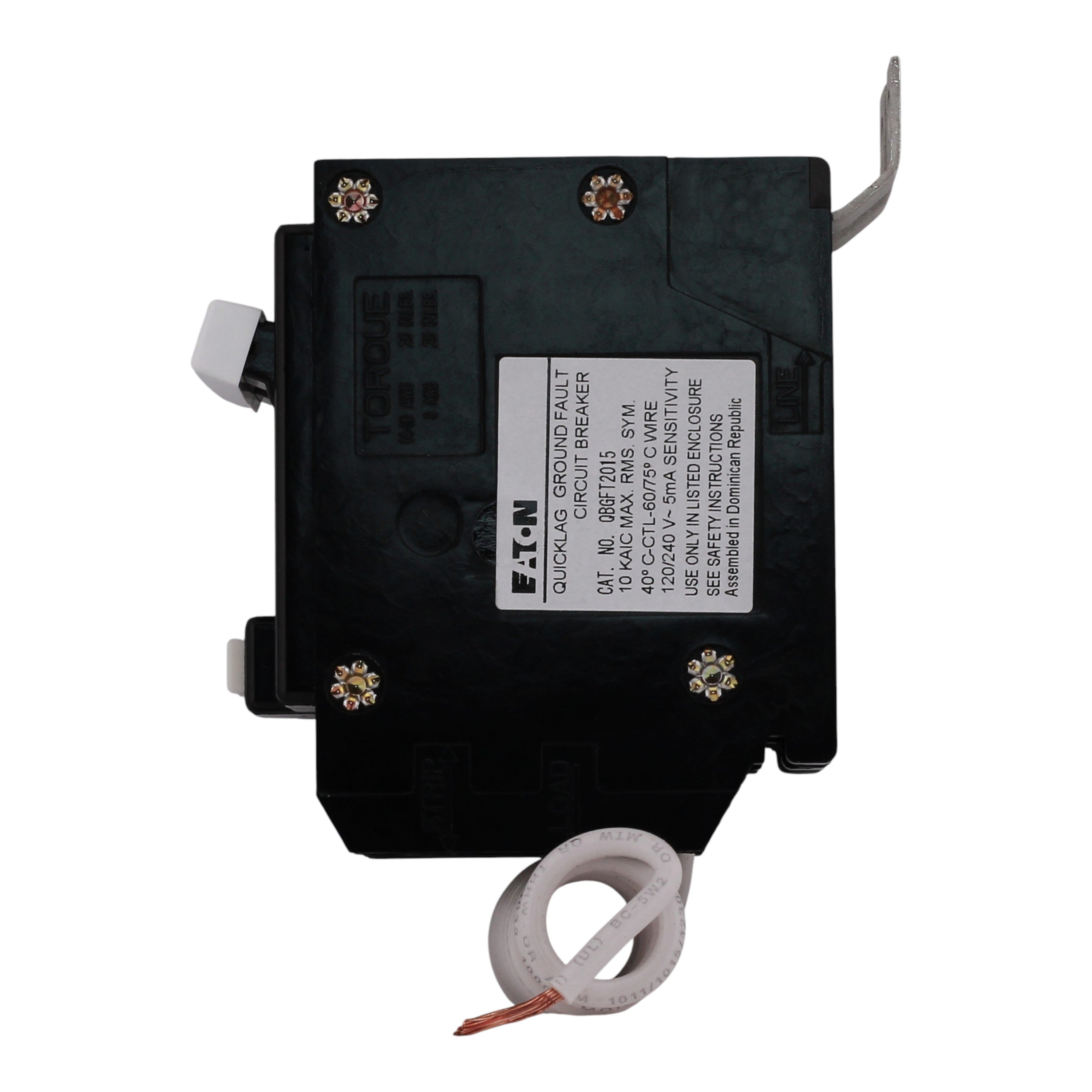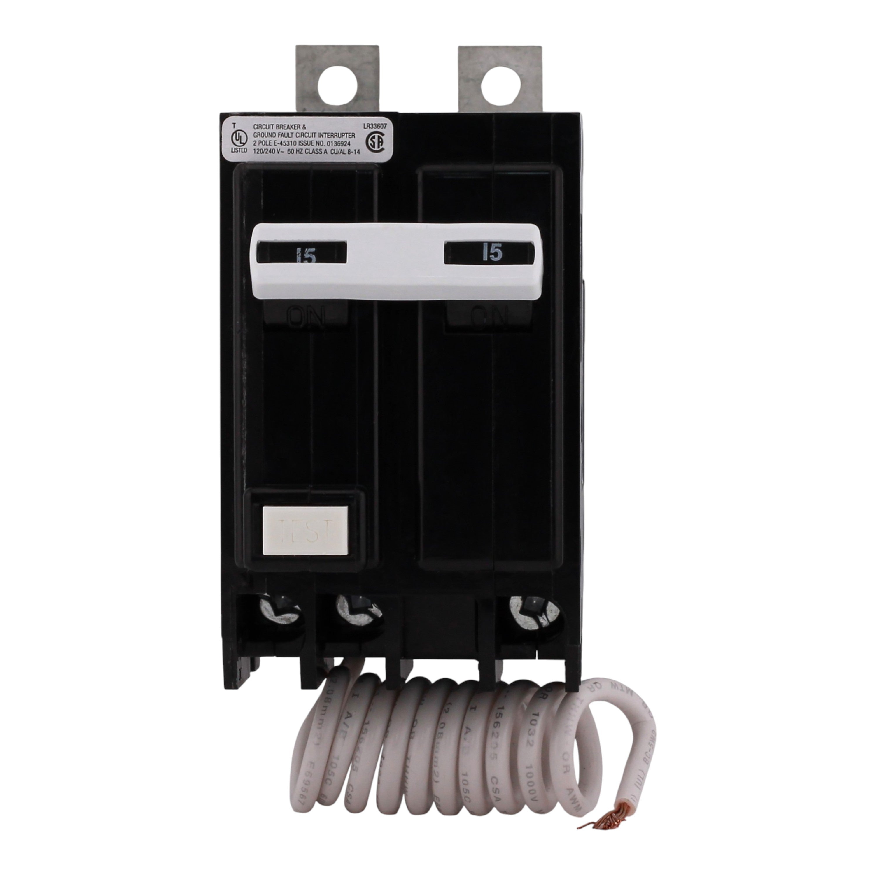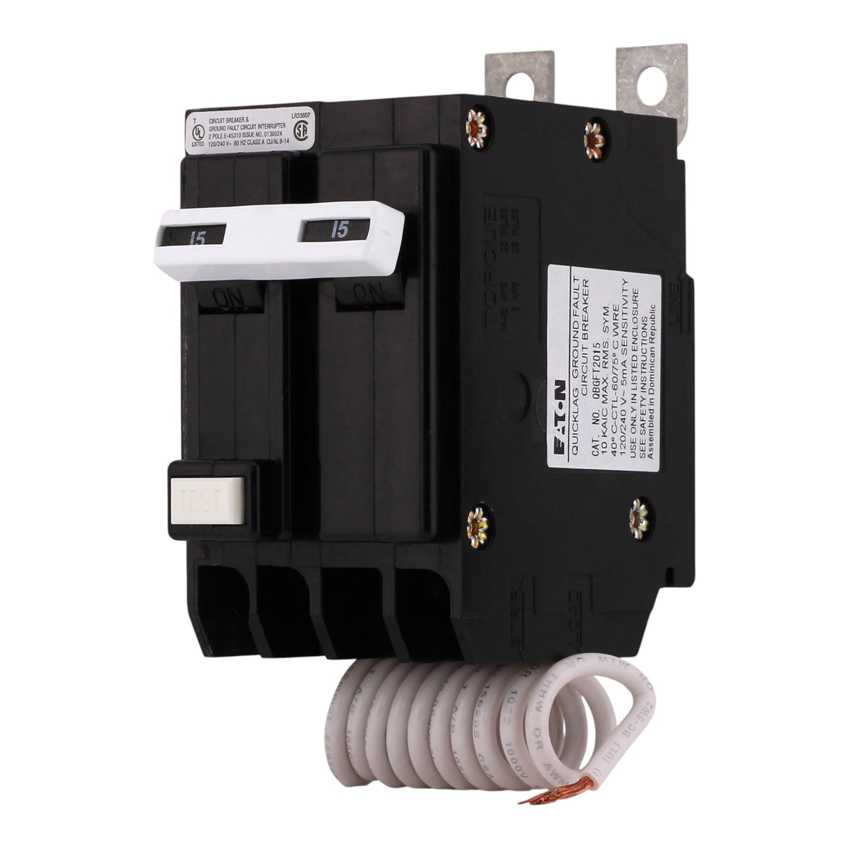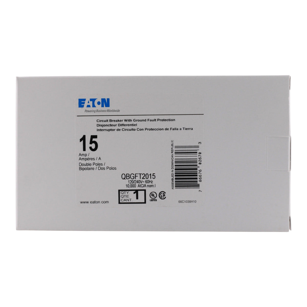Eaton QBGFT2015: 15 Amp 2-Pole Ground-Fault Circuit Interrupter breaker, 120/240V, 10kA, 5mA trip sensitivity, UL 489 listed.