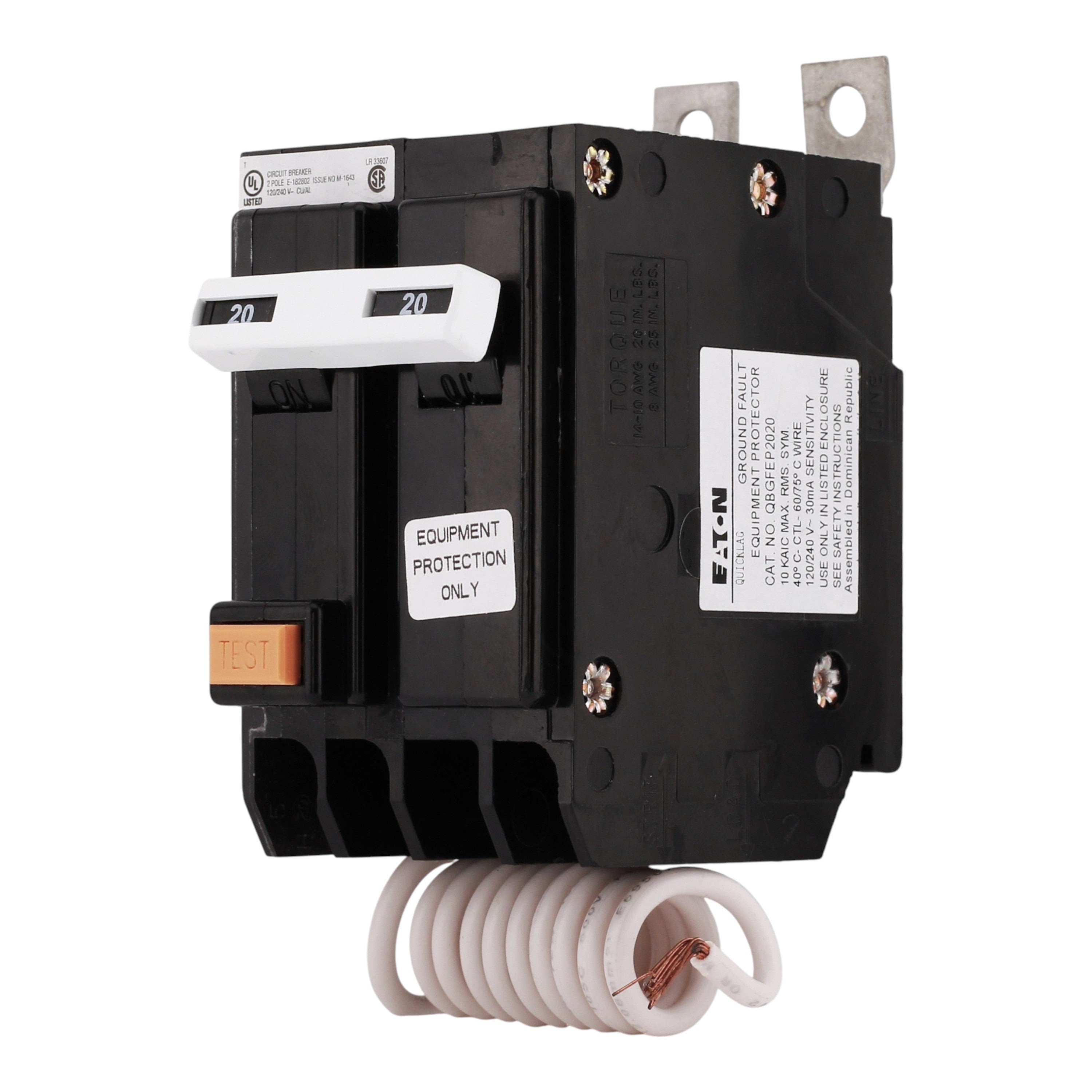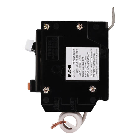 Cutler Hammer QBGFEP2020: 20 Amp 2-Pole Ground Fault Equipment Protector (GFEP) circuit breaker, 240V, 10kA interrupt rating, bolt-on mounting, 30mA trip sensitivity, thermal-magnetic trip, UL listed.