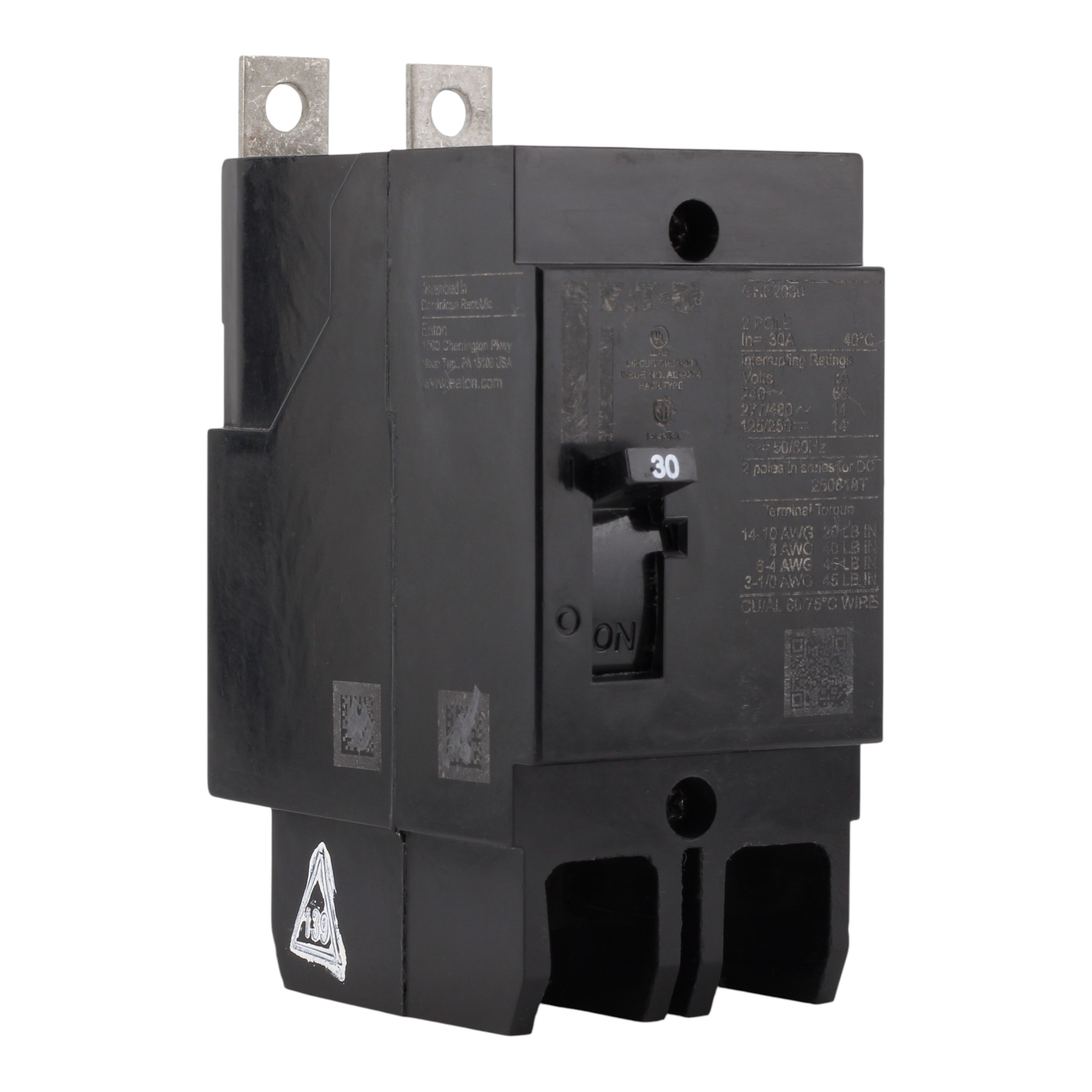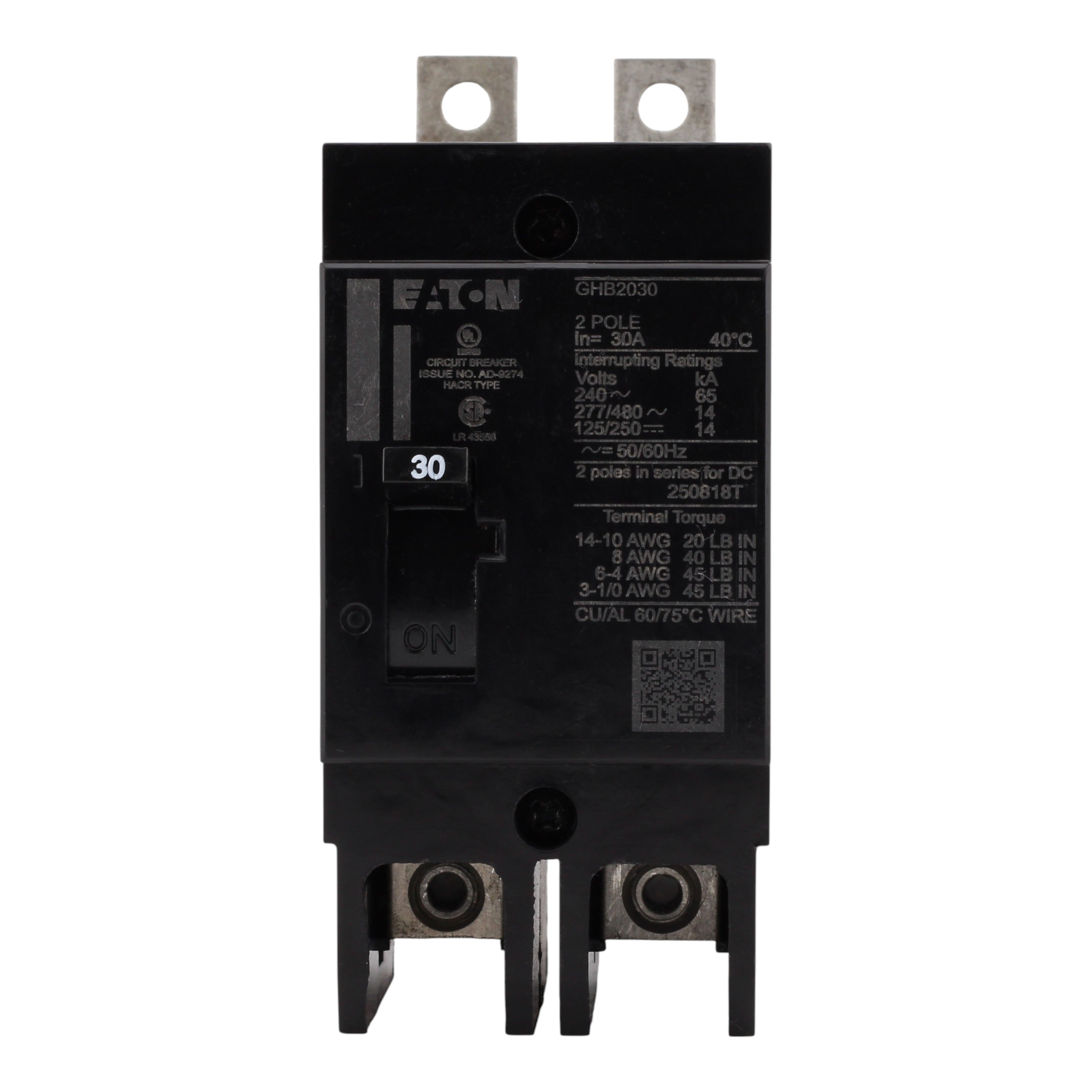 Eaton GHB2030: 30 Amp 2-Pole molded case circuit breaker, 480Y/277 VAC, 125/250 VDC, 14 kAIC@480Y/277V, fixed thermal/magnetic trip, UL listed.