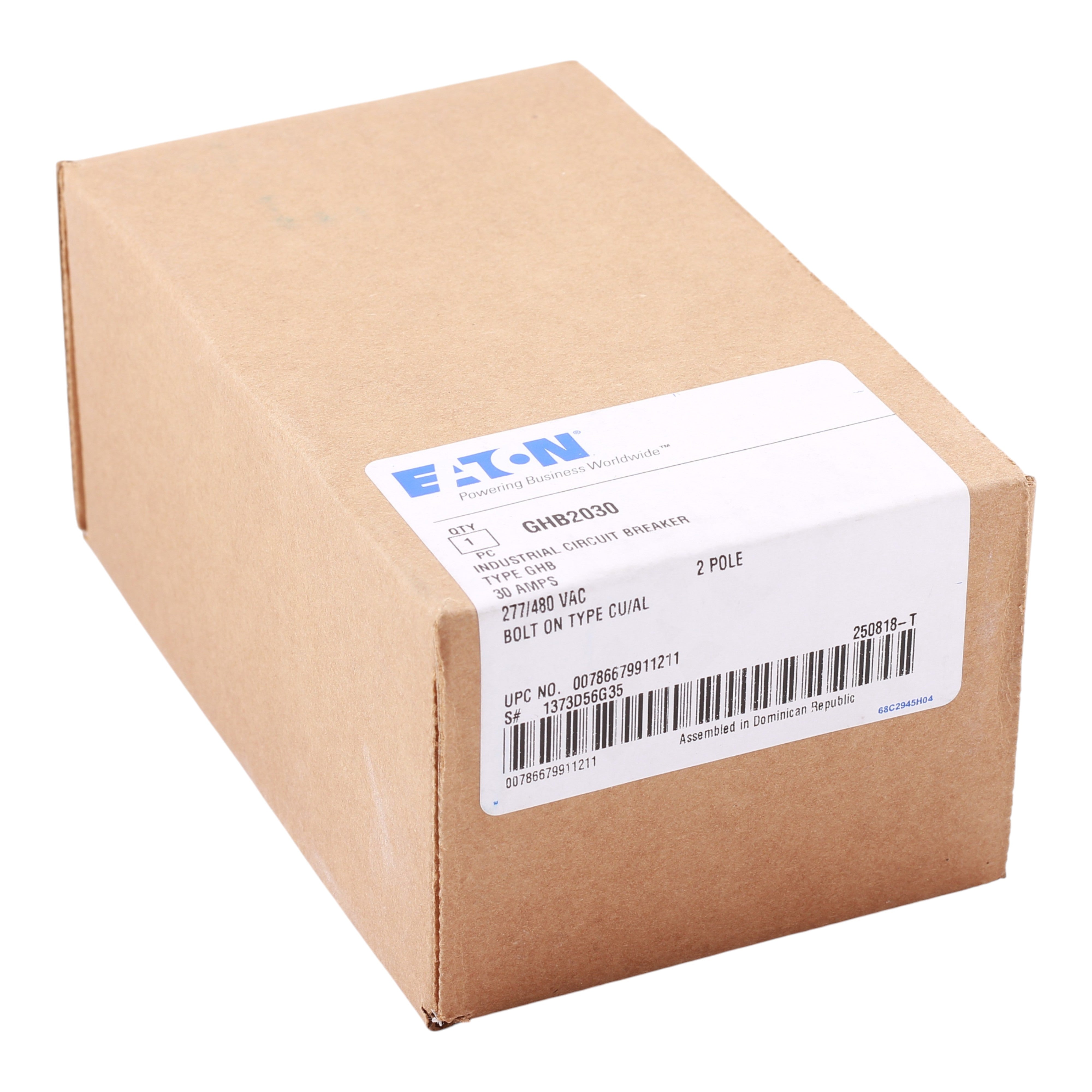 This Eaton GHB2030 molded case circuit breaker provides reliable 30A, 2-pole protection for 480Y/277V AC circuits in Series C loadcenters. With fixed thermal/magnetic trip and high interrupt rating, it ensures robust overcurrent protection for commercial and industrial applications.