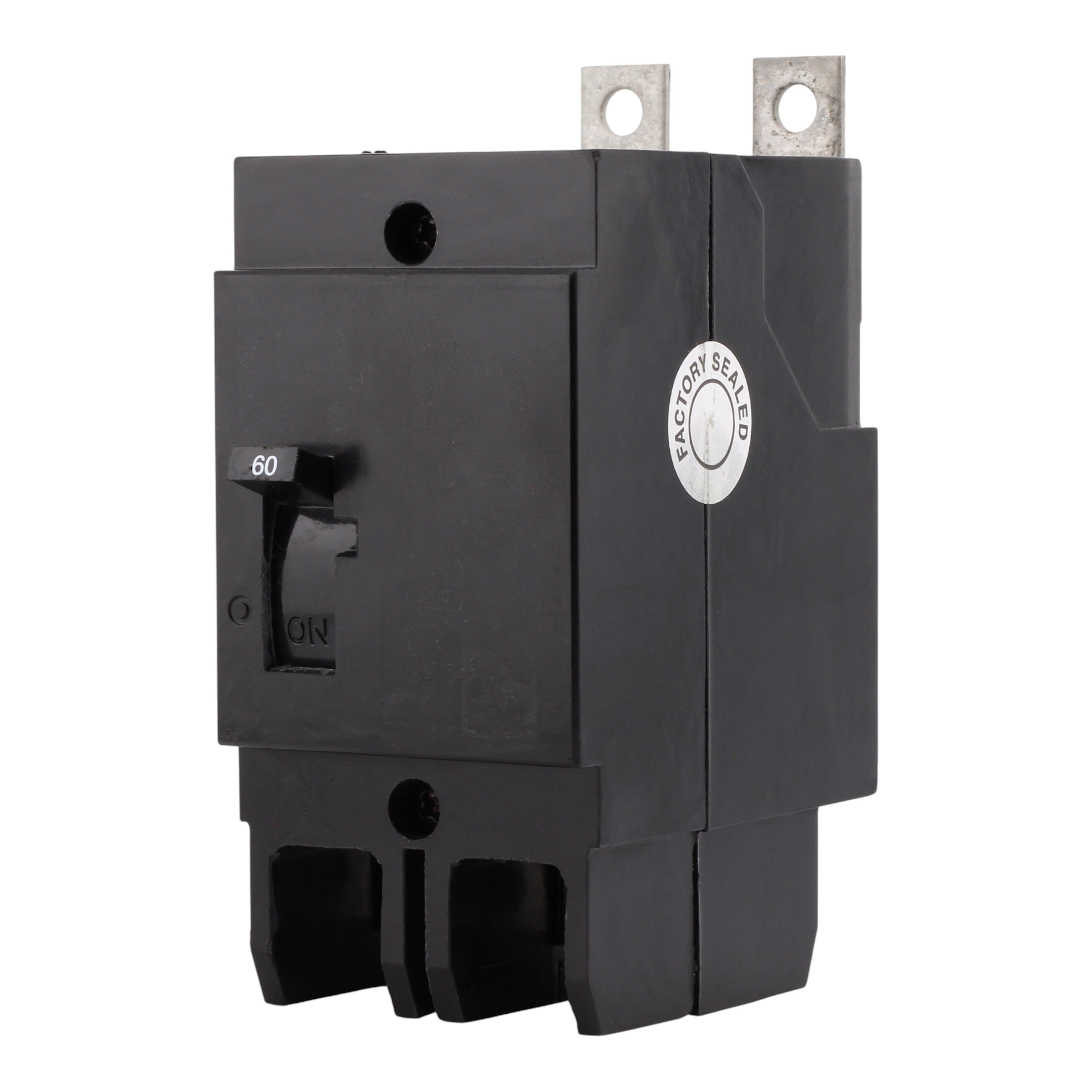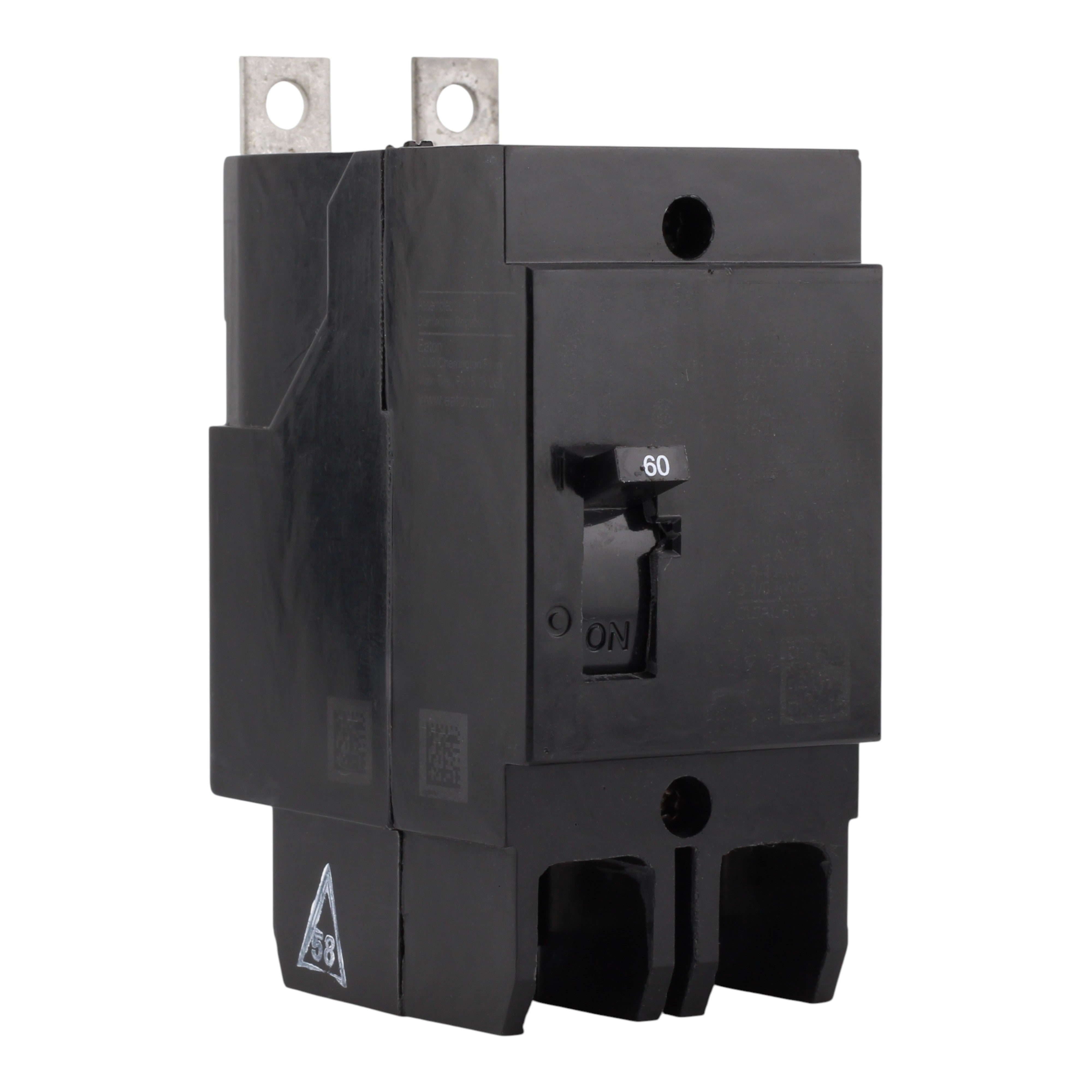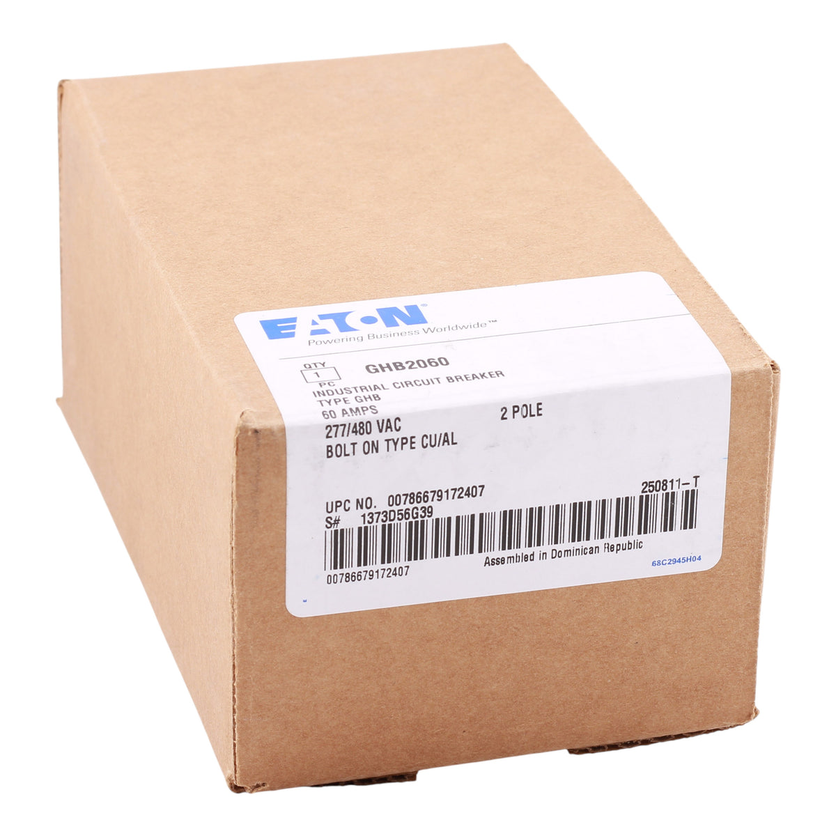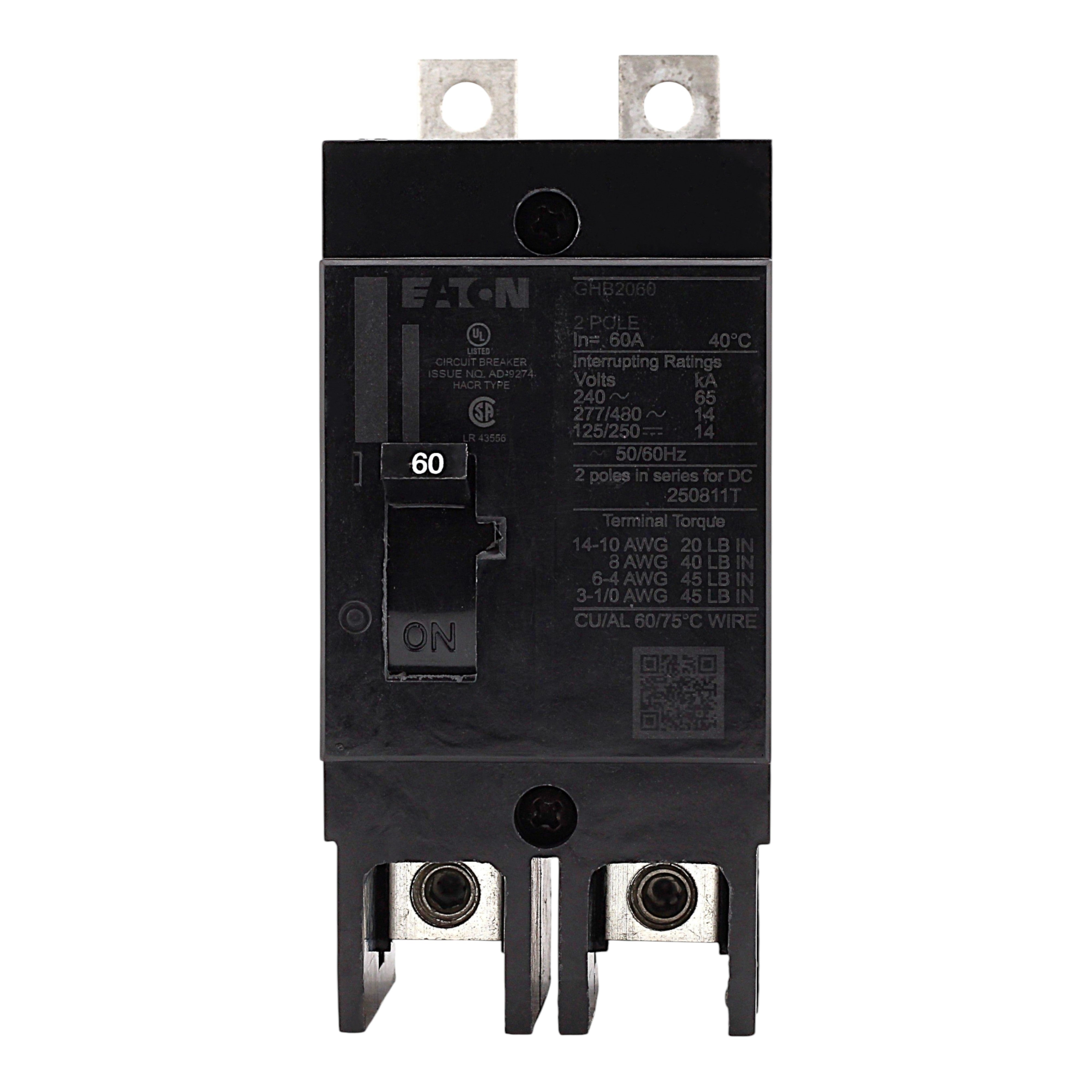 Eaton GHB2060: 60 Amp 2-Pole molded case circuit breaker, 480Y/277 Vac, 125/250 Vdc, fixed thermal/magnetic trip, 65 kAIC@240V/14 kAIC@480V, 50/60 Hz, UL listed.