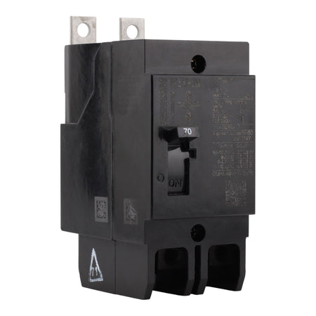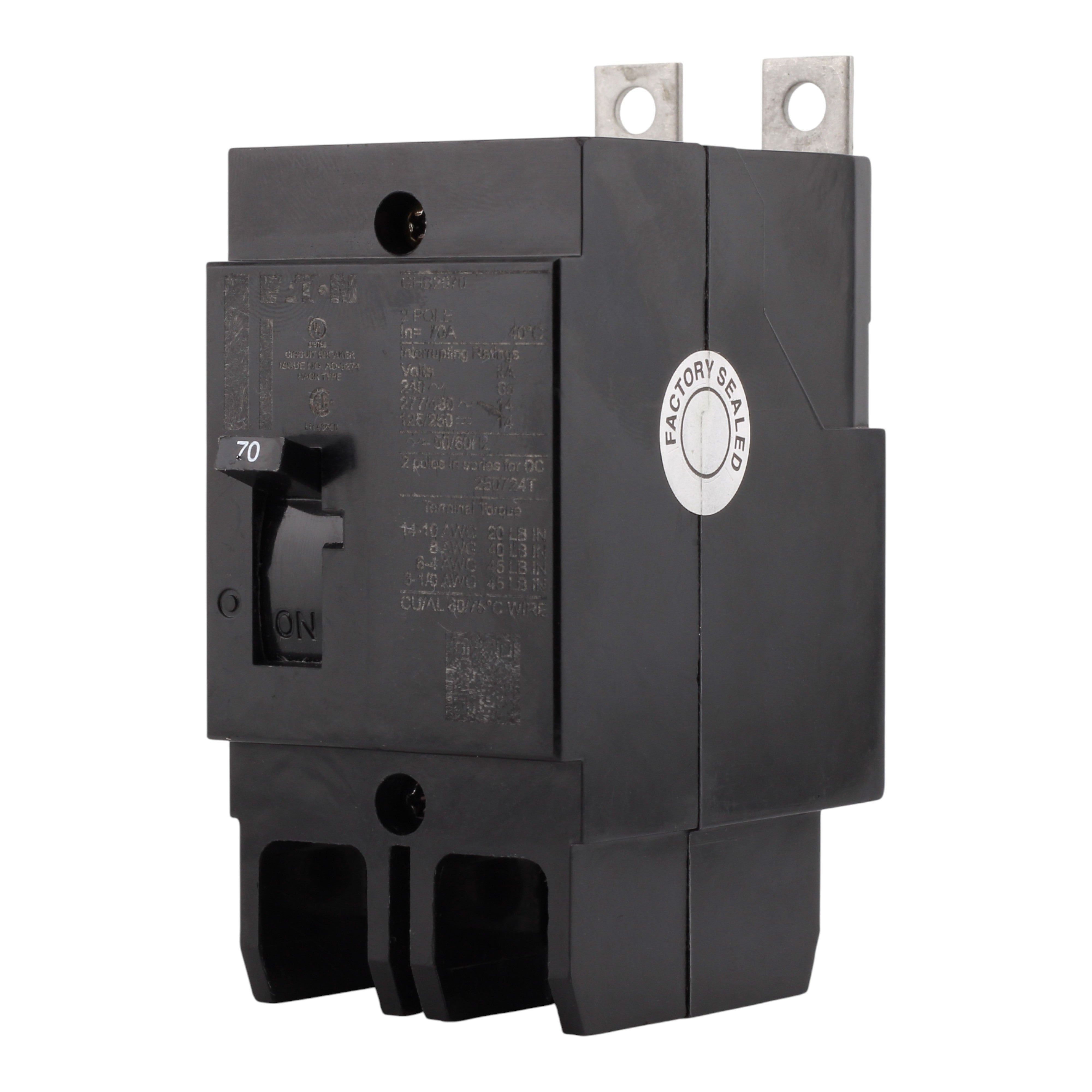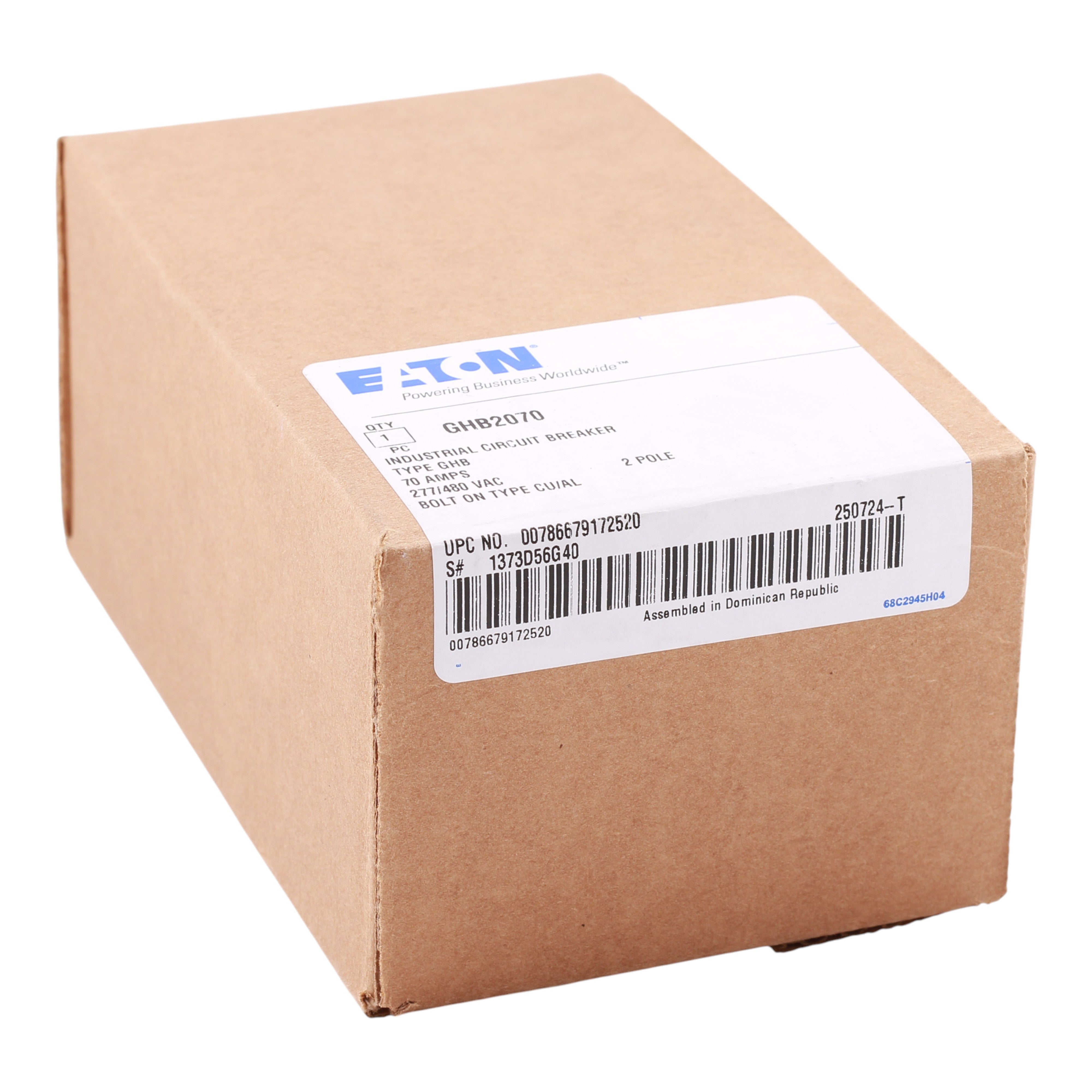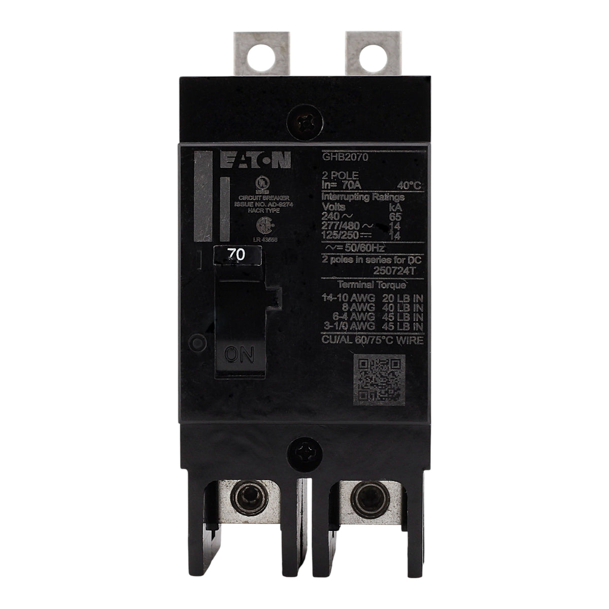 Eaton GHB2070: 70 Amp 2-Pole molded case circuit breaker, 480Y/277 Vac, 125/250 Vdc, fixed thermal/magnetic trip, 65 kAIC@240V/14 kAIC@480V, UL listed.