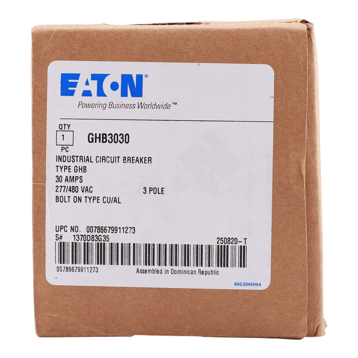Eaton GHB3030: 30 Amp 3-Pole Molded Case Circuit Breaker, 480Y/277 Vac, 125/250 Vdc, 50/60 Hz, fixed thermal fixed magnetic trip, 14 kAIC at 480Y/277 Vac, 65 kAIC at 240 Vac, UL listed.