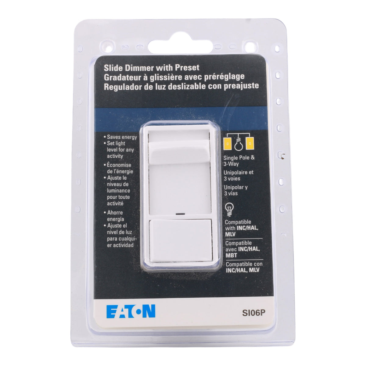 Eaton SI06P-W: 600W slide dimmer, 120V, no neutral required, single-pole/three-way, compatible with incandescent, halogen, MLV and LED loads, preset feature, white finish, flush mount, cULus listed.