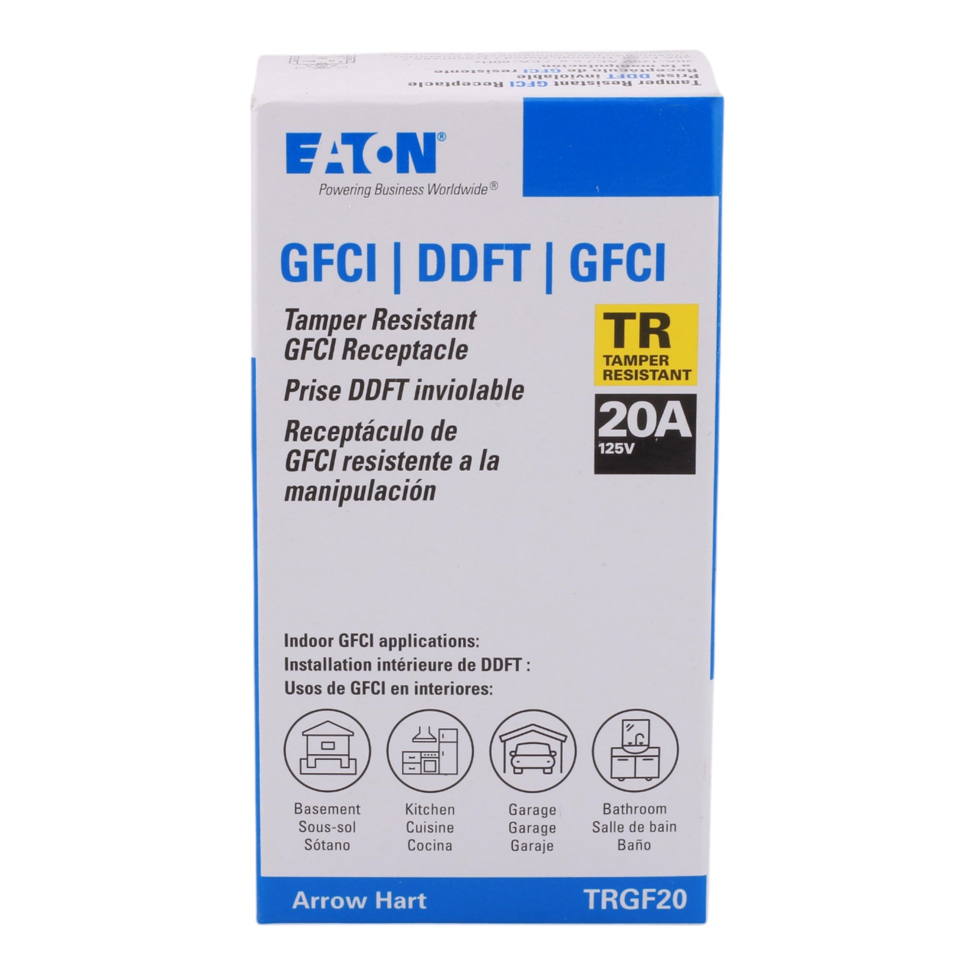 Eaton TRGF20W: Slim self-test GFCI receptacle, 20A/125V, tamper-resistant design, back/side wire terminals, FedSpec certified, UL listed