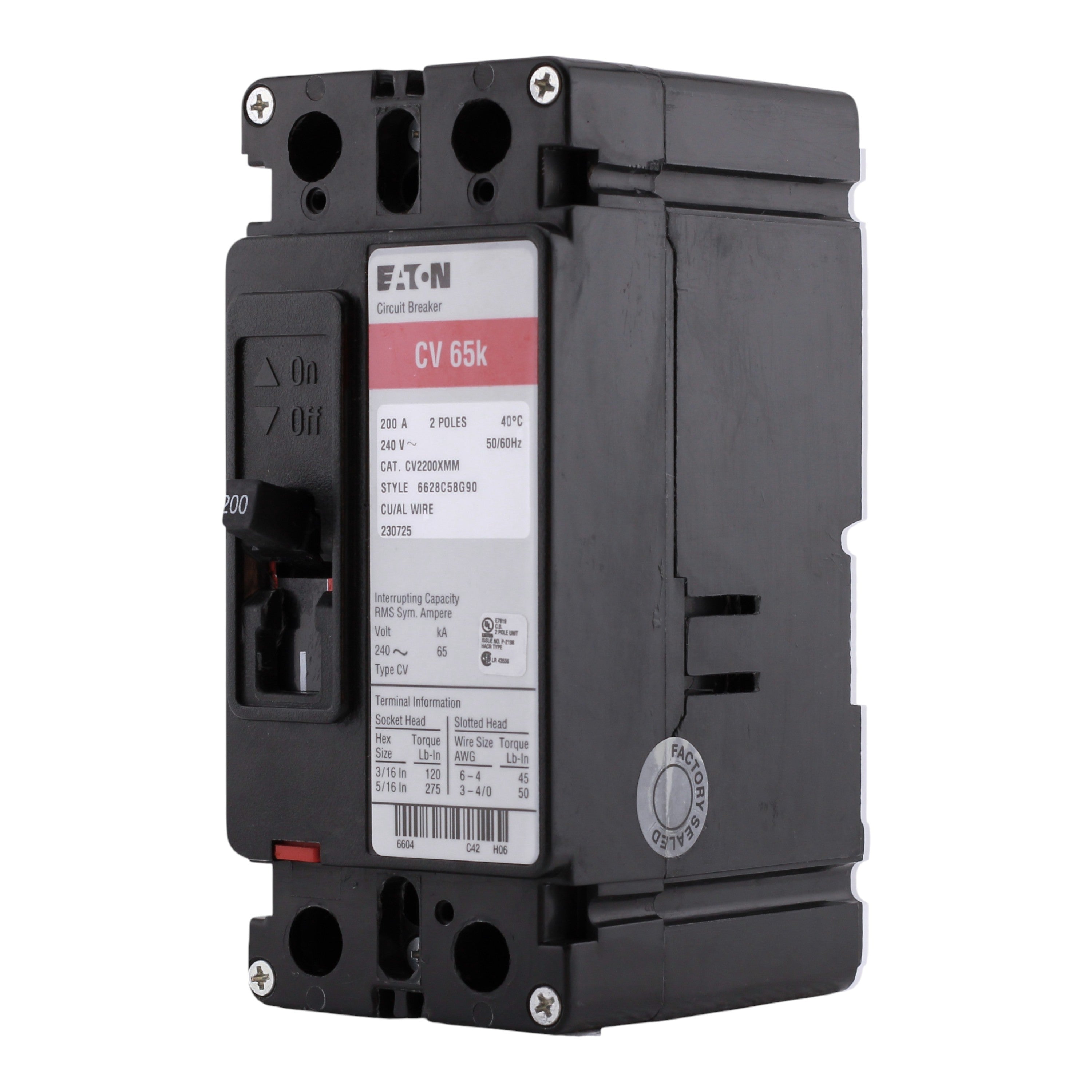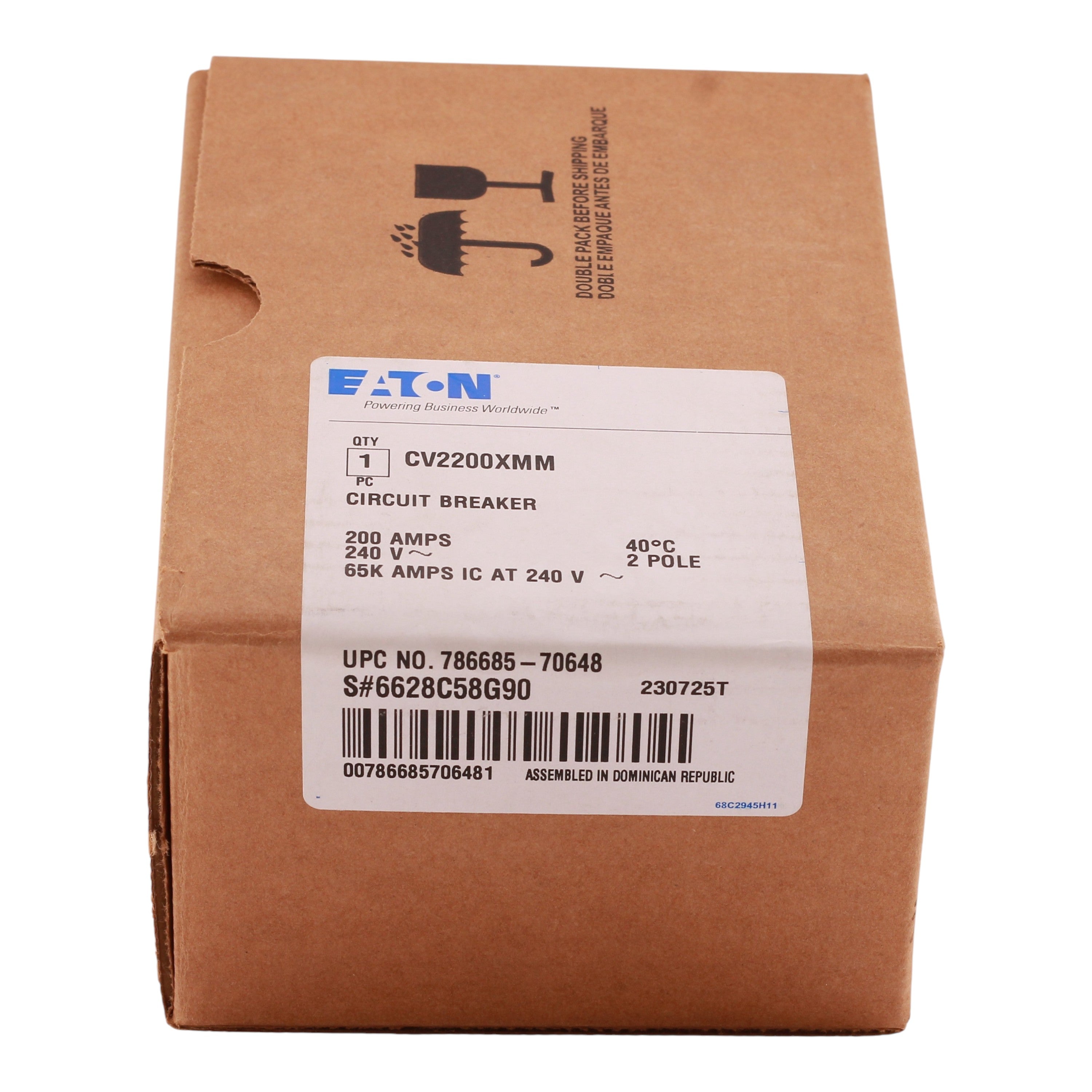 Eaton CV2200XMM: 200 Amp 2-Pole Molded Case Tenant Main Circuit Breaker, 120/240V, 65 kAIC interrupt rating, #6-4/0 AWG Cu/Al, includes mounting kit, UL 489 listed.