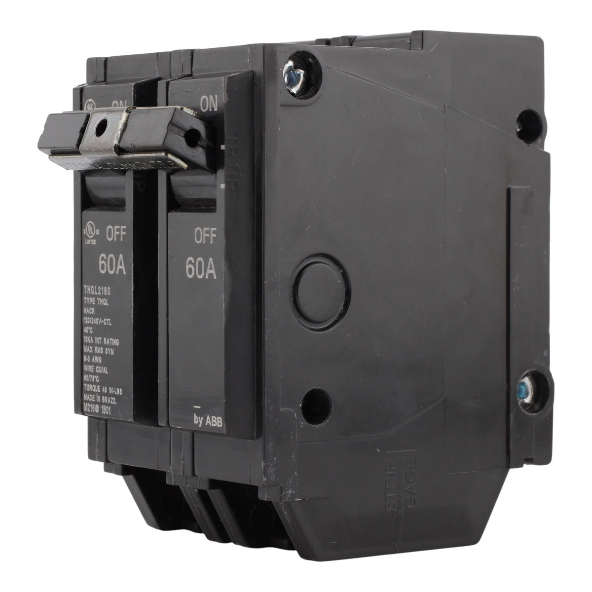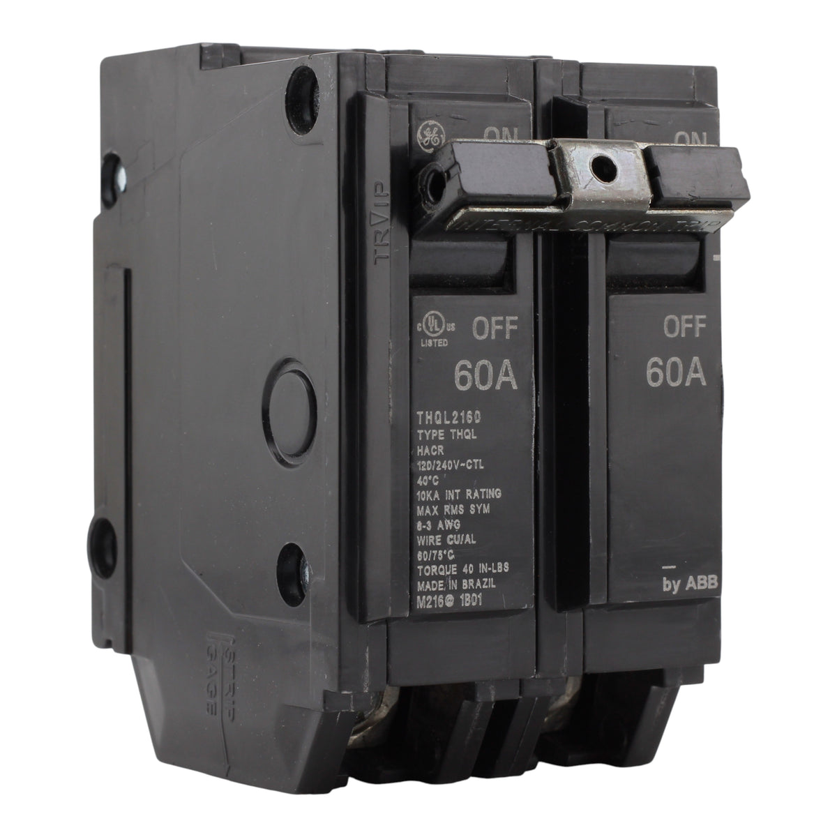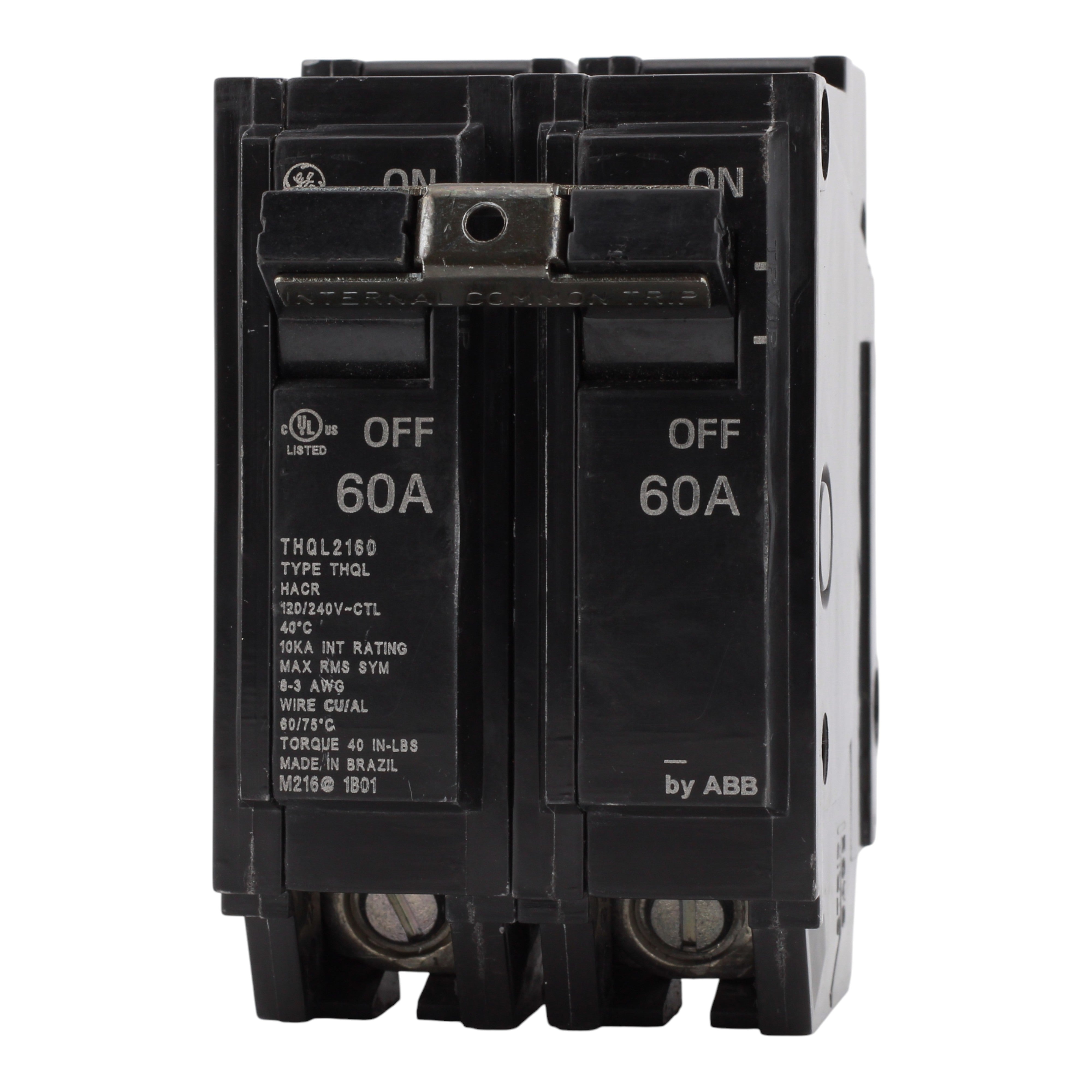 GE THQL2160: 60 Amp 2-Pole Thermal Magnetic circuit breaker, 120/240V, 10kA, LI trip function, suitable for reverse feed, UL listed.