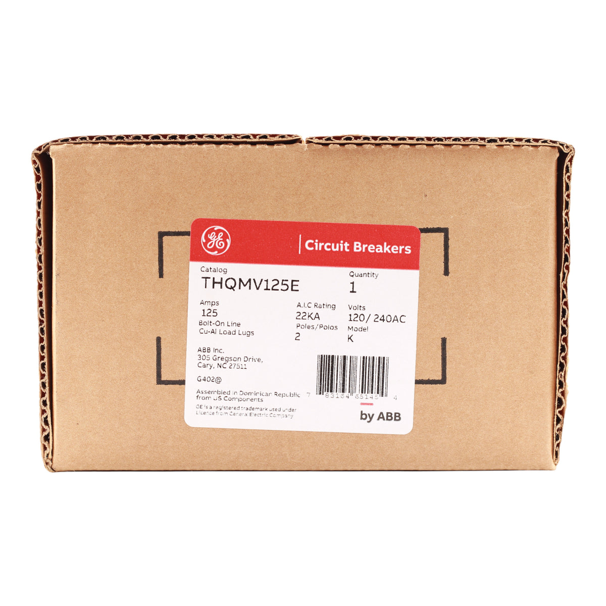 GE THQMV125E: 125 Amp 2-Pole main circuit breaker for Q-Line ReliaHome load centers, 120/240V, 22kAIC interrupt rating, plug-in mounting, UL listed.