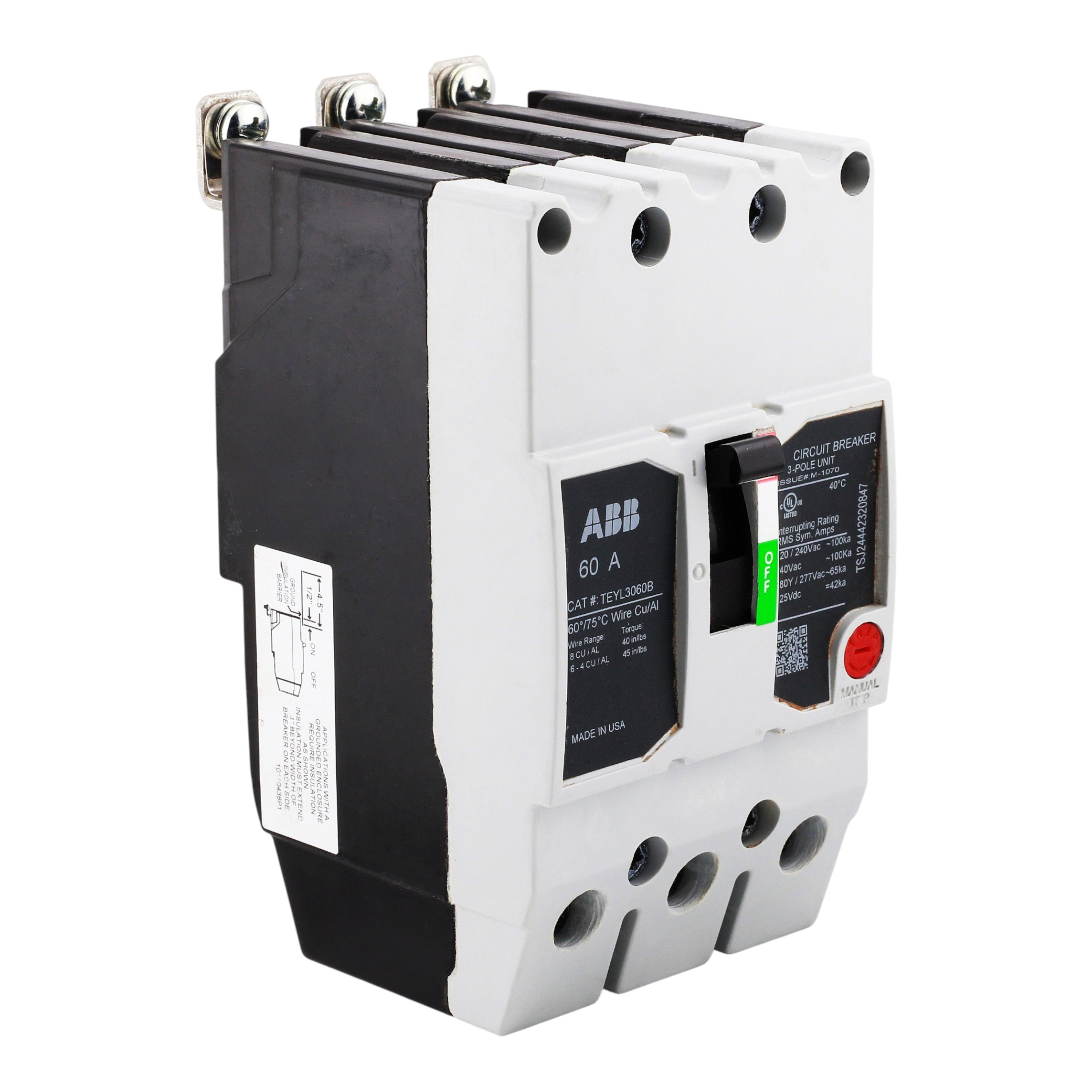 GE TEYL3060B: 60 Amp 3-Pole Bolt-On Molded Case Circuit Breaker, 480Y/277 Vac, 65kAIC at 480Y/277V, 100kAIC at 240V, LI Long-Time & Instantaneous Trip, UL Listed