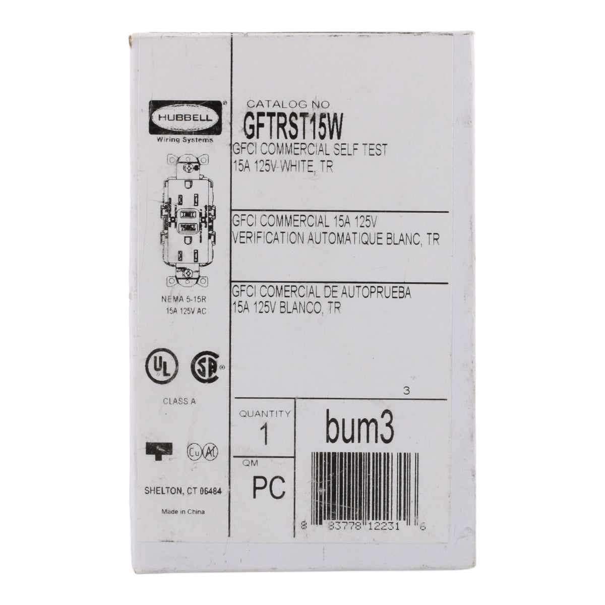 Hubbell GFTRST15W: 15A commercial-grade tamper-resistant self-test GFCI receptacle, 125V, NEMA 5-15R, 2-pole/3-wire grounding, white matte finish, thermoplastic construction, heavy-duty series."