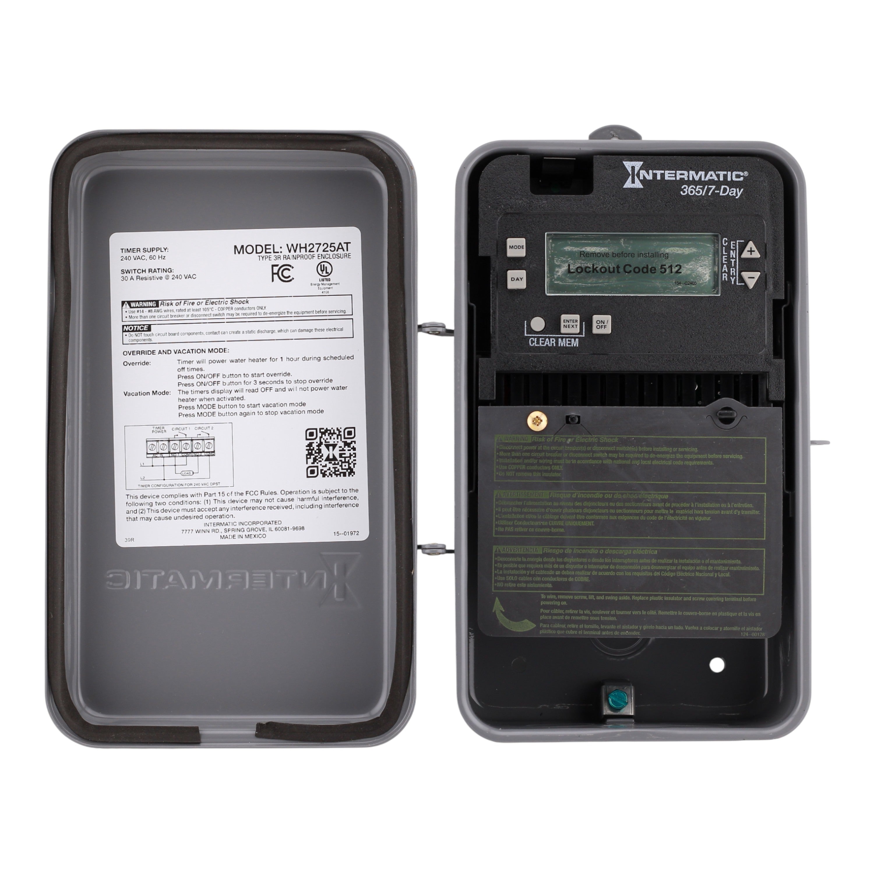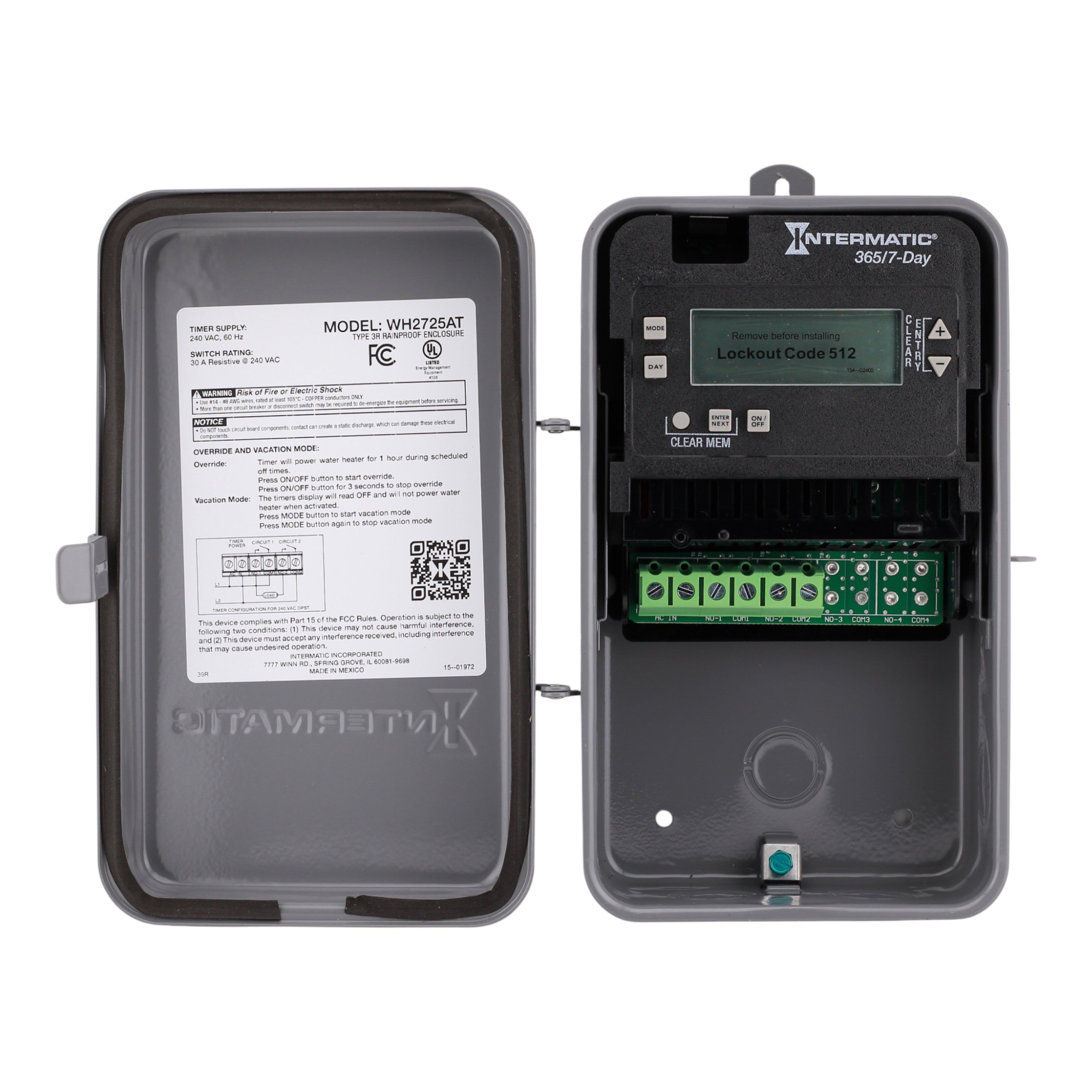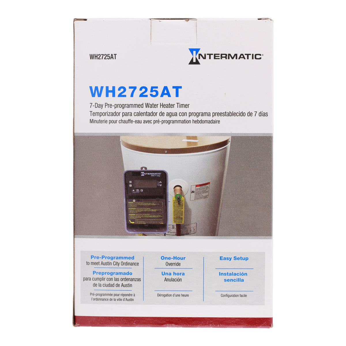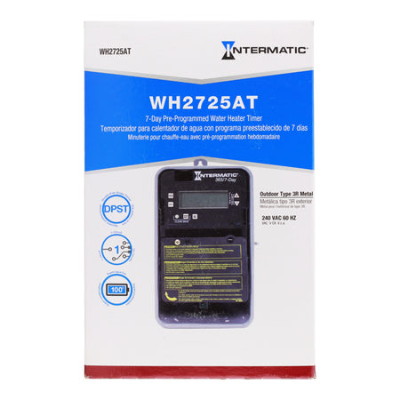 Intermatic WH2725AT: 7-Day Pre-Programmed Water Heater Timer, 240 Volts AC, 30 Amp, DPST contact form, NEMA 3R enclosure, automatic DST adjustment, UL listed.