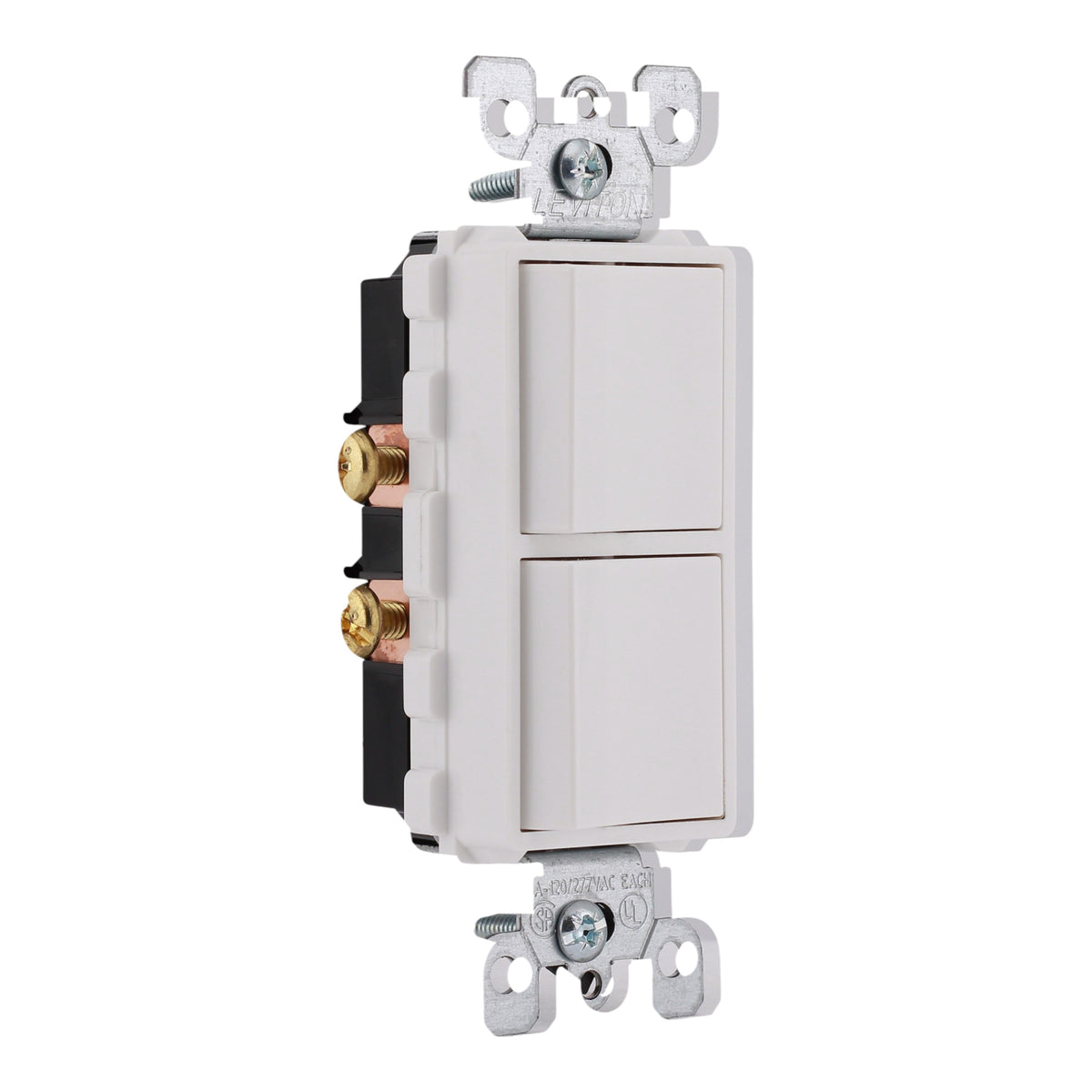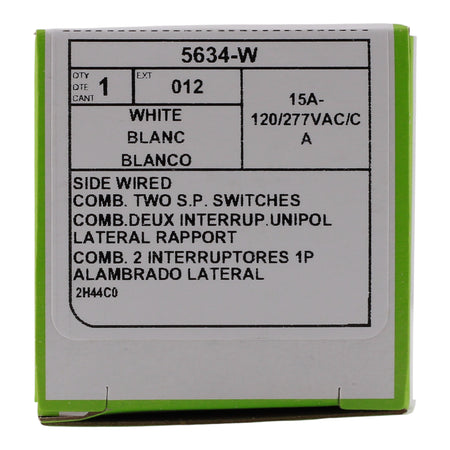 Leviton 5634-W: 15 Amp Single-Pole / Single-Pole Decora AC combination switch, 120/277V, grounding, commercial/residential specification grade, side wired, UL/CSA listed.