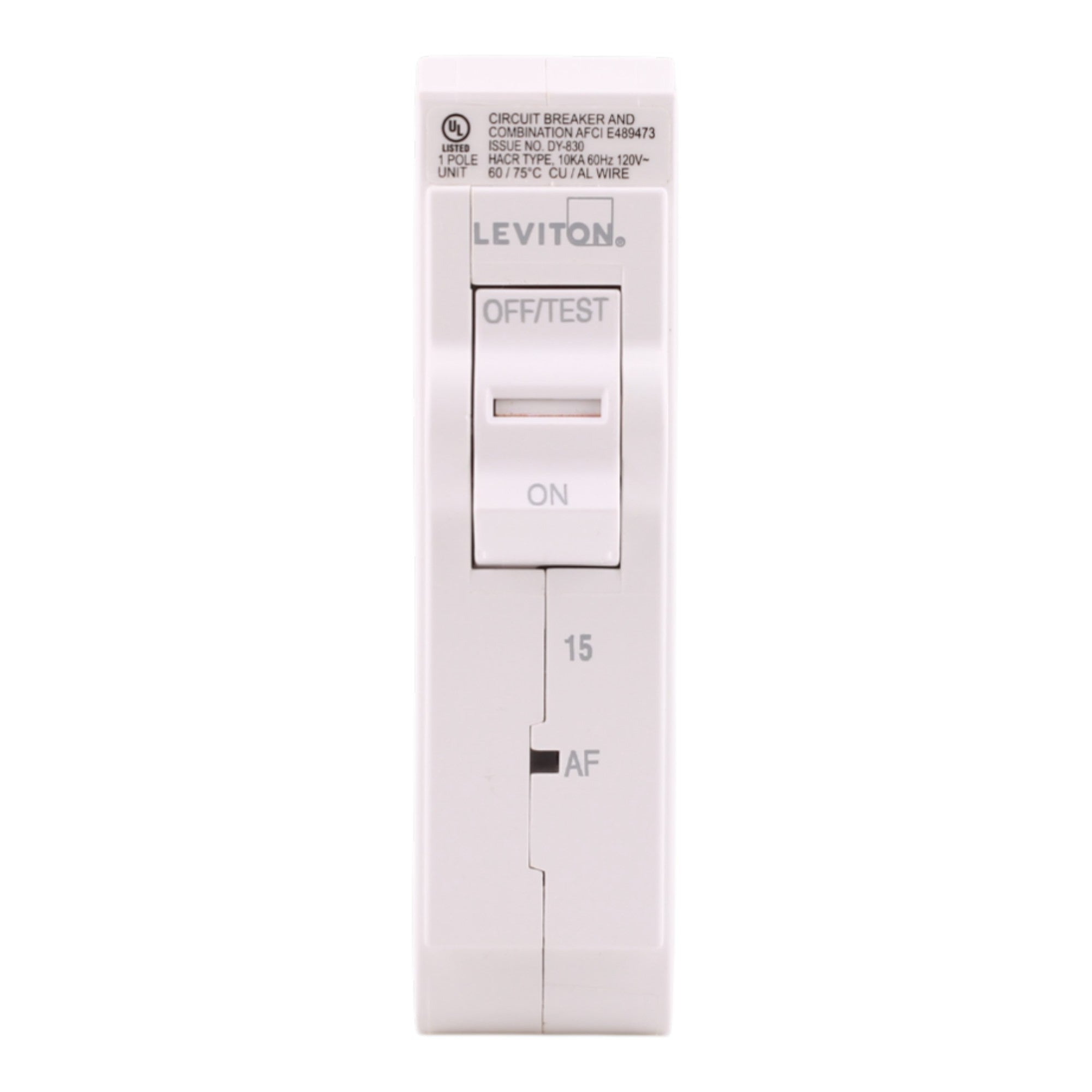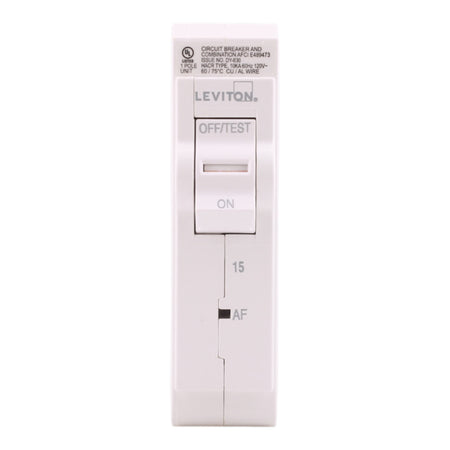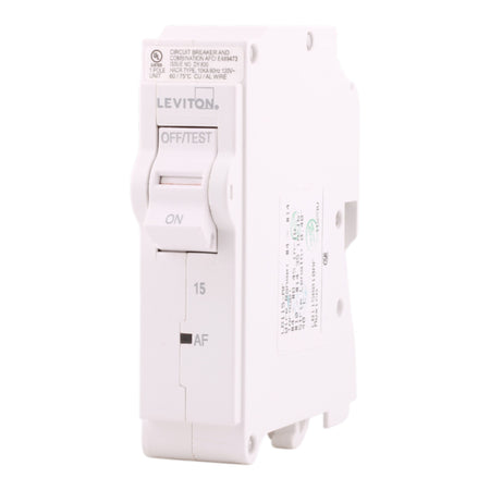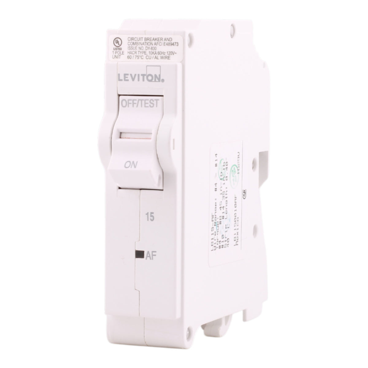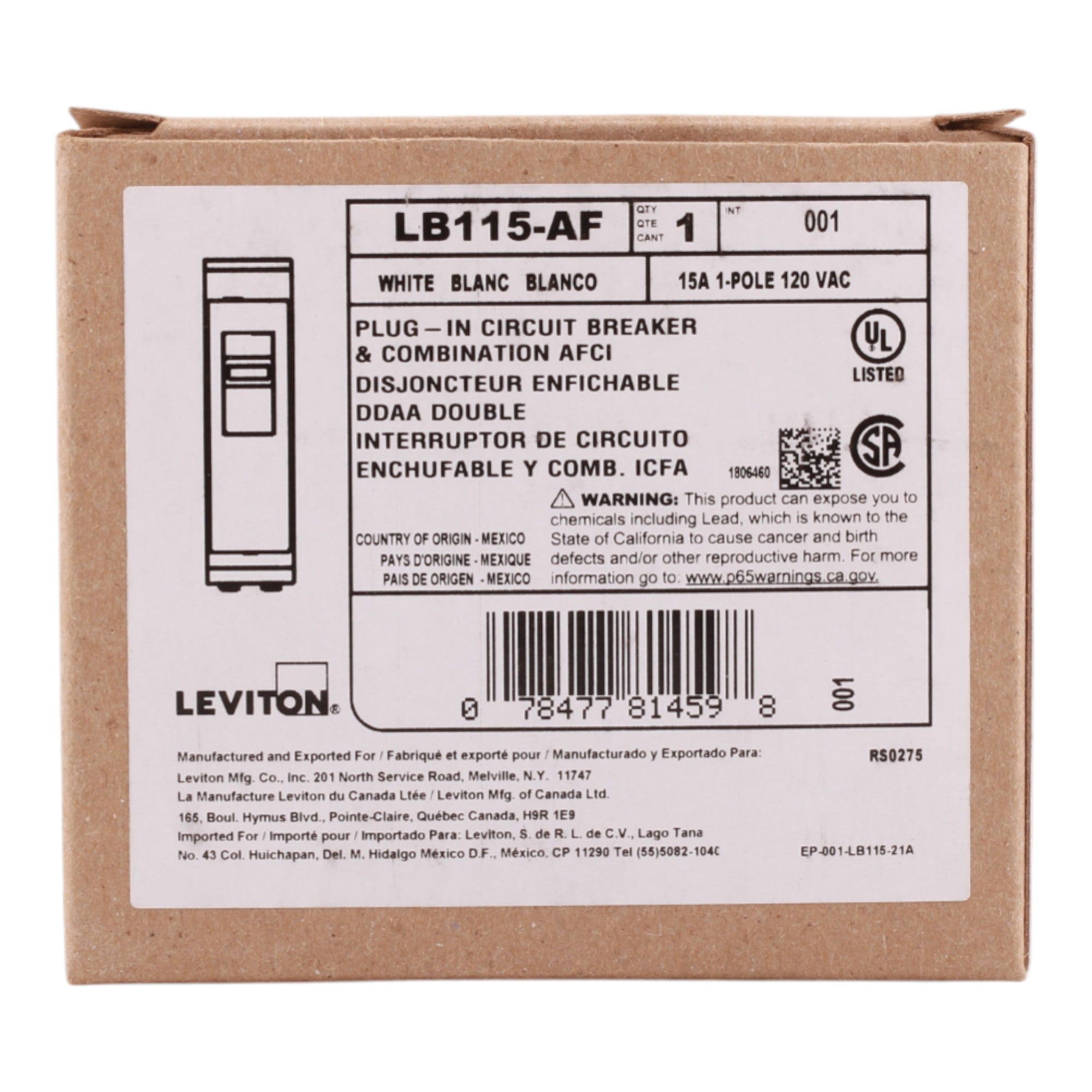 Leviton LB115-AF: 15 Amp 1-Pole AFCI Arc-Fault Circuit Interrupter breaker, 120V, 10kA, plug-on neutral, hydraulic magnetic, UL listed.
