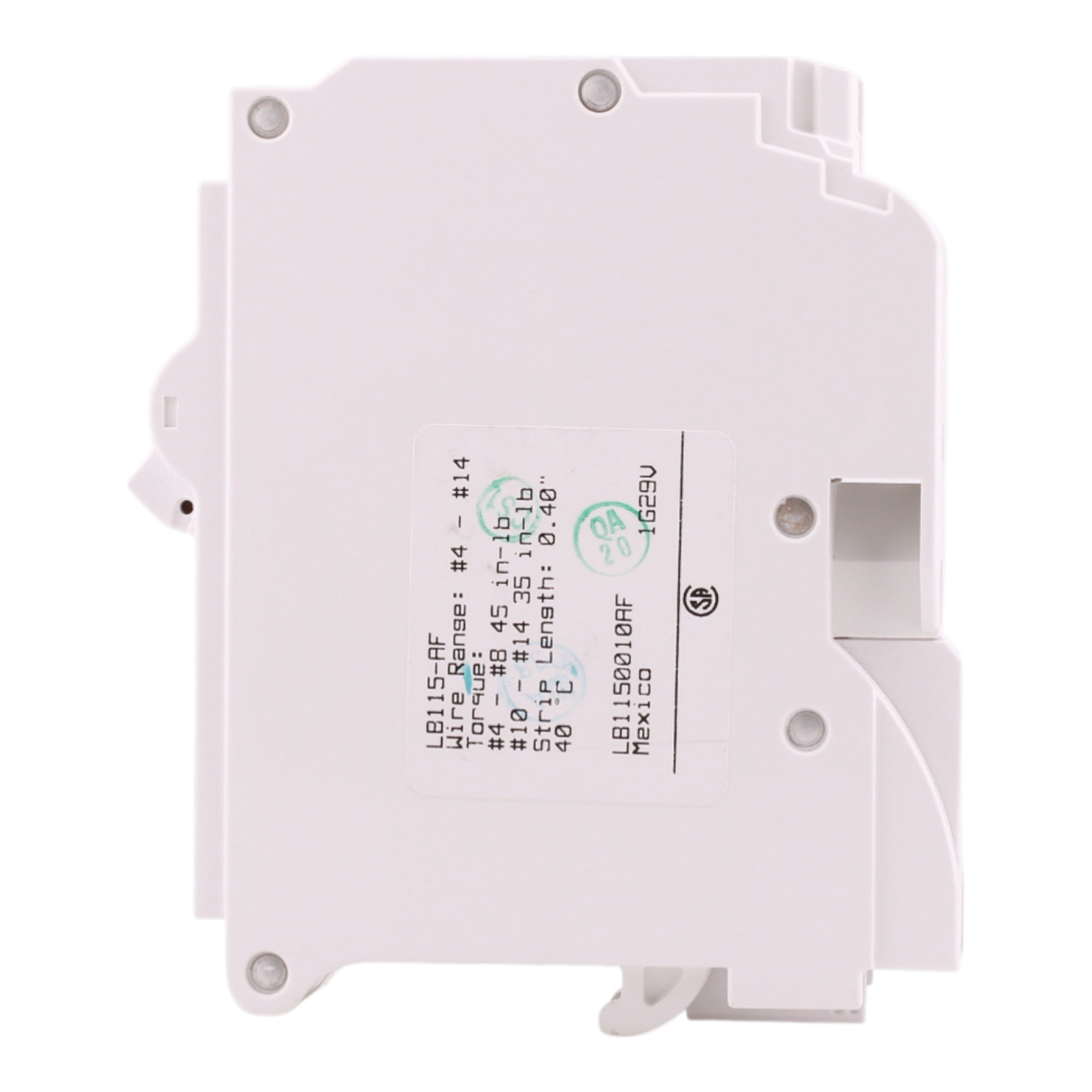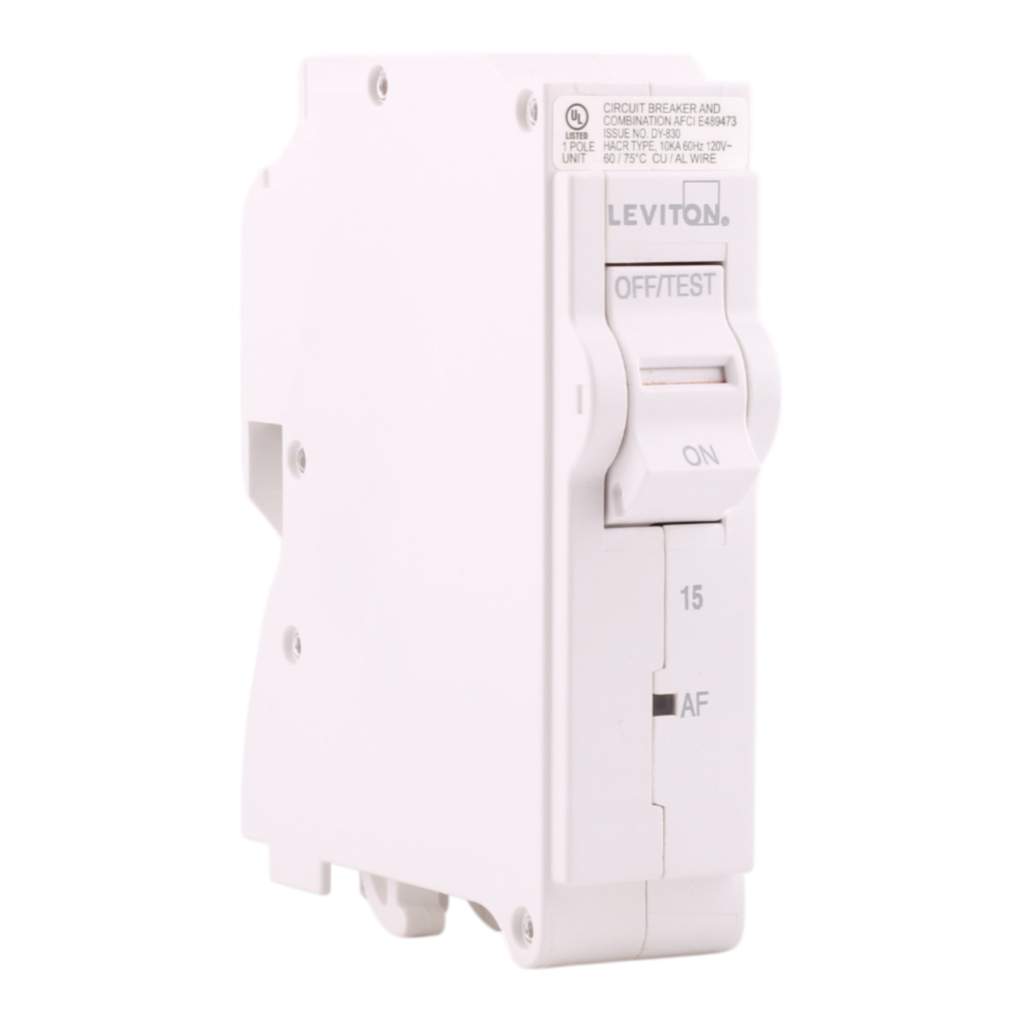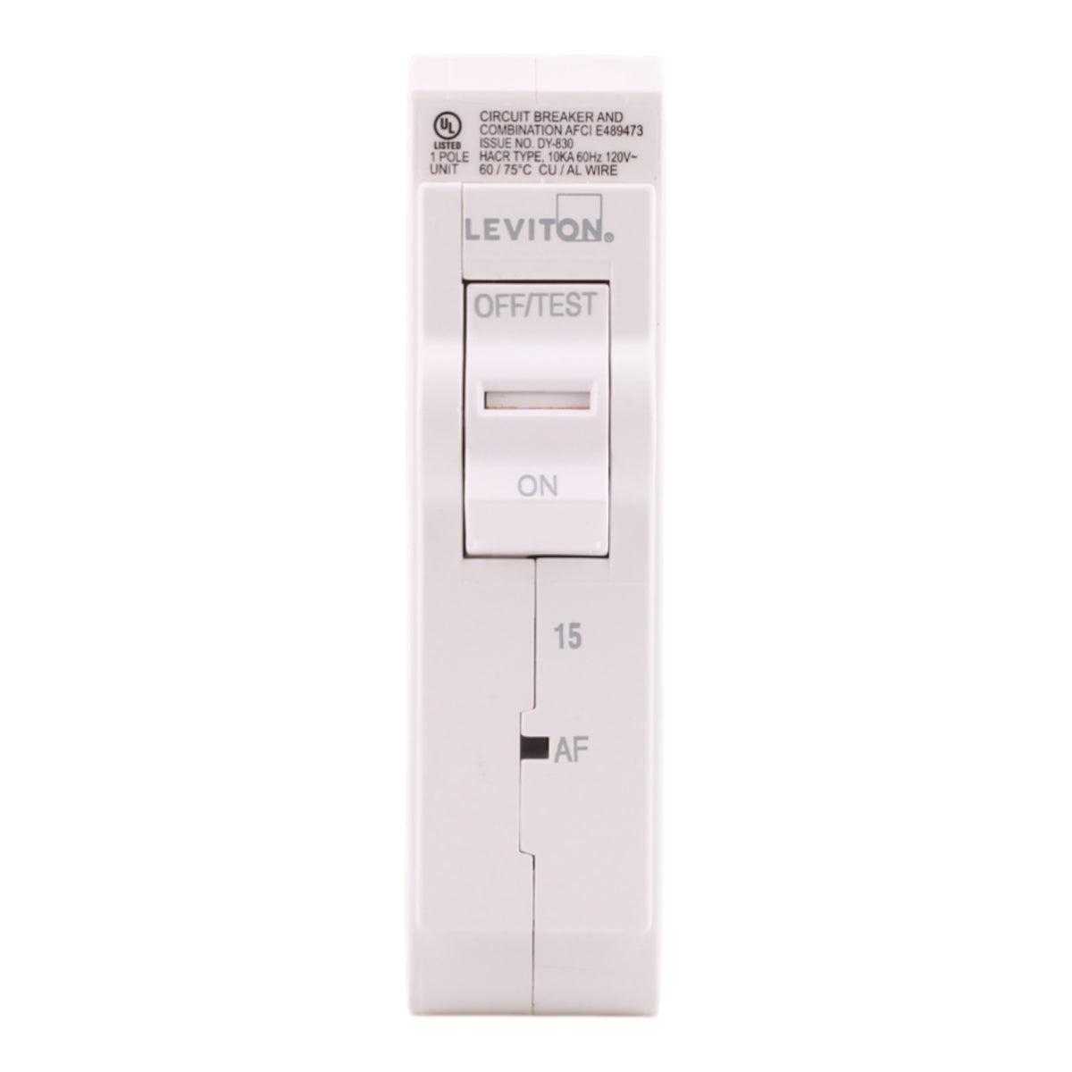 Leviton LB115-AF: 15 Amp 1-Pole AFCI Arc-Fault Circuit Interrupter breaker, 120V, 10kA, plug-on neutral, hydraulic magnetic, UL listed.