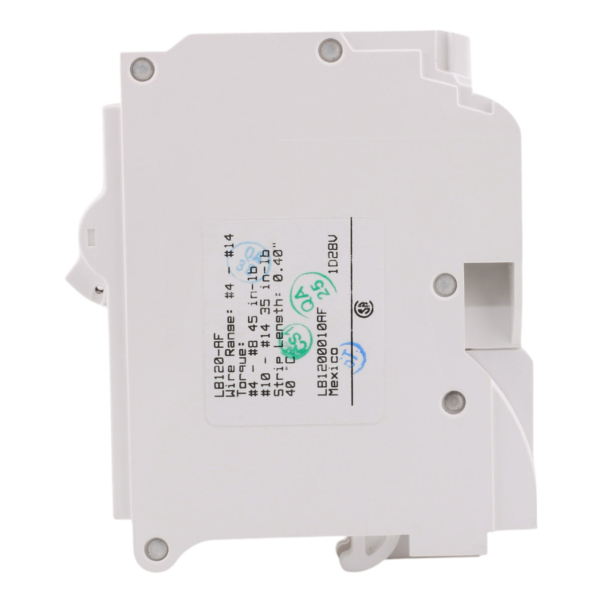 Leviton LB120-AFR: 20A 1P AFCI circuit breaker with hydraulic-magnetic trip technology, 120V, plug-on installation, wide operating temperature range (-40°C to 85°C), no re-rating needed."
