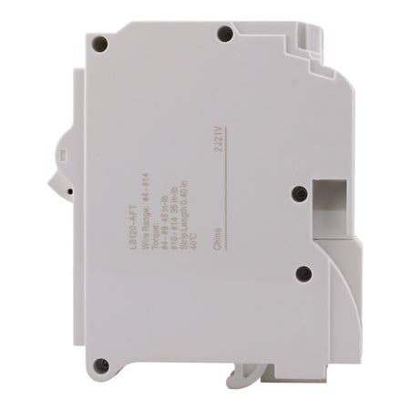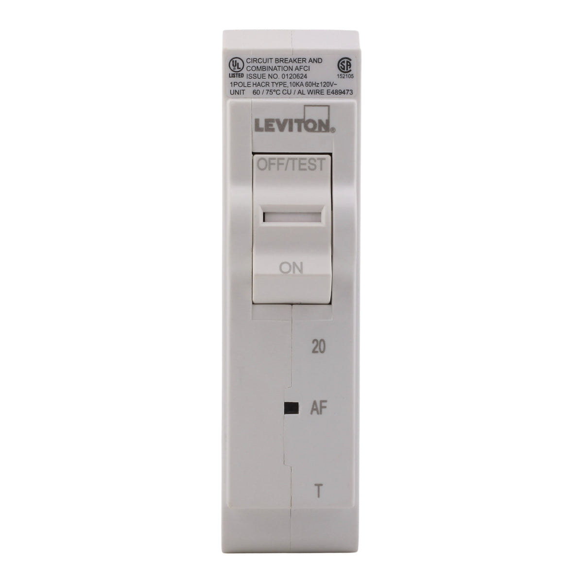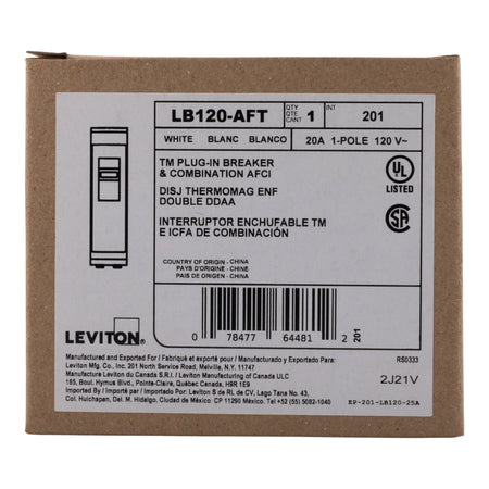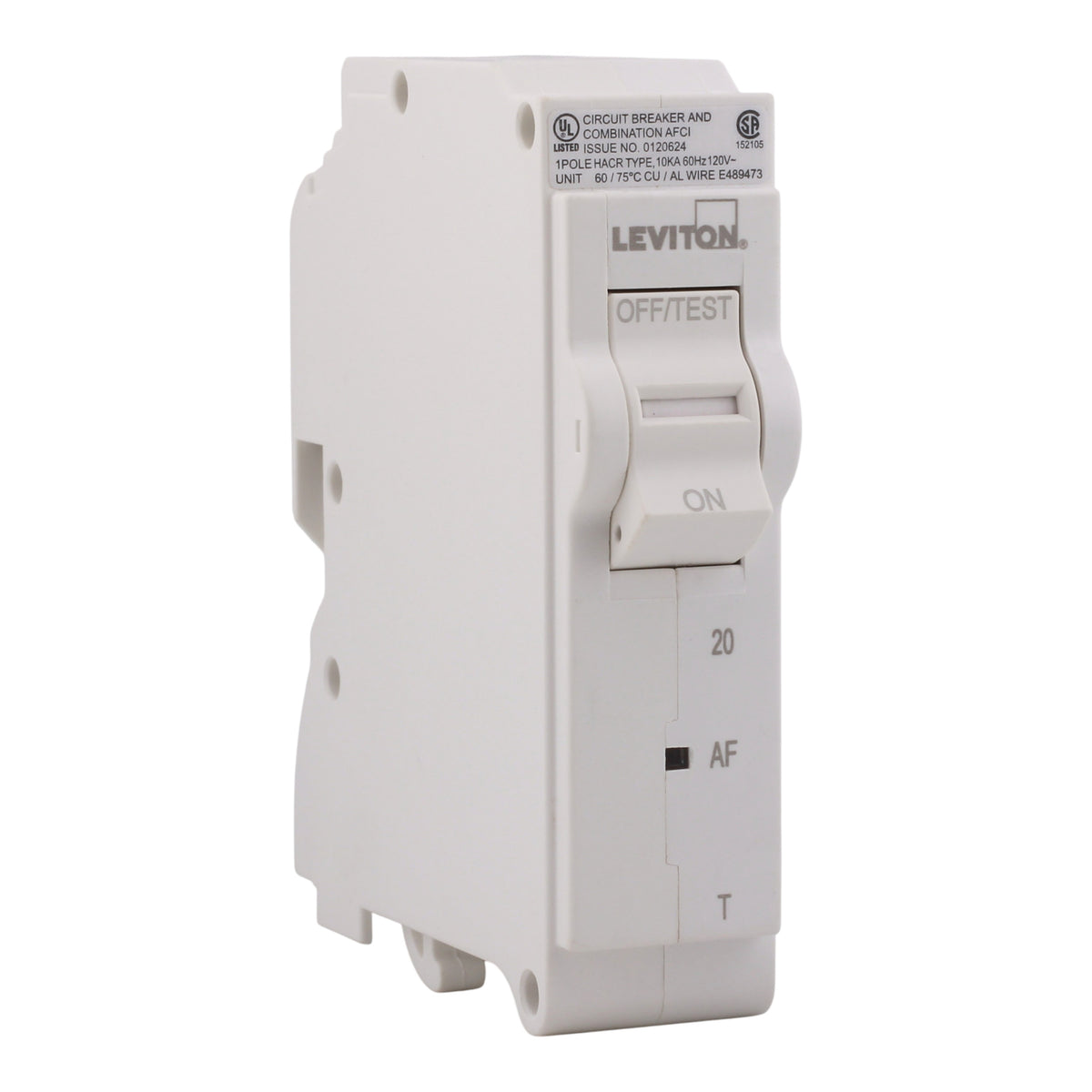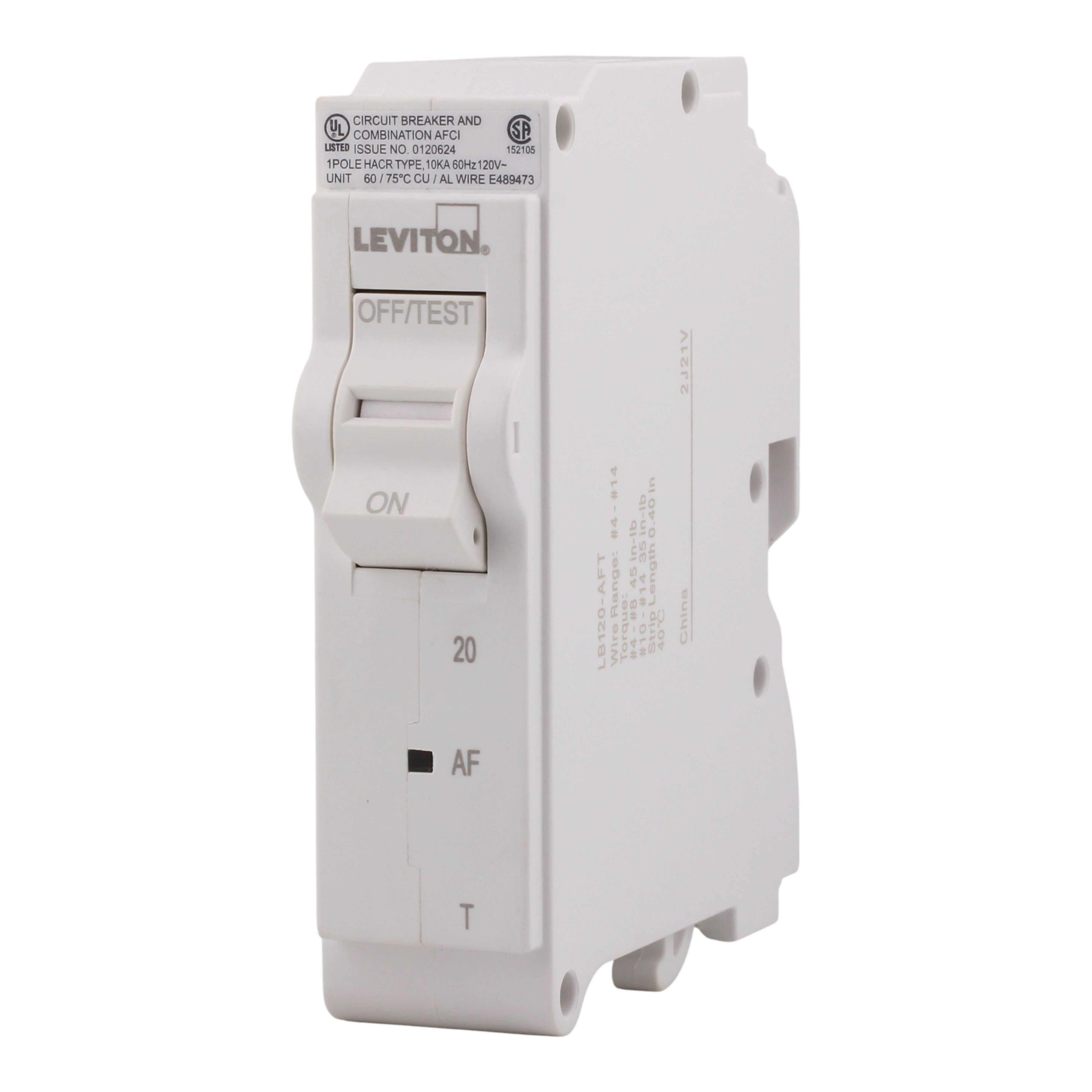 Leviton LB120-AFT: 20 Amp 1-Pole AFCI Arc-Fault Circuit Interrupter breaker, 120V, 10kA, plug-on neutral, UL listed, RoHS compliant.