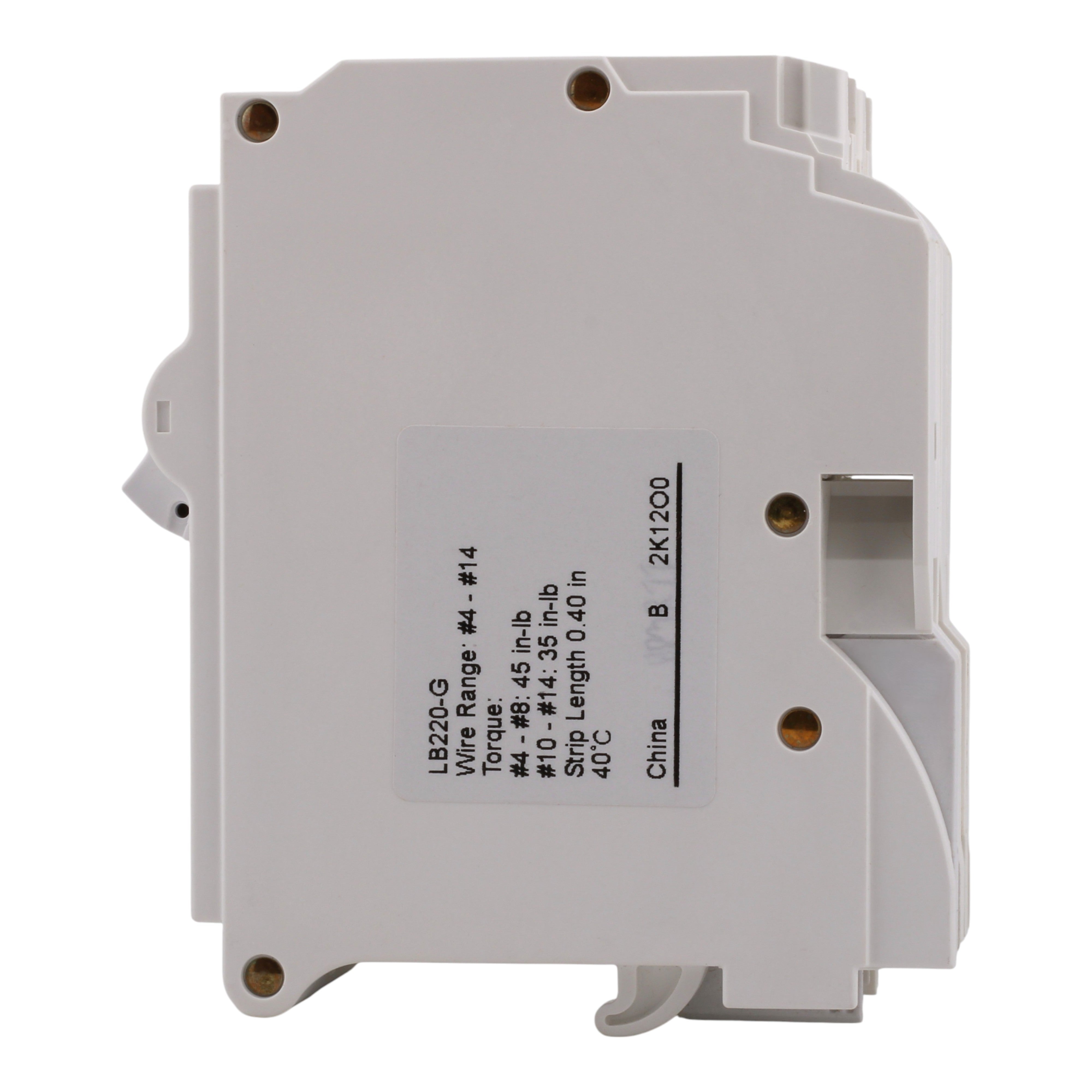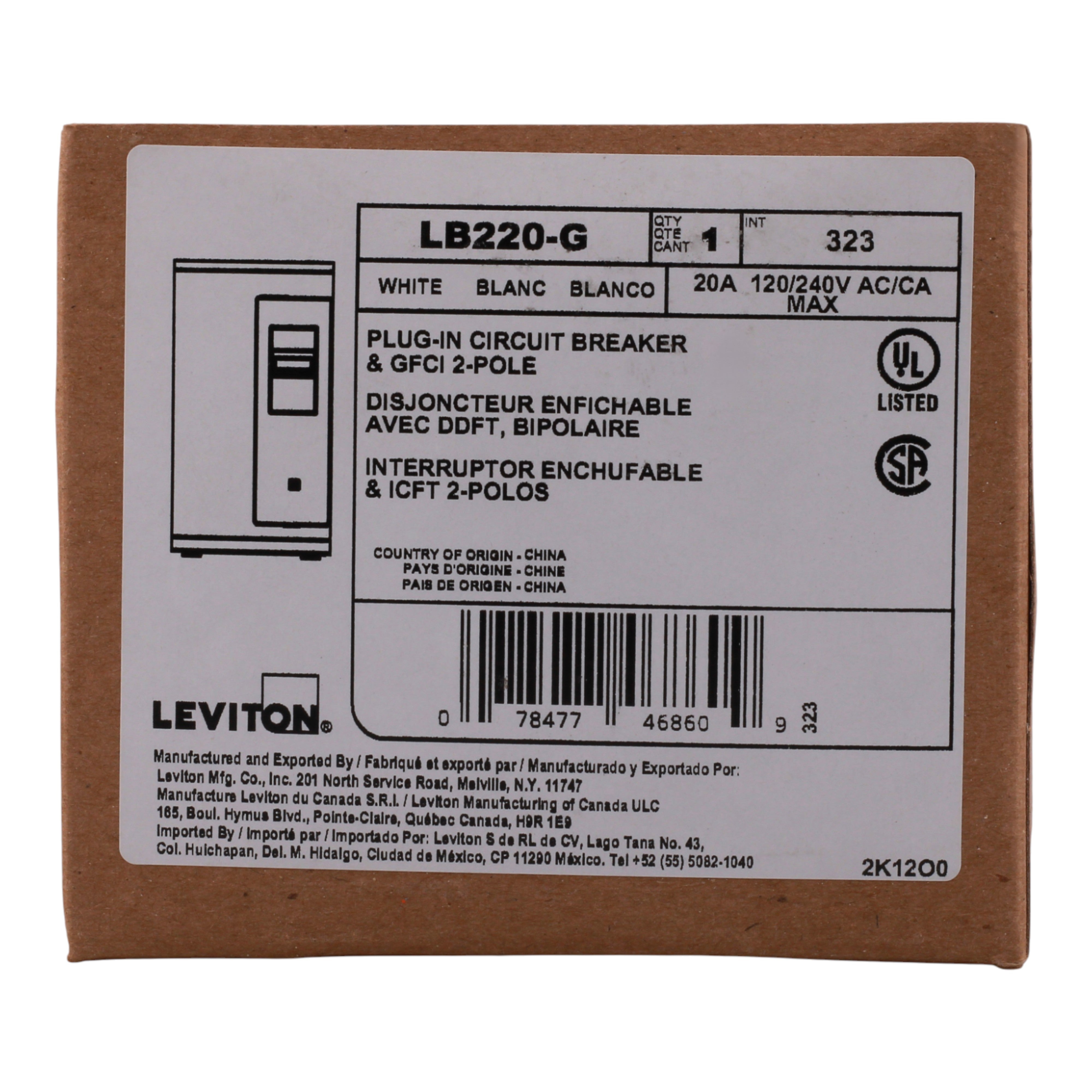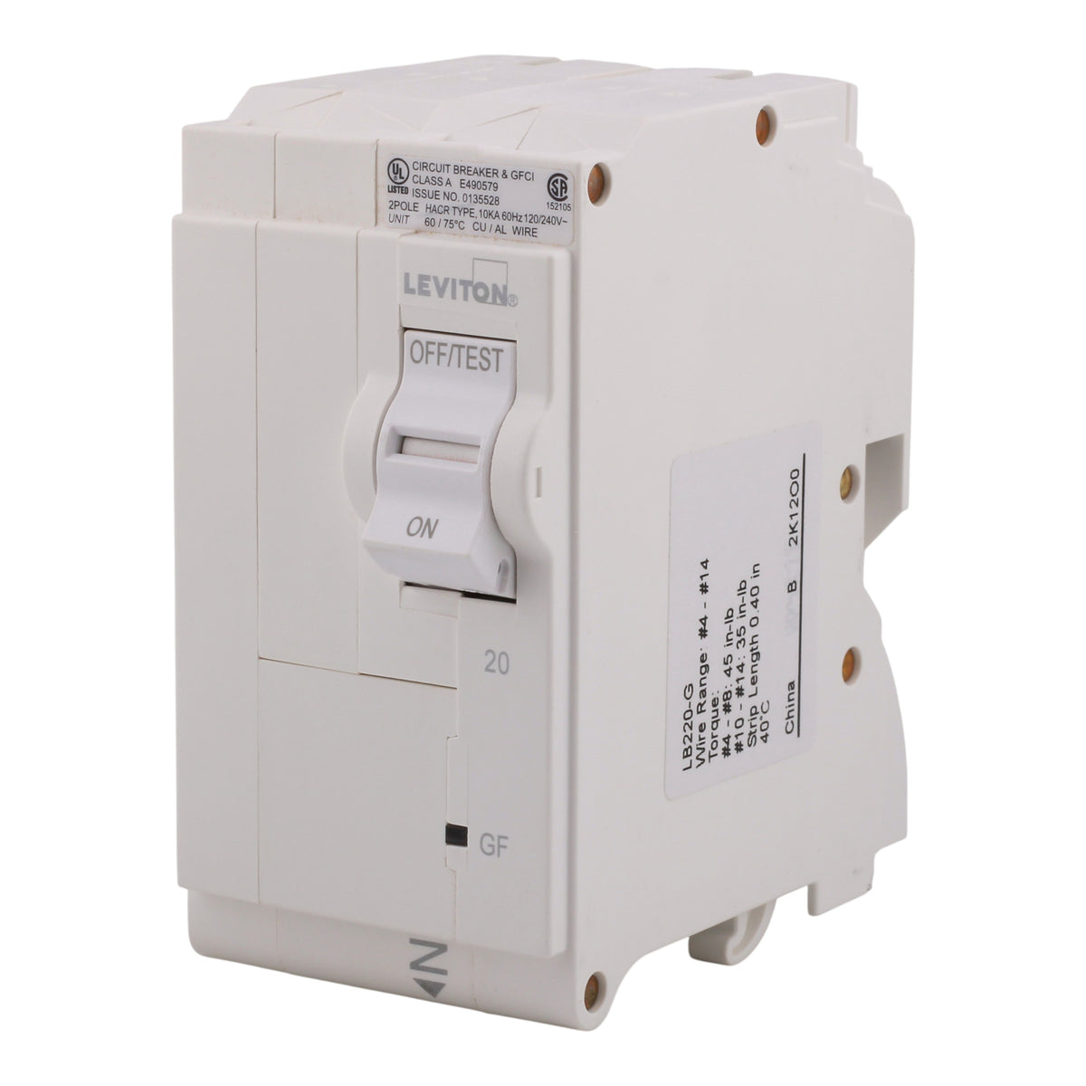 Leviton LB220-G: 20 Amp 2-Pole GFCI Ground-Fault Circuit Interrupter breaker, 120/208V or 120/240V, 10kA, plug-on neutral, 6mA trip sensitivity, UL listed.