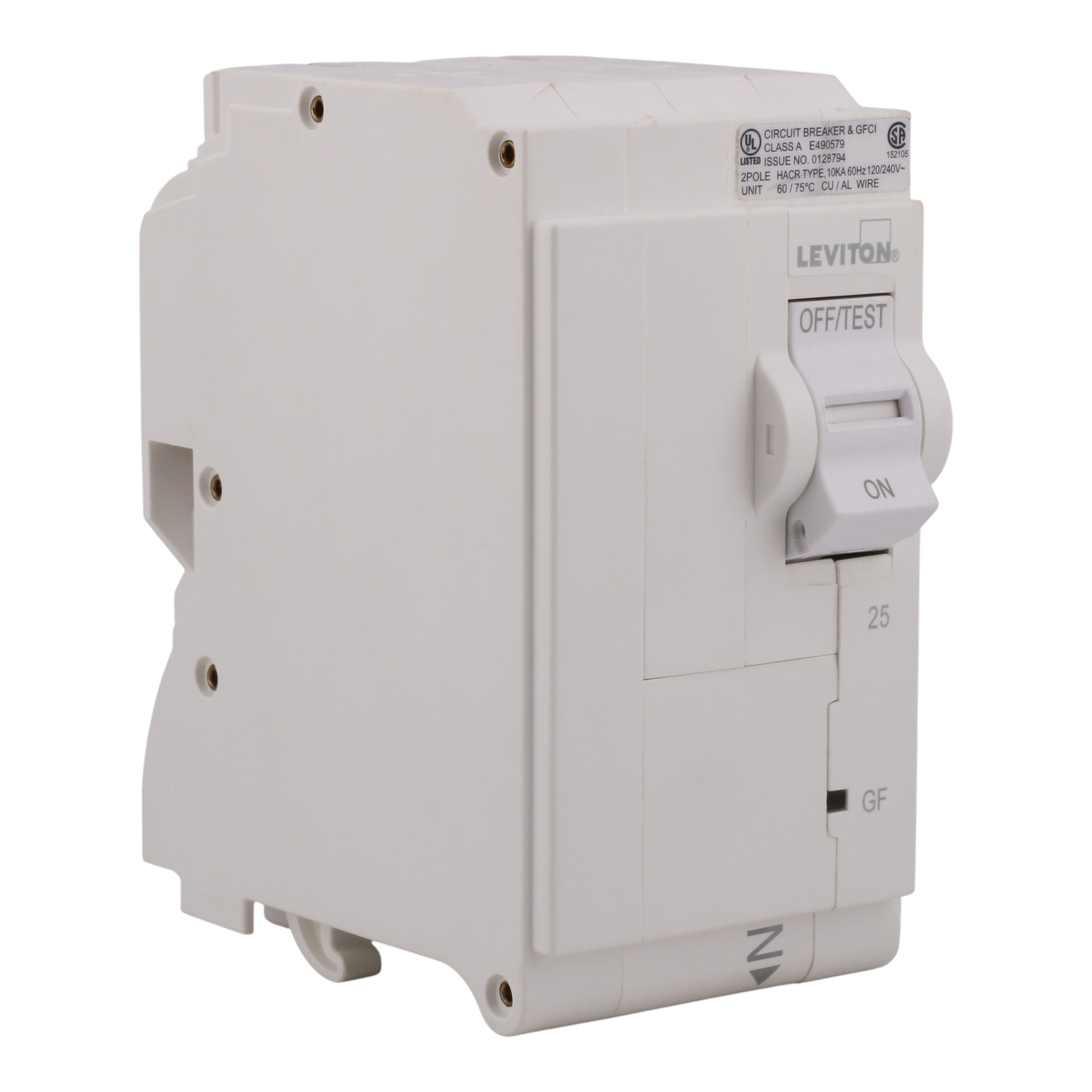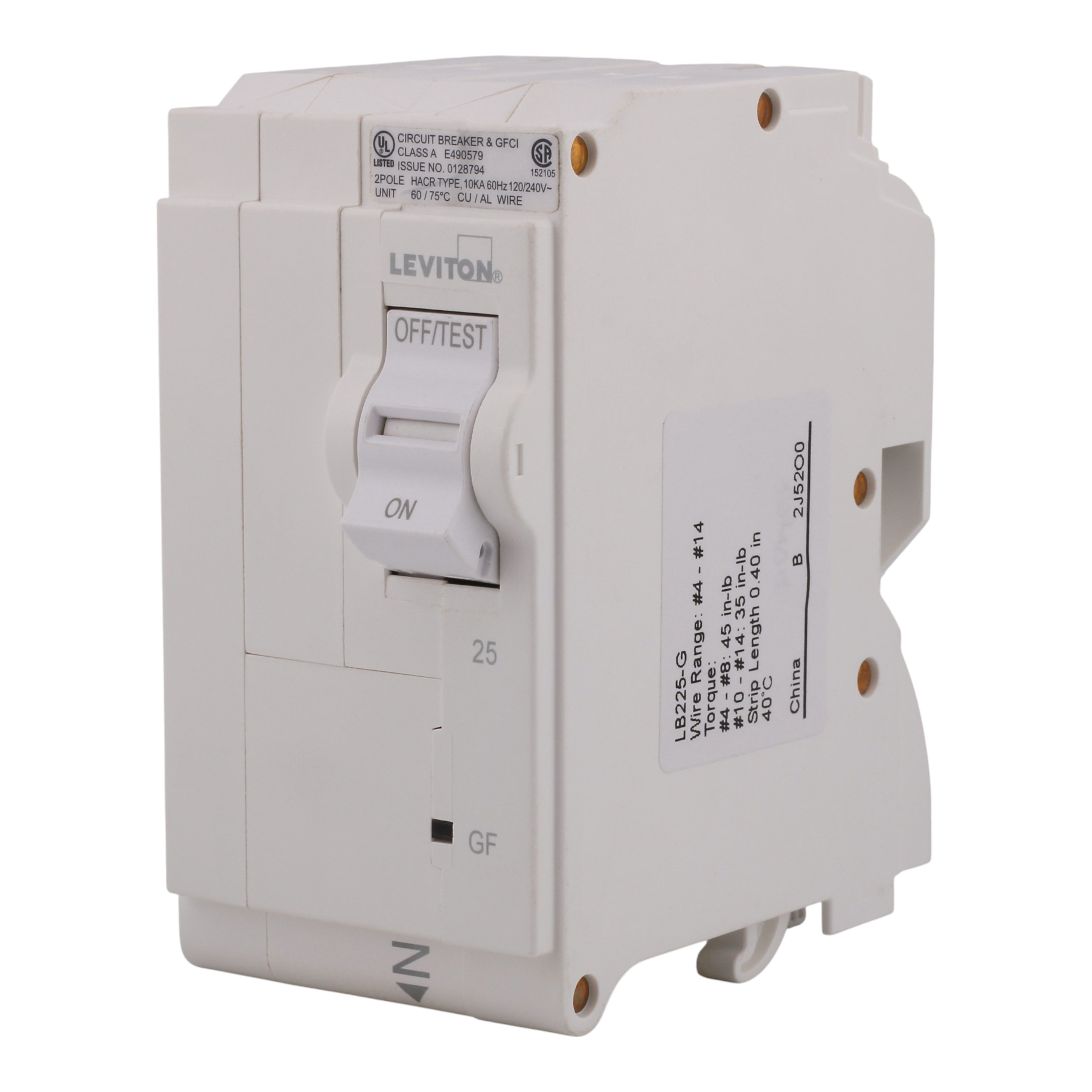Leviton LB225-G: 25 Amp 2-Pole GFCI Ground-Fault Circuit Interrupter breaker, 120/240V, 10kA, plug-on neutral, 6mA trip sensitivity, UL listed.