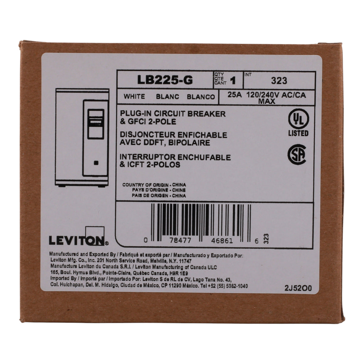 This Leviton LB225-G plug-on neutral circuit breaker provides reliable 25A, 2-pole GFCI protection for 120/240V circuits in Leviton loadcenters. With 6mA ground fault detection and hydraulic magnetic trip technology, it ensures enhanced safety and consistent performance for residential applications.