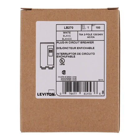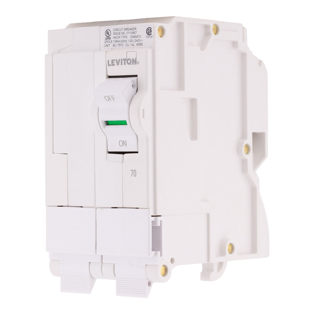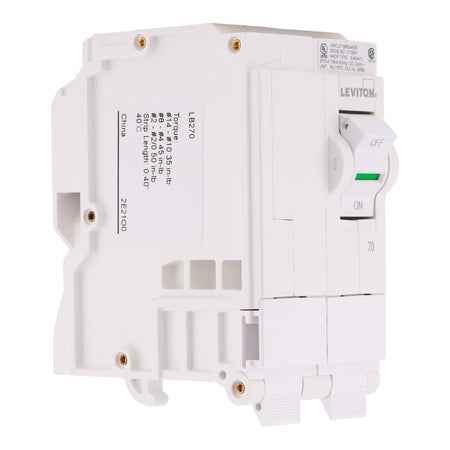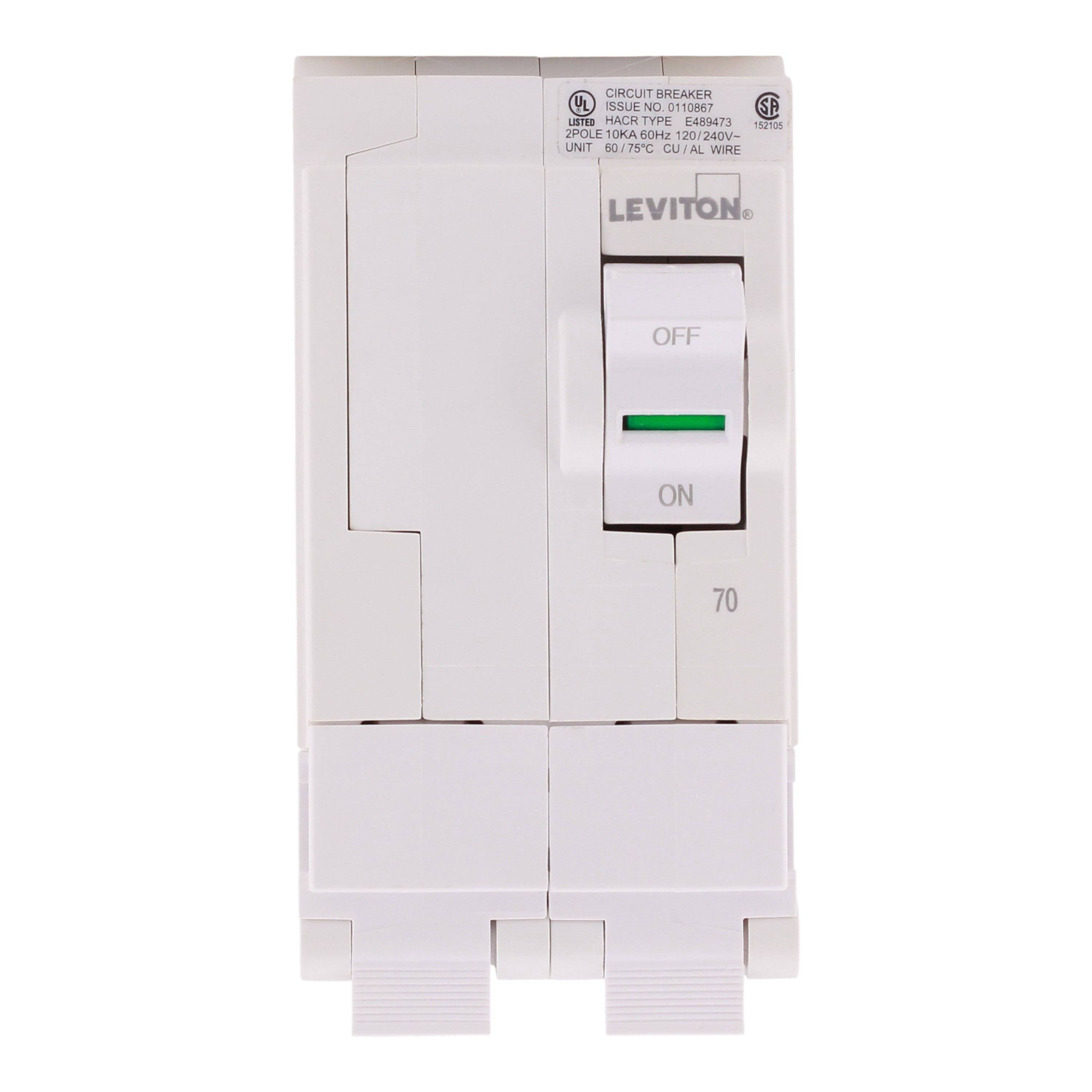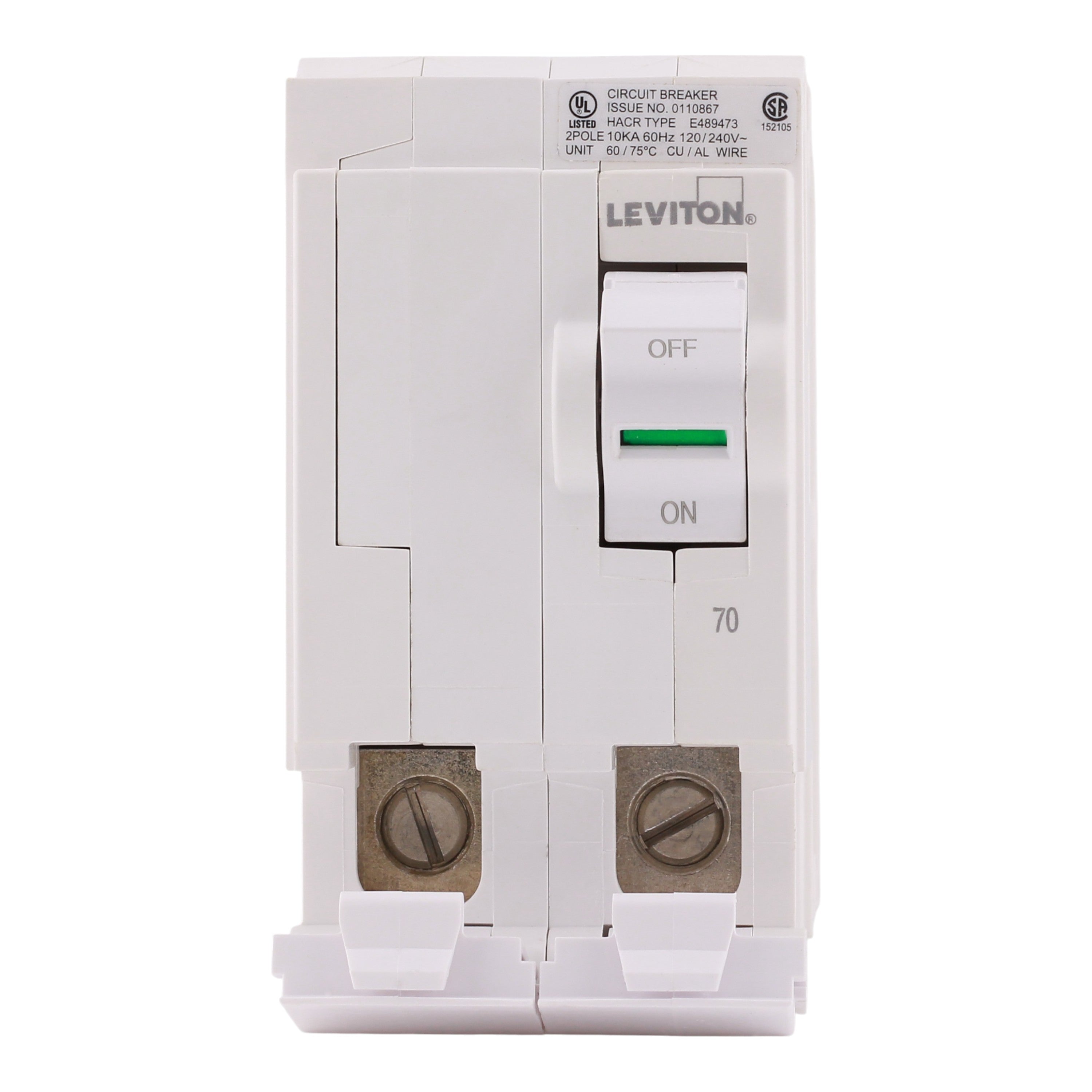 Leviton LB270: 70 Amp 2-Pole Standard Hydraulic-Magnetic Branch Circuit Breaker, 120/240V & 120/208V, 10kA Interrupt Rating, Plug-On Neutral, UL Listed