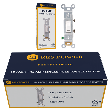 RES POWER RES15TS1W: 15 Amp 125 Volt Single-Pole Toggle Switch, cULus listed (E528137), white, indoor use.