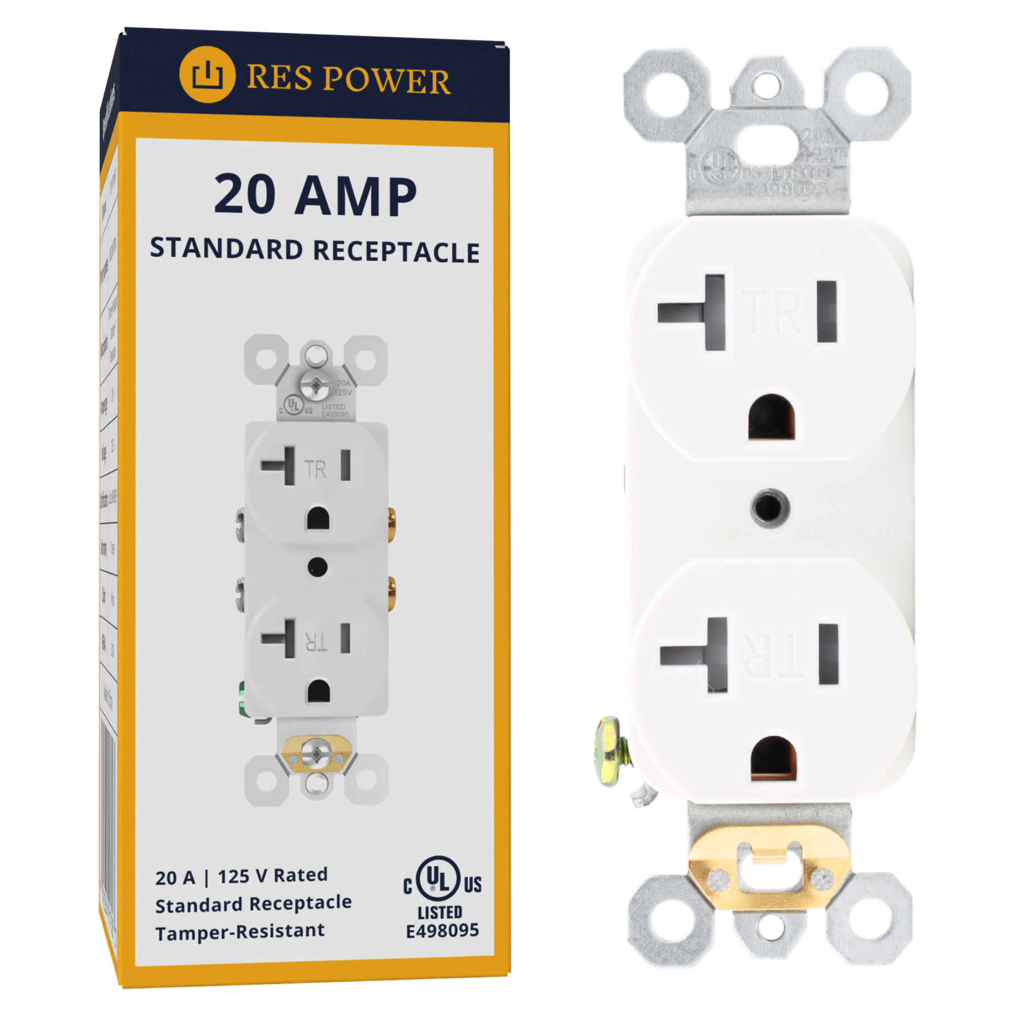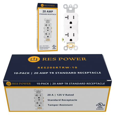 RES POWER RES20SRTRW: 20 Amp 125 Volt Tamper-Resistant Standard Duplex Receptacle, NEMA 5-20R, cULus listed (E498095), white, indoor use.