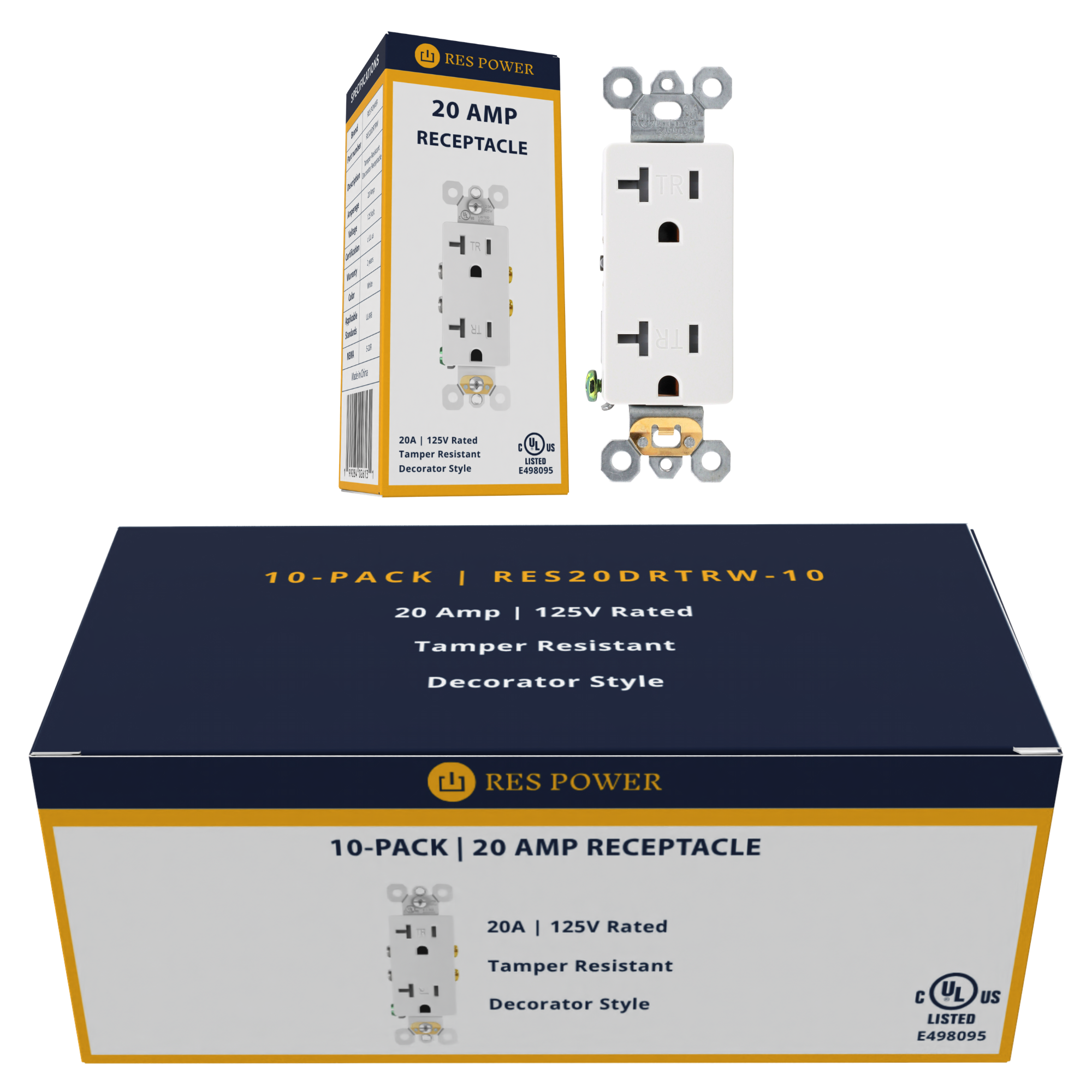 RES POWER RES20DRTRW: 20 Amp Tamper-Resistant Decorator Duplex Receptacle, 125V, NEMA 5-15R, screw terminal, 3-wire, white, cULus Listed.
